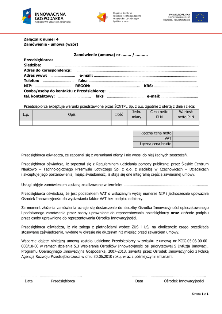 Załącznik numer 4 Zamówienie - umowa (wzór) Zamówienie (umowa) nr …….. / ………. Przedsiębiorca: …………………………………………………………………………………………………………………………… Siedziba: ………………………………………………………………………………………………………………………….. Adres do korespondencji: ………………………………………………………………………………………………………. Adres www: …………………… e-mail: ………………………………………………………………………………………… Telefon: ………………………... faks: …………………………………………………………………………………………….. NIP: …………………………….. REGON: ………………………………………... KRS: ……………………………………. Osoba/osoby do kontaktu z Przedsiębiorcą: ………………………………………………………..…………………. tel. kontaktowy: ………………………….. faks ……………………………… e-mail: ……………………………… Przedsiębiorca akceptuje warunki przedstawione przez ŚCNTPL Sp. z o.o. zgodnie z ofertą z dnia i zleca: Jedn. Cena netto Wartość L.p. Opis Ilość miary PLN netto PLN Łączna cena netto VAT Łączna cena brutto Przedsiębiorca oświadcza, że zapoznał się z warunkami oferty i nie wnosi do niej żadnych zastrzeżeń. Przedsiębiorca oświadcza, iż zapoznał się z Regulaminem udzielania pomocy publicznej przez Śląskie Centrum Naukowo – Technologicznego Przemysłu Lotniczego Sp. z o.o. z siedzibą w Czechowicach – Dziedzicach i akceptuje jego postanowienia, mając świadomość, iż stają się one integralną częścią zawieranej umowy. Usługi objęte zamówieniem zostaną zrealizowane w terminie: ………………………………………………………………..……… Przedsiębiorca oświadcza, że jest podatnikiem VAT o wskazanym wyżej numerze NIP i jednocześnie upoważnia Ośrodek Innowacyjności do wystawiania faktur VAT bez podpisu odbiorcy. Za moment złożenia zamówienia uznaje się dostarczenie do siedziby Ośrodka Innowacyjności opieczętowanego i podpisanego zamówienia przez osoby uprawnione do reprezentowania przedsiębiorcy oraz złożenie podpisu przez osoby uprawnione do reprezentowania Ośrodka Innowacyjności. Przedsiębiorca oświadcza, iż nie zalega z płatnościami wobec ZUS i US, na okoliczność czego przedkłada stosowane zaświadczenia, wydane w okresie nie dłuższym niż miesiąc przed zawarciem umowy. Wsparcie objęte niniejszą umową zostało udzielone Przedsiębiorcy w związku z umową nr POIG.05.03.00-00008/10-00 w ramach działania 5.3 Wspieranie Ośrodków Innowacyjności osi priorytetowej 5 Dyfuzja Innowacji, Programu Operacyjnego Innowacyjna Gospodarka, 2007-2013, zawartą przez Ośrodek Innowacyjności z Polską Agencją Rozwoju Przedsiębiorczości w dniu 30.06.2010 roku, wraz z późniejszymi zmianami. …………… ………………………………….. Data Przedsiębiorca …………… ………………….………………………….. Data Ośrodek Innowacyjności Strona 1 z 1
