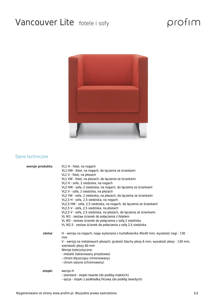Vancouver Lite fotele i sofy Dane techniczne wersje produktu VL1 H - fotel, na nogach VL1 HW - fotel, na nogach, do łączenia ze ściankami VL1 V - fotel, na płozach VL1 VW - fotel, na płozach, do łączenia ze ściankami VL2 H - sofa, 2 siedziska, na nogach VL2 HW - sofa, 2 siedziska, na nogach, do łączenia ze ściankami VL2 V - sofa, 2 siedziska, na płozach VL2 VW - sofa, 2 siedziska, na płozach, do łączenia ze ściankami VL2,5 H - sofa, 2,5 siedziska, na nogach VL2,5 HW - sofa, 2,5 siedziska, na nogach, do łączenia ze ściankami VL2,5 V - sofa, 2,5 siedziska, na płozach VL2,5 V - sofa, 2,5 siedziska, na płozach, do łączenia ze ściankami VL W1 - zestaw ścianek do połączenia z fotelem VL W2 - zestaw ścianek do połączenia z sofą 2 siedziska VL W2,5 - zestaw ścianek do połaczenia z sofą 2,5 siedziska stelaż H – wersja na nogach; noga wykonana z kształtownika 40x40 mm; wysokość nogi - 130 mm V – wersja na metalowych płozach; grubość blachy płozy 6 mm; wysokość płozy - 130 mm, szerokość płozy 60 mm Wersje kolorystyczne: - metalik (lakierowany proszkowo) - chrom błyszczący (chromowany) - chrom satyna (chromowany) stopki wersja H - standard - stopki twarde (do podłóg miękkich) - opcja - stopki z podkładką filcową (do podłóg twardych) Wygenerowano ze strony www.profim.pl. Wszystkie prawa zastrzeżone. 1/2 wersja V - standard - podkładki filcowe do podklejenia siedzisko oparcie / ścianka waga netto Pianka cięta - gęstość 40 kg/m3. oparcie - pianka cięta - gęstość 25 kg/m3 ścianka - pianka cięta - gęstość 35 kg/m3 VL1 H/HW - 23,5 kg VL1 V/VW - 27,5 kg VL2 H/HW - 32,0 kg VL2 V/VW - 36,0 kg VL2,5 H/HW - 36,0 kg VL2,5 V/VW - 40,0 kg VL W1 – 18,0 kg VL W2 – 23,5 kg VL W2,5 – 25,0 kg waga brutto VL1 H/HW - 26,5 kg VL1 V/VW - 30,5 kg VL2 H/HW - 38,0 kg VL2 V/VW - 42,0 kg VL2,5 H/HW - 42,0 kg VL2,5 V/VW - 46,0 kg VL W1 – 20,0 kg VL W2 – 28,0 kg VL W2,5 – 29,5 kg dodatkowe Istnieje możliwość doboru różnych kolorów tapicerki wewnętrznej i zewnętrznej części ścianki w obrębie tej samej tkaniny. Wymiary Wygenerowano ze strony www.profim.pl. Wszystkie prawa zastrzeżone. 2/2