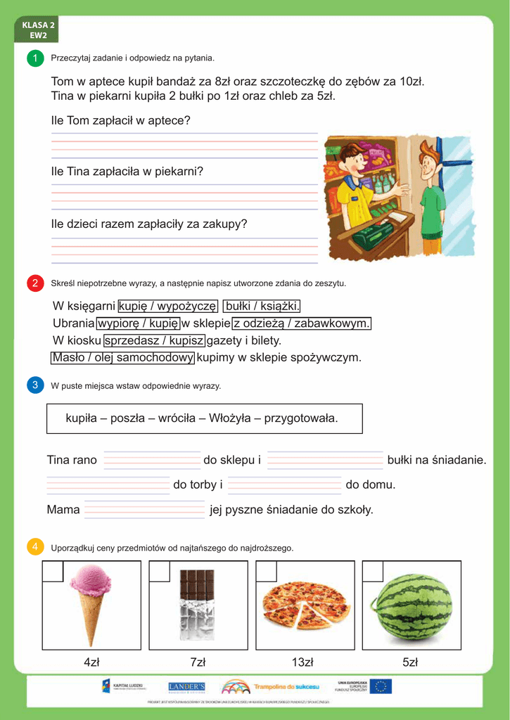 KLASA 2 EW2 1 Przeczytaj zadanie i odpowiedz na pytania. Tom w aptece kupił bandaż za 8zł oraz szczoteczkę do zębów za 10zł. Tina w piekarni kupiła 2 bułki po 1zł oraz chleb za 5zł. Ile Tom zapłacił w aptece? Ile Tina zapłaciła w piekarni? Ile dzieci razem zapłaciły za zakupy? 2 Skreśl niepotrzebne wyrazy, a następnie napisz utworzone zdania do zeszytu. W księgarni kupię / wypożyczę bułki / książki. Ubrania wypiorę / kupię w sklepie z odzieżą / zabawkowym. W kiosku sprzedasz / kupisz gazety i bilety. Masło / olej samochodowy kupimy w sklepie spożywczym. 3 W puste miejsca wstaw odpowiednie wyrazy. kupiła – poszła – wróciła – Włożyła – przygotowała. Tina rano do sklepu i bułki na śniadanie. do torby i Mama 4 do domu. jej pyszne śniadanie do szkoły. Uporządkuj ceny przedmiotów od najtańszego do najdroższego. 4zł 7zł 13zł 5zł