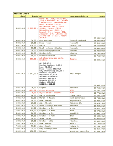 Marzec 2014 data 3-03-2014 kwota cel nadawca/odbiorca Klara - 81,- , koty z lokalu-347,, koty P. Marzenki - 80,- , Filutek - hotelik - 65,- , Serce i rozum 464,- , Romusia - 305,95 , Bakster pies - 146,- , Filip -2 869,26 zł 183,06 , Irma - 175,98 , Sokolnickie koty - 283,- , Pawełek - 59,- , Myszek - 202,, Rosanów - 249,- , Nellek - 85,, karma wet. - 143,27 , Razem 2869,26 saldo 28 441,90 zł 3-03-2014 50,00 zł Cele statutowe Dorota Z. Białystok 28 491,90 zł 3-03-2014 20,00 zł Serce i rozum Joanna N. 28 511,90 zł Tatiana Cz-G. 28 661,90 zł 3-02-2014 150,00 zł Marlon 3-03-2014 30,00 zł Nelek – adopcja wirtualna Joanna L. 28 691,90 zł 3-03-2014 30,00 zł Grubcio–adopcja wirtual Joanna L. 28 721,90 zł 3-03-2014 20,00 zł Kotylion-b.Sis edyszka 28 741,90 zł kawon5 28 751,90 zł 3-03-2014 3-03-2014 4-03-2014 4-03-2014 4-03-2014 10,00 zł Romusia-b.duszek Art. dla zwierząt pod opieką -357,56 zł Kotyliona Ali: 242,00 zł Fundusz budkowy: 4,00 zł Irma: 40,00 zł Serce i rozum: 230,00 zł koty z Pomorskiej: 212,00 zł Pawełek: 152,00 zł 1 542,00 zł Pogorzelcy: 12,00 zł Sokolnickie: 40,00 zł Edmund: 342,00 zł Romusia: 132,00 zł Ogólne: 136,00 zł RAZEM: 1542,00 25,00 zł Kotylion -181,09 zł Czynsz kociarnia Zooplus 28 394,34 zł PayU Allegro 29 936,34 zł Monika D. 29 961,34 zł ADM 29 780,25 zł 4-03-2014 -9,00 zł Wywóz śmieci – kociarnia ADM 29 771,25 zł 4-03-2014 16,00 zł Marlon – b.felusia czarno czarni 29 787,25 zł 4-02-2014 12,00 zł Marlon – b.felusia sarah demornique 29 799,25 zł 5-03-2014 10,00 zł Alex i Albercik Magdalena D. 29 809,25 zł 5-03-2014 20,00 zł Alex i Albercik Katarzyna Ch. 29 829,25 zł 5-03-2014 30,00 zł Wituś – adopcja wirtualna Monika H. 29 859,25 zł 5-03-2014 11,00 zł Kotylion – b. Sis brynia 29 870,25 zł 5-03-2014 100,00 zł Kotylion – b. dilah dilah 29 970,25 zł 5-03-2014 70,00 zł Kotylion – b. Sis Kasiek252 30 040,25 zł 5-03-2014 10,00 zł Kotylion – b. MaPi dilah 30 050,25 zł 6-03-2014 10,70 zł Serce i rozum Joanna N. 30 060,95 zł 6-03-2014 20,00 zł Kotylion – b.Sis Miszelina 30 080,95 zł Rafał K. 30 180,95 zł 53,24 zł Alex i Alercik Justyna K. 30 234,19 zł 35,00 zł koty starszego pana Paulina M. 30 269,19 zł anonimowy darczyńca 30 369,19 zł 7-03-2014 100,00 zł Alex i Albercik 7-03-2014 7-03-2014 10-03-2014 100,00 zł Edmund 10-03-2014 100,00 zł Koty p. Marzenki anonimowy darczyńca 30 469,19 zł 10-03-2014 100,00 zł Serce i rozum anonimowy darczyńca 30 569,19 zł 10-03-2014 26,00 zł Kotylion – b.Sis kfiatek1983 30 595,19 zł 10-03-2014 10,00 zł Koty Joli Dworcowej Ewa M. 30 605,19 zł 10-03-2014 Janusz Z. Kalina K. 30 665,19 zł 10-03-2014 -196,20 zł Karma dla Kajtusi Zooplus 30 468,99 zł 10-03-2014 -222,52 zł Karma dla kotów w dt Zooplus 30 246,47 zł 10-03-2014 -332,00 zł Karma dla kotów w lecznicy Zooplus 29 914,47 zł 10-03-2014 -140,27 zł Za energię w lokalu Kotyliona PGE 29 774,20 zł 10-03-2014 60,00 zł Czarni Bracia z Sokolnik -45,40 zł Wysyłki 29 728,80 zł 11-03-2014 38,00 zł Darowizna Grubcio – b.sis Joanna N. 29 766,80 zł 11-03-2014 50,00 zł Koty z Sokolnik-b.andorka ciotka59 29 816,80 zł 11-03-2014 32,00 zł Darowizna Marlon – b.sis Joanna N. 29 848,80 zł 11-03-2014 25,00 zł Kotylion -b.duszek bluette 29 873,80 zł 12-03-2014 12,00 zł Darowizna Marlon – b.sis Joanna N. 29 885,80 zł 12-03-2014 15,00 zł Romusia – b.duszek Anetta K. 29 900,80 zł 12-03-2014 32,00 zł Kotylion – b.Sis Kasiek252 29 932,80 zł 12-03-2014 50,00 zł Marlon – b.ruru MAXYMA 29 982,80 zł 13-03-2014 66,00 zł Kotylion – b.duszek MAXYMA 30 048,80 zł 13-03-2014 17,50 zł Koty z Sokolnik-b.andorka kathreen1979 30 066,30 zł 13-03-2014 15,00 zł Darowizna Marlon – b.sis Joanna N. 30 081,30 zł 13-03-2014 -181,09 zł Czynsz kociarnia – marzec ADM 29 900,21 zł 13-03-2014 -9,00 zł Wywóz odpadów – kociarnia ADM 29 891,21 zł 13-03-2014 18,00 zł Koty z Sokolnik-b.andorka Izzi 29 909,21 zł 14-03-2014 20,00 zł Torba czarna Angelika R. W-wa 29 929,21 zł kathreen1979 29 931,71 zł 14-03-2014 2,50 zł Koty z Sokolnik-b.andorka 14-03-2014 20,00 zł Kotylion-b.duszek-kolczyki dilah 29 951,71 zł 14-03-2014 37,00 zł Kotylion – darowizna Katarzyna C. 29 988,71 zł 17-03-2014 30,00 zł Bartuś -adopcja wirtualna Joanna N. 30 018,71 zł 17-03-2014 50,00 zł Kotylion – darowizna Agnieszka B. 30 068,71 zł 17-03-2014 25,00 zł Kotylion – darowizna Elżbieta S. Łódź 30 093,71 zł 17-03-2014 45,00 zł Kotylion – darowizna agiag 30 138,71 zł 17-03-2014 10,00 zł Kotylion – b.sis – brelok niutek 30 148,71 zł 17-03-2014 40,00 zł Kotylion – darowizna agiag 30 188,71 zł 17-03-2014 15,00 zł Kotylion – b.sis – zabawki MaPi 30 203,71 zł 18-03-2014 10,00 zł Darowizna – Marlon Joanna N. 30 213,71 zł 18-03-2014 200,00 zł Kotylion – darowizna Joanna Z. Łódź 30 413,71 zł 18-03-2014 60,00 zł Kotylion – b.Sis Kasiek252 30 473,71 zł 19-03-2014 31,00 zł Kotylion – b.Sis-zabawki Sroka7 30 504,71 zł Joanna N. 30 531,71 zł 19-03-2014 19-03-2014 19-03-2014 19-03-2014 20-03-2014 27,00 zł Kotylion-darowizna – Marlon Karma sucha dla kotów w -705,08 zł schronisku 46,50 zł Koty z Sokolnik-b.andorka 10,00 zł Kotylion – b. Sis 6,00 zł Kotylion – b.duszek 21-03-2014 40,00 zł Koty P. Ireny 23-03-2014 -18,50 zł Wysyłki fantów Zooplus 29 826,63 zł Jek 29 873,13 zł felusia 29 883,13 zł XS-kaa 29 889,13 zł Magdalena M. 29 929,13 zł 29 910,63 zł 23-03-2014 23-03-2014 24-03-2014 25-03-2014 -130,72 zł Karma dla kotów p.Marzenki 100,00 zł Kotylion -353,96 zł Budki tekstylne dla kotów 50,00 zł Kotylion Zooplus 29 779,91 zł Kamila L-N 29 879,91 zł Zooplus 29 525,95 zł Katarzyna P. 29 575,95 zł 25-03-2014 -9,50 zł Wysyłki fantów 26-03-2014 20,00 zł Kotylion Kasiek252 29 586,45 zł 27-03-2017 50,00 zł Darowizna Kotylion Anetta K. 29 636,45 zł 31-03-2014 20,00 zł Darowizna Kotylion Dorota Sz.J. 29 656,45 zł 31-03-2014 300,00