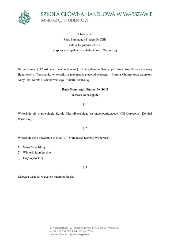 Uchwała nr 8 Rady Samorządu Studentów SGH z dnia 14 grudnia 2015 r. w sprawie uzupełnienia składu Komisji Wyborczej Na podstawie § 17 ust. 4 i z zastrzeżeniem § 30 Regulaminu Samorządu Studentów Szkoły Głównej Handlowej w Warszawie, w związku z rezygnacją przewodniczącego – Karola Choima oraz członków Anny Flis, Karola Niesiołkowskiego i Natalii Prosińskiej, Rada Samorządu Studentów SGH uchwala co następuje §1 Wnioskuje się o powołanie Karola Niesiołkowskiego na przewodniczącego VIII Okręgowej Komisji Wyborczej. §2 Wnioskuje się o powołanie w skład VIII Okręgowej Komisji Wyborczej: 1) Marii Modelskiej, 2) Wiktorii Szymborskiej, 3) Ewy Wysockiej. §3 Uchwała wchodzi w życie z dniem podjęcia. Uchwała nr 9 Rady Samorządu Studentów SGH z dnia 14 grudnia 2015 r. w sprawie zmian w Regulaminie Samorządu Studentów Szkoły Głównej Handlowej w Warszawie Na podstawie § 17 ust. 10 i z zastrzeżeniem § 34 Regulaminu Samorządu Studentów Szkoły Głównej Handlowej w Warszawie, Rada Samorządu Studentów SGH uchwala co następuje §1 W Regulaminie Samorządu Studentów Szkoły Głównej Handlowej w Warszawie zmienionym uchwałą z dnia 16 listopada 2015, zwanym dalej Regulaminem, wprowadza się następujące zmiany: 1) Paragraf 1 ust. 2 otrzymuje brzmienie: „Samorząd działa poprzez swoje organy i przedstawicieli w organach Uczelni.” 2) Paragraf 2 otrzymuje brzmienie: „Samorząd w szczególności: 1) reprezentuje interesy studentów i broni ich praw; 2) działa na rzecz integracji środowiska studentów SGH oraz wspiera i realizuje inicjatywy studenckie; 3) prowadzi na terenie Uczelni działalność w zakresie spraw studenckich, w tym socjalno‐ bytowych i kulturalnych studentów Uczelni; 4) ułatwia studentom korzystania z prawa do zrzeszania się; 5) uczestniczy w podejmowaniu decyzji w zakresie spraw Uczelni oraz realizacji zadań Uczelni; 6) uczestniczy, przez swoich przedstawicieli, w pracach organów kolegialnych SGH; 7) wyraża opinie studentów w sprawach związanych z procesem kształcenia i wychowania w szkołach wyższych oraz w sprawach wymagających wypowiedzi środowiska studenckiego; 8) prowadzi własną działalność projektową oraz nadzór nad działalnością projektową innych organizacji w zakresie działalności Funduszu Ruchu Studenckiego i systemu oceny projektów”. 3) Paragraf 4 otrzymuje brzmienie: „1. Organy Samorządu i przedstawiciele Samorządu w organach Uczelni są wyłącznymi reprezentantami ogółu studentów SGH. 2. Organami kolegialnymi Samorządu są: a. Rada Samorządu, zwana dalej „Radą”; b. kolegium senatorów; c. Zarząd Samorządu, zwany dalej „Zarządem”; d. Komisje Samorządu, zwane dalej „Komisjami”; e. Rada Gabinetowa Samorządu, zwana dalej „Radą Gabinetową”; f. Sąd Koleżeński, zwany dalej „Sądem”; g. Odwoławczy Sąd Koleżeński, zwany dalej „Sądem Odwoławczym”; h. Rada Kół i Organizacji Studenckich, zwana dalej „Radą Kół”, i jej organy; i. VIII Okręgowa Komisja Wyborcza, zwana dalej „Komisją Wyborczą”, i jej organy. 3. Organami jednoosobowymi Samorządu są: 1) Przewodniczący Samorządu Studentów, zwany dalej „Przewodniczącym”; 2) Rzecznik Praw Studenta, zwany dalej „Rzecznikiem” 3) Pełnomocnicy Samorządu, zwani dalej „Pełnomocnikami”.” 4) Paragraf 6 otrzymuje brzmienie: „1. Członkostwo lub pełnienie funkcji w organie Samorządu lub pełnienie funkcji przedstawiciela Samorządu w organach Uczelni ustaje w przypadku: 1) złożenia pisemnej rezygnacji Przewodniczącemu Komisji Wyborczej; 2) odwołania; 3) utraty praw studenta; 4) zawieszenia w prawach studenta na podstawie prawomocnego orzeczenia komisji dyscyplinarnej; 5) skreślenia z listy studentów; 6) skazania prawomocnym wyrokiem sądu na karę pozbawienia praw publicznych; 7) upływu kadencji. 2. Przewodniczący Komisji Wyborczej na wniosek Przewodniczącego lub z własnej inicjatywy stwierdza wygaśnięcie mandatu uzyskanego w wyborach, o których mowa w § 82 ust. 1 pkt. 1-4, w przypadku zaistnienia okoliczności, o których mowa w ust. 1, o czym informuje niezwłocznie Przewodniczącego i organ, którego członka mandat wygasł.” 5) Paragraf 7 otrzymuje brzmienie: „Nie można być jednocześnie członkiem Komisji Wyborczej, Sądu i Sądu Odwoławczego oraz łączyć członkostwa w tych organach z pełnieniem funkcji lub członkostwem w innym organie Samorządu i ze sprawowaniem mandatu radnego.” 6) W paragrafie 9 dodaje się ust. 4 w brzmieniu: „Samorząd prowadzi stronę internetową, portale internetowe i internetowe kanały komunikacji Samorządu na zasadach określonych przez Zarząd.” 7) W paragrafie 9 dodaje się ust. 5 w brzmieniu: „Uchwały organów kolegialnych Samorządu i zarządzenia organów jednoosobowych Samorządu oraz przewodniczących organów kolegialnych Samorządu publikowane są niezwłocznie na stronie internetowej Samorządu oraz są udostępniane na żądanie w Dziale Obsługi Studentów.” 8) Tytuł rozdziału II otrzymuje brzmienie: „Działalność organów kolegialnych Samorządu.” 9) Paragraf 13 ust. 2 pkt 1 otrzymuje brzmienie: „powołania i odwołania sekretarza lub protokolanta” 10) Paragraf 13 ust. 2 pkt 2 otrzymuje brzmienie: „zatwierdzenia protokołu z poprzedniego posiedzenia” 11) Po paragrafie 14 dodaje się paragraf 14a o tytule „sekretarz organu” w brzmieniu: „1. Organ kolegialny powołuje sekretarza organu, który sprawuje pieczę nad przygotowaniem materiałów na posiedzenia organu, w tym projektów uchwał, a także nad zgodnością przebiegu obrad z przepisami ustawy, statutu i Regulaminu. 2. Organ kolegialny nowej kadencji powołuje sekretarza organu na pierwszym swoim posiedzeniu.” 12) Paragraf 17 ust. 2 otrzymuje brzmienie: „Rada może podejmować w trybie obiegowym uchwały dotyczące spraw, o których mowa w pkt. 7-8.” 13) W paragrafie 17 dodaje się ust. 3 w brzmieniu: „Uc
