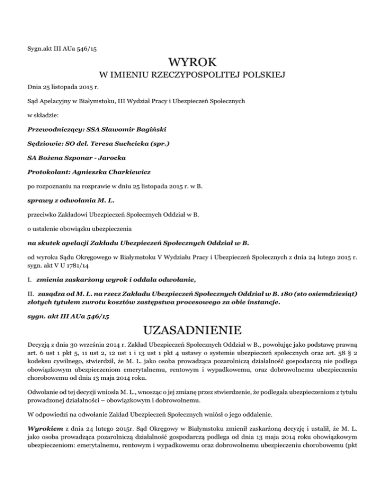 Sygn.akt III AUa 546/15 WYROK W IMIENIU RZECZYPOSPOLITEJ POLSKIEJ Dnia 25 listopada 2015 r. Sąd Apelacyjny w Białymstoku, III Wydział Pracy i Ubezpieczeń Społecznych w składzie: Przewodniczący: SSA Sławomir Bagiński Sędziowie: SO del. Teresa Suchcicka (spr.) SA Bożena Szponar - Jarocka Protokolant: Agnieszka Charkiewicz po rozpoznaniu na rozprawie w dniu 25 listopada 2015 r. w B. sprawy z odwołania M. L. przeciwko Zakładowi Ubezpieczeń Społecznych Oddział w B. o ustalenie obowiązku ubezpieczenia na skutek apelacji Zakładu Ubezpieczeń Społecznych Oddział w B. od wyroku Sądu Okręgowego w Białymstoku V Wydziału Pracy i Ubezpieczeń Społecznych z dnia 24 lutego 2015 r. sygn. akt V U 1781/14 I. zmienia zaskarżony wyrok i oddala odwołanie, II. zasądza od M. L. na rzecz Zakładu Ubezpieczeń Społecznych Oddział w B. 180 (sto osiemdziesiąt) złotych tytułem zwrotu kosztów zastępstwa procesowego za obie instancje. sygn. akt III AUa 546/15 UZASADNIENIE Decyzją z dnia 30 września 2014 r. Zakład Ubezpieczeń Społecznych Oddział w B., powołując jako podstawę prawną art. 6 ust 1 pkt 5, 11 ust 2, 12 ust 1 i 13 ust 1 pkt 4 ustawy o systemie ubezpieczeń społecznych oraz art. 58 § 2 kodeksu cywilnego, stwierdził, że M. L. jako osoba prowadząca pozarolniczą działalność gospodarczą nie podlega obowiązkowym ubezpieczeniom emerytalnemu, rentowym i wypadkowemu, oraz dobrowolnemu ubezpieczeniu chorobowemu od dnia 13 maja 2014 roku. Odwołanie od tej decyzji wniosła M. L., wnosząc o jej zmianę przez stwierdzenie, że podlegała ubezpieczeniom z tytułu prowadzonej działalności – obowiązkowym i dobrowolnemu. W odpowiedzi na odwołanie Zakład Ubezpieczeń Społecznych wniósł o jego oddalenie. Wyrokiem z dnia 24 lutego 2015r. Sąd Okręgowy w Białymstoku zmienił zaskarżoną decyzję i ustalił, że M. L. jako osoba prowadząca pozarolniczą działalność gospodarczą podlega od dnia 13 maja 2014 roku obowiązkowym ubezpieczeniom: emerytalnemu, rentowym i wypadkowemu oraz dobrowolnemu ubezpieczeniu chorobowemu (pkt I) oraz zasądził od Zakładu Ubezpieczeń Społecznych Oddział w B. na rzecz M. L. 60 złotych tytułem zwrotu kosztów zastępstwa procesowego (pkt II). Podstawę rozstrzygnięcia Sądu Okręgowego stanowiły następujące, zasadnicze ustalenia faktyczne i prawne: M. L. (poprzednio S.) urodziła się (...) Ukończyła studia licencjackie na Akademii (...) w W., na kierunku pedagogika specjalna specjalność pedagogika niepełnosprawnych intelektualnie z pedagogiką wczesnoszkolną. Studia te, w formie niestacjonarnej, ukończyła czerwcu 2013 roku. Poza tym ukończyła ona kurs asystenta osoby niepełnosprawnej i kurs opiekunki dziecięcej. Od 1 września 2010 do 31 sierpnia 2012 roku, czyli przez pełne dwa lata, M. L. pracowała w Zespole Szkół nr (...) w B. jako pomoc nauczyciela w wymiarze 1/2 etatu. W roku 2012 wyszła za mąż. Po wyjściu za mąż została zgłoszona do ubezpieczenia zdrowotnego przez męża. Jako wolontariuszka w roku szkolnym 2013 – 2014 zajmowała się dzieckiem autystycznym jako „nauczyciel – cień” w szkole podstawowej nr (...) w B., w poniedziałki, środy i piątki. Od 13 maja 2013 r. M. L. zarejestrowała działalność gospodarczą w zakresie opieki nad dziećmi, zamieściła ogłoszenie na portalu (...)”. Skontaktowała się z nią D. G., która poszukiwała opiekunki dla swojej niepełnosprawnej córki w wieku przedszkolnym, gdyż zajmująca się tym dzieckiem osoba miała wyjechać za granicę na kilka miesięcy. D. G. pracuje jako kierownik salonu samochodowego od około godz. 9.00 do 17.00, a jej mąż w dni powszednie pracuje i mieszka w W.. M. L. i D. G. w końcu maja 2014 r. ustaliły zakres obowiązków opiekunki, to jest odbiór dziecka z przedszkola, nakarmienie, pieczę do godzin popołudniowych, zawożenie dziecka na zajęcia usprawniające do poradni logopedycznej, rehabilitacyjnej i rewalidacyjnej, a także pieczę w dni wolne od zajęć w przedszkolu, także w mieszkaniu M. L.. Ustaliły też wynagrodzenie po 11 zł za godzinę i rozliczanie się w okresach tygodniowych. Sąd ustalił, że M. L. sprawowała pieczę nad siedmioletnią K. G. w umówiony sposób. W czerwcu M. L. zarobiła 803 zł, z których opłaciła 1042,46 zł składek na ubezpieczenia za maj, w lipcu zarobiła 831,5 zł, z których opłaciła takie same składki za czerwiec, a w sierpniu opłaciła składki za lipiec i sierpień. Zapłatę otrzymywała przelewami na konto, z konta D. G.. Rejestrując działalność gospodarczą i zgłaszając się do ubezpieczeń M. L. była w ciąży. 13 sierpnia 2014 r. M. L. urodziła dziecko. Jako podstawę wymiaru składek deklarowała kwotę 2.247,60 zł, to jest stanowiącą 60 % prognozowanego przeciętnego wynagrodzenia miesięcznego, a więc minimalną dla osoby prowadzącej działalność, jednakże bez preferencyjnego obniżenia do 30 % dla osób rozpoczynających działalność. W dniu 28 listopada 2014 roku Zakład wydał wobec M. L. decyzję o numerze (...), w której stwierdził podleganie jej ubezpieczeniom obowiązkowym z tytułu zlecenia, za okres od 26 maja do 31 lipca 2014 roku, ustalając podstawy wymiaru składek zgodnie z osiągniętymi dochodami. Sąd Okręgowy uznał, iż odwołanie jest uzasadnione. Stwierdził, że Zakład w toku postępowania nie podważał wiarygodności i mocy dowodowej żadnego z dowodów przeprowadzonych przez Sąd na wniosek odwołującej, ani nie przedstawiał dowodów przeciwnych. Dlatego opisany wyżej stan faktyczny – zdaniem Sądu - był bezsporny między stronami. W ocenie Sądu, wykonywanie przez M. L. kolejnych umów zlecenia w wiarygodny sposób potwierdzają zawarte umowy pisemne, kopie dokonywanych przez D. G. przelewów, a także pisemne oświadczenia pracowników szkół i poradni, w których pracowała i zajmowała się dziećmi M. L.. Zeznania świadków tylko potwierdzają fakty wynikające z dokument