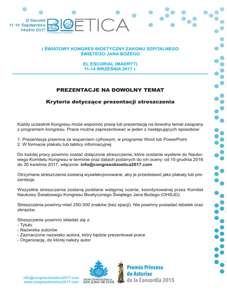 I ŚWIATOWY KONGRES BIOETYCZNY ZAKONU SZPITALNEGO ŚWIĘTEGO JANA BOŻEGO EL ESCORIAL (MADRYT) 11-14 WRZEŚNIA 2017 r. PREZENTACJE NA DOWOLNY TEMAT Kryteria dotyczące prezentacji streszczenia Każdy uczestnik Kongresu może wspomóc pracę lub prezentację na dowolny temat związany z programem kongresu. Prace można zaprezentować w jeden z następujących sposobów: 1. Prezentacja pisemna ze wsparciem cyfrowym, w programie Word lub PowerPoint 2. W formacie plakatu lub tablicy informacyjnej Do każdej pracy powinno zostać dołączone streszczenie, które zostanie wysłane do Naukowego Komitetu Kongresu w terminie oraz datach podanych do ich oceny: od 15 grudnia 2016 do 30 kwietnia 2017, włącznie: [email protected] Otrzymane streszczenia zostaną wyselekcjonowane, aby je przedstawić jako plakaty lub prezentacje. Wszystkie streszczenia zostaną poddane wstępnej ocenie, koordynowanej przez Komitet Naukowy Światowego Kongresu Bioetycznego Świętego Jana Bożego (OHSJD). Streszczenia powinny mieć 250-300 znaków (bez spacji). Nie powinny posiadać tabelek oraz obrazów. Streszczenie powinno składać się z: - Tytułu - Nazwiska autorów - Zaznaczone nazwisko autora, który będzie prezentował prace - Organizację, do której należy autor [email protected] www.congresobioetica2017.com W pracach badawczych trzeba określić: - cel - materiały - metody - wyniki Wszystkie streszczenia powinny odnosić się do obszaru tematyki przewidzianej przez Kongres. Oryginalne, niepublikowane wcześniej prace będą miały pierwszeństwo. Każdy autor może zaprezentować maksymalnie dwie prace, ale może brać udział jako współautor w wielu pracach. Komitet Naukowy I Światowego Kongresu Bioetycznego Świętego Jana Bożego (OHSJD), wyśle powiadomienie o aprobacie streszczenia do wyznaczonych autorów przez e-maila, przed 31 maja 2017 r. dla streszczeń wysłanych do 30 kwietnia 2017 r. Komitet Naukowy I Światowego Kongresu Bioetycznego Świętego Jana Bożego (OHSJD) określi czy przedstawienie pracy zostanie wykonane za pomocą prezentacji lub plakatu. Przedstawienie prezentacji ustnych będą trwały 7 minut plus 3 minuty debaty, i mogą zostać zrealizowane za pomocą programu PowerPoint. Plakaty powinny mieć wymiary 1 m x 0,70 m i powinny być napisane po angielsku lub hiszpańsku. Autorzy powinni się zarejestrować i zapisać poprzez formularz do zapisów, znajdujący się na stronie internetowej Kongresu (www.congresobioetica2017.com) i prezentacja pracy będzie zależna od zapisu. [email protected] www.congresobioetica2017.com