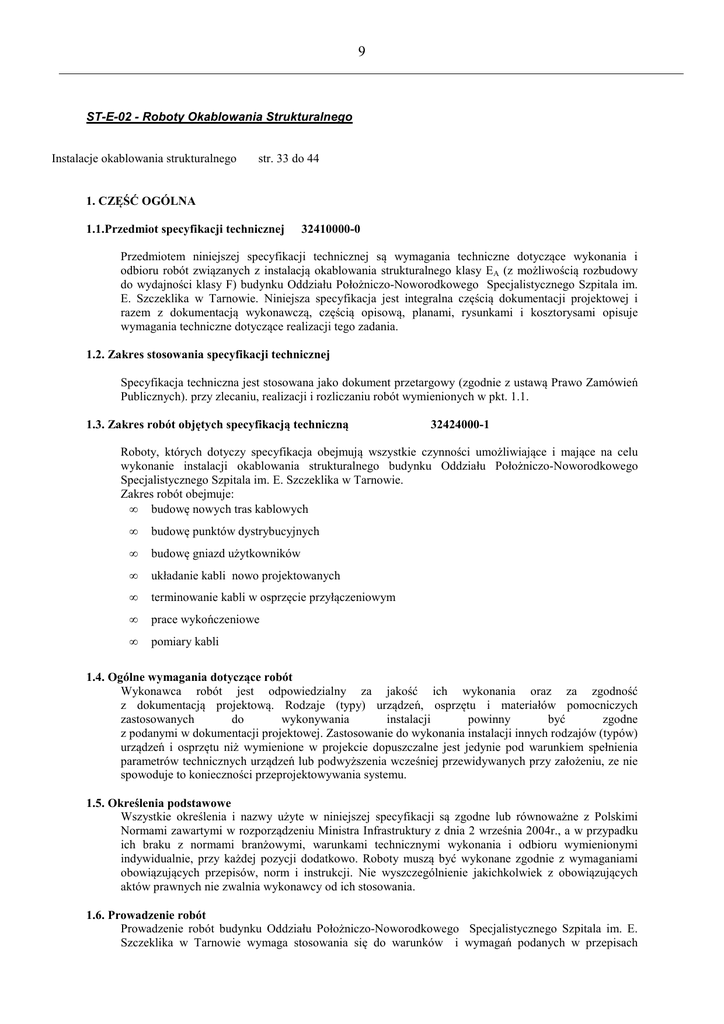 9 ST-E-02 - Roboty Okablowania Strukturalnego Instalacje okablowania strukturalnego str. 33 do 44 1. CZĘŚĆ OGÓLNA 1.1.Przedmiot specyfikacji technicznej 32410000-0 Przedmiotem niniejszej specyfikacji technicznej są wymagania techniczne dotyczące wykonania i odbioru robót związanych z instalacją okablowania strukturalnego klasy EA (z możliwością rozbudowy do wydajności klasy F) budynku Oddziału Położniczo-Noworodkowego Specjalistycznego Szpitala im. E. Szczeklika w Tarnowie. Niniejsza specyfikacja jest integralna częścią dokumentacji projektowej i razem z dokumentacją wykonawczą, częścią opisową, planami, rysunkami i kosztorysami opisuje wymagania techniczne dotyczące realizacji tego zadania. 1.2. Zakres stosowania specyfikacji technicznej Specyfikacja techniczna jest stosowana jako dokument przetargowy (zgodnie z ustawą Prawo Zamówień Publicznych). przy zlecaniu, realizacji i rozliczaniu robót wymienionych w pkt. 1.1. 1.3. Zakres robót objętych specyfikacją techniczną 32424000-1 Roboty, których dotyczy specyfikacja obejmują wszystkie czynności umożliwiające i mające na celu wykonanie instalacji okablowania strukturalnego budynku Oddziału Położniczo-Noworodkowego Specjalistycznego Szpitala im. E. Szczeklika w Tarnowie. Zakres robót obejmuje: • budowę nowych tras kablowych • budowę punktów dystrybucyjnych • budowę gniazd użytkowników • układanie kabli nowo projektowanych • terminowanie kabli w osprzęcie przyłączeniowym • prace wykończeniowe • pomiary kabli 1.4. Ogólne wymagania dotyczące robót Wykonawca robót jest odpowiedzialny za jakość ich wykonania oraz za zgodność z dokumentacją projektową. Rodzaje (typy) urządzeń, osprzętu i materiałów pomocniczych zastosowanych do wykonywania instalacji powinny być zgodne z podanymi w dokumentacji projektowej. Zastosowanie do wykonania instalacji innych rodzajów (typów) urządzeń i osprzętu niż wymienione w projekcie dopuszczalne jest jedynie pod warunkiem spełnienia parametrów technicznych urządzeń lub podwyższenia wcześniej przewidywanych przy założeniu, ze nie spowoduje to konieczności przeprojektowywania systemu. 1.5. Określenia podstawowe Wszystkie określenia i nazwy użyte w niniejszej specyfikacji są zgodne lub równoważne z Polskimi Normami zawartymi w rozporządzeniu Ministra Infrastruktury z dnia 2 września 2004r., a w przypadku ich braku z normami branżowymi, warunkami technicznymi wykonania i odbioru wymienionymi indywidualnie, przy każdej pozycji dodatkowo. Roboty muszą być wykonane zgodnie z wymaganiami obowiązujących przepisów, norm i instrukcji. Nie wyszczególnienie jakichkolwiek z obowiązujących aktów prawnych nie zwalnia wykonawcy od ich stosowania. 1.6. Prowadzenie robót Prowadzenie robót budynku Oddziału Położniczo-Noworodkowego Specjalistycznego Szpitala im. E. Szczeklika w Tarnowie wymaga stosowania się do warunków i wymagań podanych w przepisach 10 (normach) obowiązujących w zakresie w/w obiekcie oraz uzgodnień wykonania robót z jednostkami nadzorującymi dane obiekty. 1.7. Odbiór placu budowy Przed rozpoczęciem robót instalacji okablowania internetowego wykonawca powinien zapoznać się z budynkiem Oddziału Położniczo-Noworodkowego Specjalistycznego Szpitala im. E. Szczeklika w Tarnowie, gdzie będą prowadzone roboty. 1.8 Koordynacja robót instalacji okablowania strukturalnego z innymi robotami Koordynacja robót budowlano-montażowych poszczególnych rodzajów powinna być dokonana we wszystkich fazach procesu budowy. Koordynacją należy objąć projekt organizacji budowy, szczegółowy harmonogram robót instalacji okablowania strukturalnego oraz pomocnicze roboty ogólnobudowlane związane z robotami okablowania strukturalnego. 2. MATERIAŁY Parametry techniczne materiałów i wyrobów powinny być zgodne z wymaganiami podanymi w projekcie i powinny odpowiadać wymaganiom obowiązujących norm państwowych (PN) oraz przepisom dotyczącym instalacji okablowania strukturalnego. 2.1. Materiały podstawowe 32422000-7 o Kabel S/FTP (PiMF) 600 MHz kat.7, 4 pary 23AWG, LSZH, 1000m, 25 lat gwarancji o Kabel U/UTP 25 par kat.3, drut 24AWG 100 Ohm, LSZH, (500m) o Opaska kablowa, kolor naturalny ( 200x3.6), kpl.1000szt o Uniwersalny ekranowany panel krosowy 24 port HD kpl. (wys. 2U) z miejscem na 24 wkładki (składający się z: puszki ekranowanej z automatycznym sprężynowym zaciskiem 360o ekranu kabla, uniwersalnego szeregowego złącza IDC 2GHz (modularnego), tylnej prowadnicy kabla, elementu maskującego). o Uniwersalne ekranowane gniazdo teleinformatyczne montowane w uchwycie do osprzętu 45mm z możliwościami transmisyjnymi do 2GHz. Zestaw instalacyjny powinien zawierać płytę czołową prostą z ramką montażową 45mm, ekranowaną puszkę instalacyjną (wymagany kontakt ekranu kabla i obudowy złącza po całym obwodzie kabla - 360˚) z wyprowadzeniem kabla do góry, w lewo lub prawo oraz wyposażoną w złącze modularne o wydajności 2GHz. Dodatkowo powinny znajdować się zaciski umożliwiające optymalne wyprowadzenie kabla i kontakt ekranu oraz etykieta opisowa. o Wkładka ekranowana uniwersalna 1xRJ45 kat.6A montowana do panela lub gniazda. o Zaślepka portu uniwersalnego, o Panel telefoniczny 25 Port RJ45, UTP (25x2pary), PCB, 1U RAL9005 o Panel krosowy 24 port niezaładowany o Moduł gniazda RJ45 ekranowany o Ikony do opisu portów gniazd i paneli, zielone, 16 x DATA o Ikony do opisu portów gniazd i paneli, czerwone, 16 x PHONE o Wieszak poziomy 1U, 19" RAL9005 o Termostat zamykający o Listwa zasilająco-filtrująca 9 gniazd bez zabezpieczenia o Wentylator do szafek wiszących o Szafa wisząca 15U 19” 600x500. Szafa kablowa ma mieć konstrukcję spawaną i być wykonana z blachy alucynkowo-krzemowej oraz posiadać katodową ochronę antykorozyjną. Ponadto ma być wyposażona w drzwi przednie oszklone przyciemnione zamykane na klucz, możliwość wprowadzenia kabla przez czę