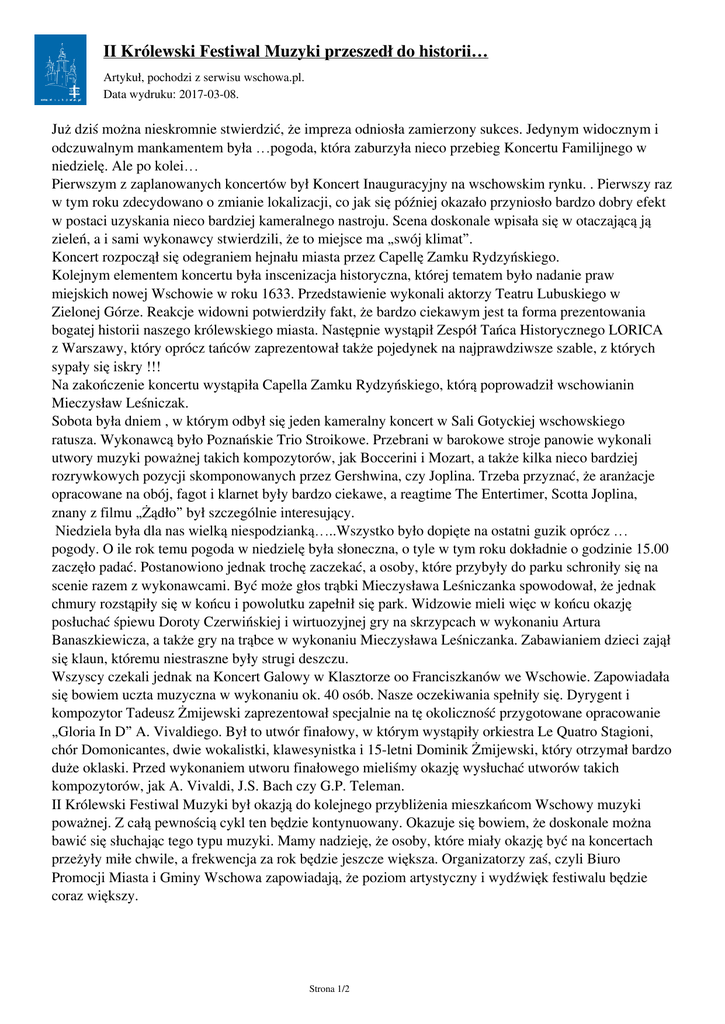 II Królewski Festiwal Muzyki przeszedł do historii… Artykuł‚ pochodzi z serwisu wschowa.pl. Data wydruku: 2017-03-08. Już dziś można nieskromnie stwierdzić, że impreza odniosła zamierzony sukces. Jedynym widocznym i odczuwalnym mankamentem była …pogoda, która zaburzyła nieco przebieg Koncertu Familijnego w niedzielę. Ale po kolei… Pierwszym z zaplanowanych koncertów był Koncert Inauguracyjny na wschowskim rynku. . Pierwszy raz w tym roku zdecydowano o zmianie lokalizacji, co jak się później okazało przyniosło bardzo dobry efekt w postaci uzyskania nieco bardziej kameralnego nastroju. Scena doskonale wpisała się w otaczającą ją zieleń, a i sami wykonawcy stwierdzili, że to miejsce ma „swój klimat”. Koncert rozpoczął się odegraniem hejnału miasta przez Capellę Zamku Rydzyńskiego. Kolejnym elementem koncertu była inscenizacja historyczna, której tematem było nadanie praw miejskich nowej Wschowie w roku 1633. Przedstawienie wykonali aktorzy Teatru Lubuskiego w Zielonej Górze. Reakcje widowni potwierdziły fakt, że bardzo ciekawym jest ta forma prezentowania bogatej historii naszego królewskiego miasta. Następnie wystąpił Zespół Tańca Historycznego LORICA z Warszawy, który oprócz tańców zaprezentował także pojedynek na najprawdziwsze szable, z których sypały się iskry !!! Na zakończenie koncertu wystąpiła Capella Zamku Rydzyńskiego, którą poprowadził wschowianin Mieczysław Leśniczak. Sobota była dniem , w którym odbył się jeden kameralny koncert w Sali Gotyckiej wschowskiego ratusza. Wykonawcą było Poznańskie Trio Stroikowe. Przebrani w barokowe stroje panowie wykonali utwory muzyki poważnej takich kompozytorów, jak Boccerini i Mozart, a także kilka nieco bardziej rozrywkowych pozycji skomponowanych przez Gershwina, czy Joplina. Trzeba przyznać, że aranżacje opracowane na obój, fagot i klarnet były bardzo ciekawe, a reagtime The Entertimer, Scotta Joplina, znany z filmu „Żądło” był szczególnie interesujący. Niedziela była dla nas wielką niespodzianką…..Wszystko było dopięte na ostatni guzik oprócz … pogody. O ile rok temu pogoda w niedzielę była słoneczna, o tyle w tym roku dokładnie o godzinie 15.00 zaczęło padać. Postanowiono jednak trochę zaczekać, a osoby, które przybyły do parku schroniły się na scenie razem z wykonawcami. Być może głos trąbki Mieczysława Leśniczanka spowodował, że jednak chmury rozstąpiły się w końcu i powolutku zapełnił się park. Widzowie mieli więc w końcu okazję posłuchać śpiewu Doroty Czerwińskiej i wirtuozyjnej gry na skrzypcach w wykonaniu Artura Banaszkiewicza, a także gry na trąbce w wykonaniu Mieczysława Leśniczanka. Zabawianiem dzieci zajął się klaun, któremu niestraszne były strugi deszczu. Wszyscy czekali jednak na Koncert Galowy w Klasztorze oo Franciszkanów we Wschowie. Zapowiadała się bowiem uczta muzyczna w wykonaniu ok. 40 osób. Nasze oczekiwania spełniły się. Dyrygent i kompozytor Tadeusz Żmijewski zaprezentował specjalnie na tę okoliczność przygotowane opracowanie „Gloria In D” A. Vivaldiego. Był to utwór finałowy, w którym wystąpiły orkiestra Le Quatro Stagioni, chór Domonicantes, dwie wokalistki, klawesynistka i 15-letni Dominik Żmijewski, który otrzymał bardzo duże oklaski. Przed wykonaniem utworu finałowego mieliśmy okazję wysłuchać utworów takich kompozytorów, jak A. Vivaldi, J.S. Bach czy G.P. Teleman. II Królewski Festiwal Muzyki był okazją do kolejnego przybliżenia mieszkańcom Wschowy muzyki poważnej. Z całą pewnością cykl ten będzie kontynuowany. Okazuje się bowiem, że doskonale można bawić się słuchając tego typu muzyki. Mamy nadzieję, że osoby, które miały okazję być na koncertach przeżyły miłe chwile, a frekwencja za rok będzie jeszcze większa. Organizatorzy zaś, czyli Biuro Promocji Miasta i Gminy Wschowa zapowiadają, że poziom artystyczny i wydźwięk festiwalu będzie coraz większy. Strona 1/2 II Królewski Festiwal Muzyki przeszedł do historii… Artykuł‚ pochodzi z serwisu wschowa.pl. Data wydruku: 2017-03-08. Dziękujemy także tym, którzy pomogli nam w organizacji : Domowi Kultury, Spółce Komunalnej, p. Jędrzejowi Gębaczykowi, p. Danielowi Jankowskiemu, Pani Dyrektor Domu Dziecka we Wschowie-Barbarze Tlałce i oczywiście Ojcu Gwardianowi Klasztoru oo Franciszkanów za udostępnienie świątyni i za …pyszny placek drożdżowy, którym zajadali się wykonawcy. Zapraszamy za rok… Strona 2/2 Powered by TCPDF (www.tcpdf.org)