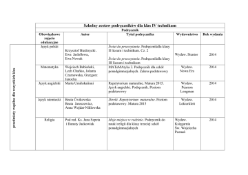 Szkolny zestaw podręczników dla klas IV technikum Obowiązkowe zajęcia edukacyjne Język polski Autor przedmioty wspólne dla wszystkich klas Krzysztof Biedrzycki . Ewa Jaskółowa, Ewa Nowak Matematyka Język angielski Wojciech Babiański, Lech Chańko, Jolanta Czarnowska, Grzegorz Janocha Marta Umińskaiinni Podręcznik Tytuł podręcznika Wydawnictwo Rok wydania Wydaw. Stentor 2014 Wydaw. Nowa Era 2014 Wydaw. Pearson Longman 2014 Wydaw. Lektorklett 2014 Świat do przeczytania. Podręcznikdla klasy II liceum i technikum. Cz. 2 Świat do przeczytania. Podręcznikdla klasy III liceum i technikum MATeMAtyka 3. Podręcznik dla szkół ponadgimnazjalnych. Zakres podstawowy Repetytorium maturalne. Matura 2015. Język angielski. Podręcznik. Poziom podstawowy Język niemiecki Beata Ćwikowska Beata Jaroszewicz, Anna Wojdat-Niklewska Direkt. Repetytorium maturalne. Poziom podstawowy. Matura 2015 Religia Pod red. Ks. Jana Szpeta i Danuty Jackowiak Moje miejsce w rodzinie. Podręcznik do nauki religii dla klasy trzeciej szkół ponadgimnazjalnych Wydaw. Księgarnia Św. Wojciecha Poznań 2014 Szkolny zestaw podręczników dla klas IV technikum Obowiązkowe zajęcia edukacyjne Matematyka Przedmioty rozszerzone (do wyboru przez uczniów) Wiedza o społeczeństwie Autor Wojciech Babiański, Lech Chańko, Jolanta Czarnowska, Grzegorz Janocha MATeMAtyka 3 Podręcznik dla szkół ponadgimnazjalnych. Zakres rozszerzony Lucyna Czechowska, Arkadiusz Janicki, Klaudiusz Święcicki W centrum uwagi. Podręcznik dla liceum ogólnokształcącego i technikum Zakres rozszerzony. Cz. 2. Informatyka Geografia Podręcznik Tytuł podręcznika Wydawnictwo Rok wydania Wydaw. Nowa Era 2014 Wydaw. Nowa Era 2014 Wydaw. Nowa Era 2014 [Multimedialny projekt opracowania i wdrożenia innowacyjnego programu nauczania w zakresie informatyki rozszerzonej dla szkół ponadgimnazjalnych] Roman Malarz, Marek Więckowski Oblicza geografii 3. Podręcznik dla liceumogólnokształcącego i technikum. Zakres rozszerzony Szkolny zestaw podręczników dla klas IV technikum technik ekonomista (przedmioty zawodowe) Przedmioty uzupełniające (dla uczniów realizujących przedmiot) Obowiązkowe zajęcia edukacyjne Historia i społeczeństwo Autor Marcin Markowicz, Olga Pytlińska, Agata Wyroda Pracownia ekonomiczna Pracownia rachunkowości i analizy ekonomicznej Historia i społeczeństwo. Europa i świat. Podręcznik do liceum i technikum. Wyd. 2 Wydawnictwo Rok wydania WSiP 2015 Wydaw. B. Padurek 2013 Wydaw. Pearson Longman 2015 Rachunkowość przedsiębiorstw. Cz. 3 Rachunkowość Język obcy zawodowy Podręcznik Tytuł podręcznika Rachunkowość przedsiębiorstw. Cz. 4 David Bonamy, Evan Frendo, Maja Olenjniczak, Rosemary Riches, Maria Spada, Ross Wright English for Banking & Finance 1. Coursebook Grażyna Borowska, IrenaFrymarek Teresa Gorzelany Inwentaryzacja WSiP 2013 Pracownia rachunkowości cz. 1 – Dokumenty, cz. 2 – Moja firma WSiP 2014 Technik informatyk (przedmioty zawodowe) Szkolny zestaw podręczników dla klas IV technikum Obowiązkowe zajęcia edukacyjne Multimedia i grafika komputerowa Systemy zarządzania bazami danych (przedmioty zawodowe) Jolanta Pokorska Jolanta Pokorska Aplikacje internetowe Jolanta Pokorska Język obcy zawodowy David Hill Obsługa konsumenta technik hotelarstwa Autor Język obcy zawodowy Pracownia obsługi konsumenta Pracownia obsługi gościa hotelowego Bożena Granecka-Wrzosek Joanna DolińskaRomanowicz, Dorota Nowakowska Joanna Duda, Sebastian Krzywda Aleksandra Lewandowska Podręcznik Tytuł podręcznika Kwalifikacja E.14. Część 1. Tworzenie stron internetowych. Podręcznik do nauki zawodu technik informatyk Kwalifikacja E14. Część 2. Tworzenie baz danych i administrowanie bazami. Podręcznik do nauki zawodu technik informatyk Kwalifikacja E.14. Część 3. Tworzenie aplikacji internetowych. Podręcznik do nauki zawodu technik informatyk English for Information Technology 2 Usługi żywieniowe w hotelarstwie. Podręcznik do nauki zawodu technik hotelarstwa How can I help you? Język angielski zawodowy dla zawodu technik hotelarstwa. Podręcznik. Szkoła ponadgimnazjalna. Część 2 Obsługa konsumenta. Zeszyt ćwiczeń do nauki zawodu technik hotelarstwa Techniki pracy w hotelarstwie. Zeszyt ćwiczeń do nauki zawodu technik hotelarstwa. Szkoły ponadgimnazjalne. Część 2 Wydawnictwo Rok wydania Wydaw. Helion 2013 Wydaw. Helion 2013 Wydaw. Helion 2014 Wydaw. Pearson 2014 WSiP 2015 Wydaw. REA 2013 Wydaw. REA 2012 Wydaw. REA 2015