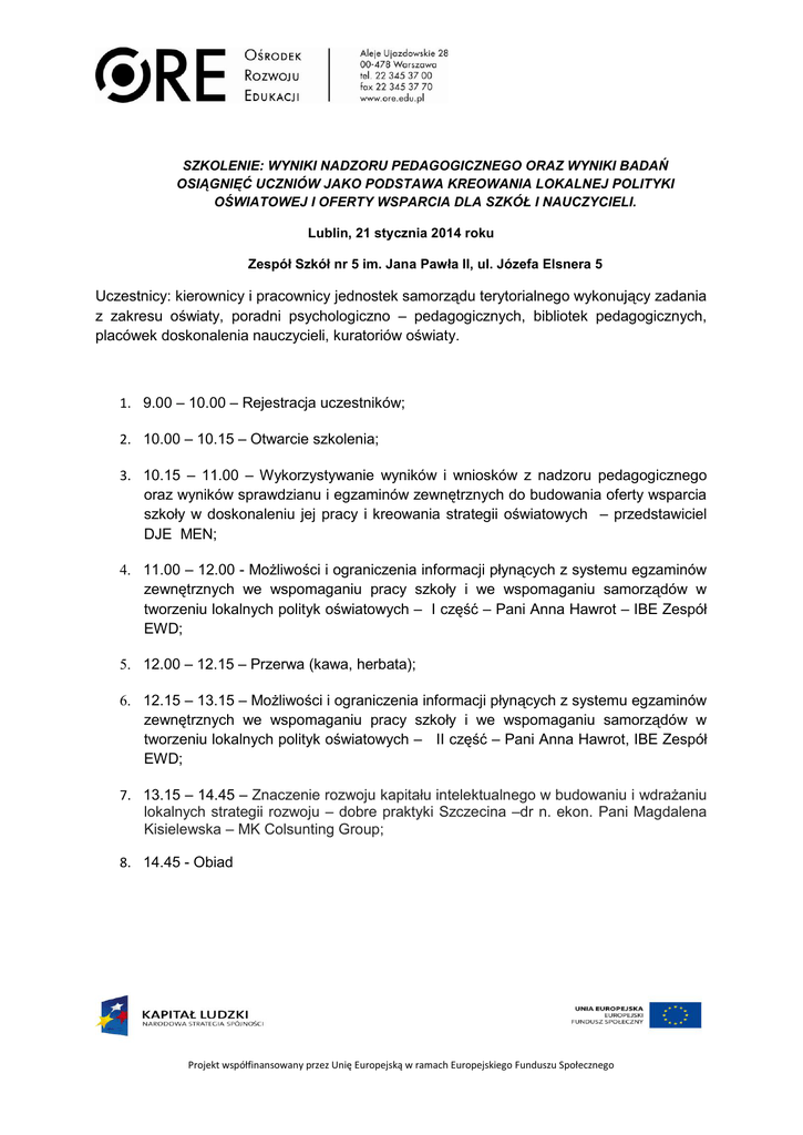 SZKOLENIE: WYNIKI NADZORU PEDAGOGICZNEGO ORAZ WYNIKI BADAŃ OSIĄGNIĘĆ UCZNIÓW JAKO PODSTAWA KREOWANIA LOKALNEJ POLITYKI OŚWIATOWEJ I OFERTY WSPARCIA DLA SZKÓŁ I NAUCZYCIELI. Lublin, 21 stycznia 2014 roku Zespół Szkół nr 5 im. Jana Pawła II, ul. Józefa Elsnera 5 Uczestnicy: kierownicy i pracownicy jednostek samorządu terytorialnego wykonujący zadania z zakresu oświaty, poradni psychologiczno – pedagogicznych, bibliotek pedagogicznych, placówek doskonalenia nauczycieli, kuratoriów oświaty. 1. 9.00 – 10.00 – Rejestracja uczestników; 2. 10.00 – 10.15 – Otwarcie szkolenia; 3. 10.15 – 11.00 – Wykorzystywanie wyników i wniosków z nadzoru pedagogicznego oraz wyników sprawdzianu i egzaminów zewnętrznych do budowania oferty wsparcia szkoły w doskonaleniu jej pracy i kreowania strategii oświatowych – przedstawiciel DJE MEN; 4. 11.00 – 12.00 - Możliwości i ograniczenia informacji płynących z systemu egzaminów zewnętrznych we wspomaganiu pracy szkoły i we wspomaganiu samorządów w tworzeniu lokalnych polityk oświatowych – I część – Pani Anna Hawrot – IBE Zespół EWD; 5. 12.00 – 12.15 – Przerwa (kawa, herbata); 6. 12.15 – 13.15 – Możliwości i ograniczenia informacji płynących z systemu egzaminów zewnętrznych we wspomaganiu pracy szkoły i we wspomaganiu samorządów w tworzeniu lokalnych polityk oświatowych – II część – Pani Anna Hawrot, IBE Zespół EWD; 7. 13.15 – 14.45 – Znaczenie rozwoju kapitału intelektualnego w budowaniu i wdrażaniu lokalnych strategii rozwoju – dobre praktyki Szczecina –dr n. ekon. Pani Magdalena Kisielewska – MK Colsunting Group; 8. 14.45 - Obiad Projekt współfinansowany przez Unię Europejską w ramach Europejskiego Funduszu Społecznego