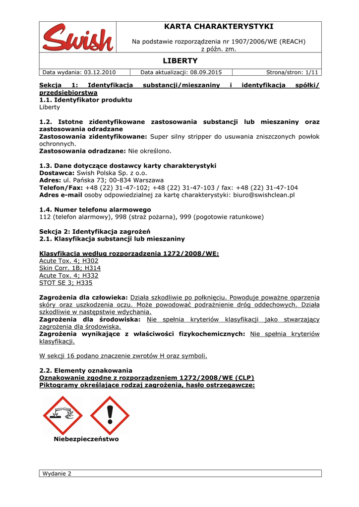 KARTA CHARAKTERYSTYKI Na podstawie rozporządzenia nr 1907/2006/WE (REACH) z późn. zm. LIBERTY Data wydania: 03.12.2010 Sekcja 1: Identyfikacja przedsiębiorstwa 1.1. Identyfikator produktu Liberty Data aktualizacji: 08.09.2015 substancji/mieszaniny Strona/stron: 1/11 i identyfikacja spółki/ 1.2. Istotne zidentyfikowane zastosowania substancji lub mieszaniny oraz zastosowania odradzane Zastosowania zidentyfikowane: Super silny stripper do usuwania zniszczonych powłok ochronnych. Zastosowania odradzane: Nie określono. 1.3. Dane dotyczące dostawcy karty charakterystyki Dostawca: Swish Polska Sp. z o.o. Adres: ul. Pańska 73; 00-834 Warszawa Telefon/Fax: +48 (22) 31-47-102; +48 (22) 31-47-103 / fax: +48 (22) 31-47-104 Adres e-mail osoby odpowiedzialnej za kartę charakterystyki: [email protected] 1.4. Numer telefonu alarmowego 112 (telefon alarmowy), 998 (straż pożarna), 999 (pogotowie ratunkowe) Sekcja 2: Identyfikacja zagrożeń 2.1. Klasyfikacja substancji lub mieszaniny Klasyfikacja według rozporządzenia 1272/2008/WE: Acute Tox. 4; H302 Skin Corr. 1B; H314 Acute Tox. 4; H332 STOT SE 3; H335 Zagrożenia dla człowieka: Działa szkodliwie po połknięciu. Powoduje poważne oparzenia skóry oraz uszkodzenia oczu. Może powodować podrażnienie dróg oddechowych. Działa szkodliwie w następstwie wdychania. Zagrożenia dla środowiska: Nie spełnia kryteriów klasyfikacji jako stwarzający zagrożenia dla środowiska. Zagrożenia wynikające z właściwości fizykochemicznych: Nie spełnia kryteriów klasyfikacji. W sekcji 16 podano znaczenie zwrotów H oraz symboli. 2.2. Elementy oznakowania Oznakowanie zgodne z rozporządzeniem 1272/2008/WE (CLP) Piktogramy określające rodzaj zagrożenia, hasło ostrzegawcze: Niebezpieczeństwo Wydanie 2 KARTA CHARAKTERYSTYKI Na podstawie rozporządzenia nr 1907/2006/WE (REACH) z późn. zm. LIBERTY Data wydania: 03.12.2010 Data aktualizacji: 08.09.2015 Strona/stron: 2/11 Zwroty wskazujące rodzaj zagrożenia: H302 - Działa szkodliwie po połknięciu. H314 - Powoduje poważne oparzenia skóry oraz uszkodzenia oczu. H332 - Działa szkodliwie w następstwie wdychania. H335 - Może powodować podrażnienie dróg oddechowych. Zwroty wskazujące środki ostrożności: P260 - Nie wdychać mgły/par/rozpylonej cieczy. P301+P330+P331 - W PRZYPADKU POŁKNIĘCIA: wypłukać usta. NIE wywoływać wymiotów. P303+P361+P353 - W PRZYPADKU KONTAKTU ZE SKÓRĄ (lub z włosami): Natychmiast zdjąć całą zanieczyszczoną odzież. Spłukać skórę pod strumieniem wody/prysznicem. P304+P340 - W PRZYPADKU DOSTANIA SIĘ DO DRÓG ODDECHOWYCH: wyprowadzić lub wynieść poszkodowanego na świeże powietrze i zapewnić mu warunki do swobodnego oddychania. P305+P351+P338 - W PRZYPADKU DOSTANIA SIĘ DO OCZU: Ostrożnie płukać wodą przez kilka minut. Wyjąć soczewki kontaktowe, jeżeli są i można je łatwo usunąć. Nadal płukać. P312 - W przypadku złego samopoczucia skontaktować się z OŚRODKIEM ZATRUĆ/lekarzem. P501 - Zawartość/pojemnik usuwać zgodnie z krajowymi przepisami. Nazwy niebezpiecznych składników umieszczone na etykiecie: 2-aminoetanol; 2-butoksyetanol. 2.3. Inne zagrożenia Brak informacji dotyczących spełniania kryteriów PBT lub vPvB zgodnie z załącznikiem XIII rozporządzenia 1907/2006 (REACH). Badania nie zostały przeprowadzone. Sekcja 3: Skład/informacja o składnikach 3.1. Substancje Nie dotyczy. 3.2. Mieszaniny Mieszanina zawiera 1-5% propan-1,2-diol [CAS: 57-55-6] - substancja nieklasyfikowana w Załączniku VI, Tabeli 3.1 rozporządzenia 1272/2008. Nazwa substancji niebezpiecznej: Zakres stężeń [%]: Numer CAS: Numer WE: Numer indeksowy: Klasyfikacja 1272/2008/WE: Numer rejestracji właściwej: Wydanie 2 2-Aminoetanol 10-30 141-43-5 205-483-3 603-030-00-8 Acute Tox. 4; H332 Acute Tox. 4; H312 Acute Tox. 4; H302 Skin Corr. 1B; H314 Stężenia graniczne: STOT SE 3; H335: C ≥ 5% Substancja w okresie przejściowym KARTA CHARAKTERYSTYKI Na podstawie rozporządzenia nr 1907/2006/WE (REACH) z późn. zm. LIBERTY Data wydania: 03.12.2010 Data aktualizacji: 08.09.2015 Nazwa substancji niebezpiecznej: Zakres stężeń [%]: Numer CAS: Numer WE: Numer indeksowy: Klasyfikacja 1272/2008/WE: Numer rejestracji właściwej: Nazwa substancji niebezpiecznej: Zakres stężeń [%]: Numer CAS: Numer WE: Numer indeksowy: Klasyfikacja 1272/2008/WE: Numer rejestracji właściwej: Strona/stron: 3/11 2-Butoksyetanol 10-30 111-76-2 203-905-0 603-014-00-0 Acute Tox. 4; H332 Acute Tox. 4; H312 Acute Tox. 4; H302 Eye Irrit. 2; H319 Skin Irrit. 2; H315 Substancja w okresie przejściowym Wersenian tetrasodowy 1-5 64-02-8 200-573-9 607-428-00-2 Acute Tox. 4; H302 Eye Dam. 1; H318 Substancja w okresie przejściowym W sekcji 16 podano znaczenie zwrotów H oraz symboli. Sekcja 4: Środki pierwszej pomocy 4.1. Opis środków pierwszej pomocy Narażenie drogą oddechową: Wyprowadzić poszkodowaną osobę na świeże powietrze i zapewnić mu warunki do swobodnego oddychania. W przypadku złego samopoczucia skontaktować się z OŚRODKIEM ZATRUĆ/lekarzem. Kontakt ze skórą: Natychmiast zdjąć całą zanieczyszczoną odzież. Zanieczyszczoną odzież oczyścić przed ponownym użyciem. Zanieczyszczoną skórę przemywać dużą ilością wody z mydłem. Natychmiast skontaktować się z OŚRODKIEM ZATRUĆ/lekarzem. Kontakt z oczami: Wyjąć soczewki kontaktowe, jeżeli są i można je łatwo usunąć. Przemywać zanieczyszczone oczy większą ilością letniej wody przez 15 minut, przy wywiniętych powiekach. Natychmiast skontaktować się z OŚRODKIEM ZATRUĆ/lekarzem. Po spożyciu: NIE wywoływać wymiotów. W przeciwnym przypadku przepłukać dokładnie usta wodą, podać do wypicia szklankę wody. Jeżeli osoba jest nieprzytomna, senna lub ma konwulsje nie podawać niczego doustnie. Natychmiast skontaktować się z OŚRODKIEM ZATRUĆ/lekarzem. 4.2. Najważniejsze ostre i opóźnione objawy oraz skutki narażenia Narażenie drogą oddechową: Może pow