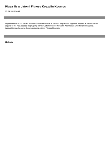 Klasa 1b w Jatomi Fitness Koszalin Kosmos 07.04.2016 20:47 Wyjście klasy 1b do Jatomi Fitness Koszalin Kosmos w ramach nagrody za zajęcie II miejsca w konkursie na zdjęcie w tle. Raz jeszcze dziękujemy bardzo Jatomi Fitness Koszalin Kosmos za ufundowanie nagrody. Wszystkich zachęcamy do odwiedzania Jatomi Fitness Koszalin! Galeria