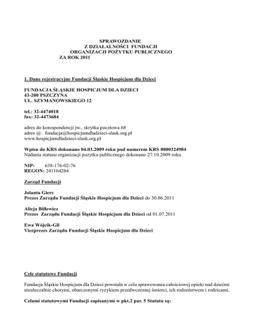 SPRAWOZDANIE Z DZIAŁALNOŚCI FUNDACJI – ORGANIZACJI POŻYTKU PUBLICZNEGO ZA ROK 2011 1. Dane rejestracyjne Fundacji Śląskie Hospicjum dla Dzieci FUNDACJA ŚLĄSKIE HOSPICJUM DLA DZIECI 43-200 PSZCZYNA UL. SZYMANOWSKIEGO 12 tel.: 32-4474018 fax: 32-4473684 adres do korespondencji jw., skrytka pocztowa 68 adres @: [email protected] www.hospicjumdladzieci-slask.org.pl Wpisu do KRS dokonano 04.03.2009 roku pod numerem KRS 0000324984 Nadania statusu organizacji pożytku publicznego dokonano 27.10.2009 roku NIP: 638-176-02-76 REGON: 241164284 Zarząd Fundacji Jolanta Giers Prezes Zarządu Fundacji Śląskie Hospicjum dla Dzieci do 30.06.2011 Alicja Billewicz Prezes Zarządu Fundacji Śląskie Hospicjum dla Dzieci od 01.07.2011 Ewa Wójcik-Gil Viceprezes Zarządu Fundacji Śląskie Hospicjum dla Dzieci Cele statutowe Fundacji Fundacja Śląskie Hospicjum dla Dzieci powstała w celu sprawowania całościowej opieki nad dziećmi nieuleczalnie chorymi, obarczonymi ryzykiem przedwczesnej śmierci, ich rodzeństwem i rodzicami. Celami statutowymi Fundacji zapisanymi w pkt.2 par. 5 Statutu są: 1) nieodpłatne wspieranie i świadczenie opieki paliatywnej nad dziećmi, młodzieżą i młodymi dorosłymi ze schorzeniami ograniczającymi życie i ich rodzinami, rozumianej jako otoczenie opieką dzieci i młodzieży ze schorzeniami ograniczającymi życie, poprzez aktywne i całościowe podejście obejmujące fizyczne, emocjonalne, społeczne i duchowe elementy, podniesienie jakości życia dziecka, wspieranie rodziny, leczenie nieprzyjemnych objawów, niesienie ulgi i wytchnienia rodzinie oraz opiekę w czasie umierania i w okresie żałoby, 2) nieodpłatne wspieranie i świadczenie opieki nad przewlekle chorymi dziećmi, młodzieżą i młodymi dorosłymi, 3) nieodpłatne wsparcie w żałobie rodzin dzieci, młodzieży i młodych dorosłych, którzy zmarli z powodu innych przyczyn niż schorzenia ograniczające życie, 4) nieodpłatne rozwijanie i wprowadzanie modelu domowej opieki paliatywnej i nad dziećmi, młodzieżą i młodymi dorosłymi w Polsce i za granicą. 2. Zasady, formy i zakres dzialalności statutowej z podaniem realizacji celow statutowych Fundacja realizuje swoje cele poprzez: 1) organizowanie i finansowanie ośrodków opieki paliatywnej nad dziećmi, młodzieżą i młodymi dorosłymi w Polsce i innych krajach, 2) prowadzenie leczenia w zakresie hospicjum domowego i stacjonarnego, 3) pomoc rzeczową i finansową dla rodzin żyjących pacjentów, umożliwiającą im sprawowanie opieki w domu oraz pomoc finansową dla rodzin w okresie żałoby — na sfinansowanie kosztów pogrzebu, 4) organizowanie i finansowanie programu wsparcia w żałobie dla dorosłych i dzieci (obejmującego zarówno rodziny pacjentów Śląskiego Hospicjum dla Dzieci, jak również rodziny dzieci, młodzieży i młodych dorosłych zmarłych w innych okolicznościach, np. w szpitalu) polegającego na pomocy w rozwiązywaniu problemów psychologicznych i duchowych, świadczonej przez psychologów, lekarzy, pedagogów i duchownych oraz innych specjalistów, a także obejmującego organizowanie i finansowanie wycieczek, obozów wakacyjnych, pielgrzymek lub innych form terapii, 5) organizowanie i finansowanie działalności wydawniczej szkoleniowych i naukowych z zakresu opieki paliatywnej w zakresie materiałów pediatrii, anestezjologii i intensywnej terapii, neonatologii oraz opieki długoterminowej dla dzieci/młodzieży/młodych dorosłych, 6) prowadzenie i finansowanie badań naukowych z zakresu opieki paliatywnej i leczenia bólu, anestezjologii i intensywnej terapii, pediatrii, neonatologii oraz opieki długoterminowej, 7) prowadzenie biblioteki naukowej w dziedzinie opieki paliatywnej , pediatrii, neonatologii anestezjologii i intensywnej terapii, opieki długoterminowej i leczenia bólu, 8) współpracę w celu rozwoju opieki paliatywnej i opieki długoterminowej: a) z organizacjami pozarządowymi, hospicjami, szpitalami, instytucjami naukowymi i innymi organizacjami działającymi na rzecz chorych dzieci i ich rodzin w kraju i za granicą, b) z instytucjami państwowymi i samorządowymi, 9) organizowanie i finansowanie konferencji naukowych, kursów i staży indywidualnych jako form kształcenia w dziedzinie opieki paliatywnej, opieki długoterminowej, anestezjologii i intensywnej terapii, pediatrii oraz neonatologii dla personelu medycznego, pracowników hospicjów, a także innych osób zainteresowanych powyższymi zagadnieniami, 10) organizowanie i finansowanie nadzoru i szkolenia wolontariuszy dla potrzeb opieki paliatywnej i opieki długoterminowej, 11) prowadzenie wypożyczalni i finansowanie wypożyczania sprzętu medycznego i rehabilitacyjnego dla dzieci, młodzieży i dorosłych ze schorzeniami ograniczającymi życie leczonych w domu oraz dla innych hospicjów. 12) organizowanie i finansowanie ośrodków opieki długoterminowej nad dziećmi, młodzieżą i młodymi dorosłymi w Polsce i innych krajach, 13) prowadzenie leczenia w zakresie domowej opieki długoterminowej. 2. Dla osiągnięcia swych celów Fundacja może wspierać działalność innych osób i instytucji zbieżną z jej celami. Główne działania podjęte w celu realizacji celów statutowych: Najważniejsze sfery działalności Fundacji to: 1. Ochrona i promocja zdrowia. 2. Pomoc społeczna, w tym pomoc rodzinom i osobom w trudnej sytuacji życiowej oraz wyrównywanie szans tych rodzin i osób. 3. Promocja i organizacja wolontariatu. Działalność Fundacji skupiała się w kilku obszarach: 1. Działalności medycznej prowadzonej w ramach NZOZ Śląskie Hospicjum Domowe dla Dzieci 2. Działalności niemedycznej: socjalnej, psychologicznej i wolontaryjnej. Działalność medyczna obejmowała świadczenia w ramach opieki paliatywnej i hospicyjnej dla dzieci i młodzieży sprawowanej w domu chorego oraz świadczenia w zakresie opieki długoterminowej dla dzieci wentylowanych mechanicznie w domu. Zespół hospicjum domowego obejm