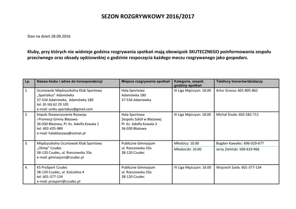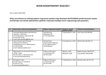 SEZON ROZGRYWKOWY 2016/2017 Stan na dzień 28.09.2016 Kluby, przy których nie widnieje godzina rozgrywania spotkań mają obowiązek SKUTECZNEGO poinformowania zespołu przeciwnego oraz obsady sędziowskiej o godzinie rozpoczęcia każdego meczu rozgrywanego jako gospodarz. Lp. Nazwa klubu i adres do korespondencji Miejsce rozgrywania spotkań Kategoria, zespół, godziny spotkań Telefony trenerów/działaczy 1. Uczniowski Międzyszkolny Klub Sportowy „Spartakus” Adamówka 37-534 Adamówka, Adamówka 180 tel. (0-16) 62 29 105 e-mail: [email protected] Impuls Stowarzyszenie Rozwoju i Promocji Gminy Błażowa 36-030 Błażowa, Pl. Ks. Adolfa Kowala 1 tel. 692-425-989 e-mail: [email protected] Hala Sportowa Adamówka 180 37-534 Adamówka III Liga Mężczyzn: 18.00 Artur Grasza: 601-805-862 Hala Sportowa Zespołu Szkół w Błażowej Pl. Ks. Adolfa Kowala 3 36-030 Błażowa III Liga Mężczyzn: 18.00 Michał Środa: 602-582-711 Międzyszkolny Uczniowski Klub Sportowy „Olimp” Czudec 38-120 Czudec, ul. Rzeszowska 33a e-mail: [email protected] Publiczne Gimnazjum ul. Rzeszowska 33a 38-120 Czudec Młodzicy: 10.00 Bogdan Kawalec: 696-029-677 Młodziczki: 10.00 Jerzy Zieliński: 509-619-966 KS ProSport Czudec 38-120 Czudec, ul. Kościelna 4 tel. 601-377-134 e-mail: [email protected] Publiczne Gimnazjum ul. Rzeszowska 33a 38-120 Czudec IV Liga Mężczyzn: 16.00 Wojciech Szela: 601-377-134 2. 3. 4. 5. KS Wisłoka Dębica 39-200 Dębica, ul. Parkowa 1 e-mail: [email protected] UKS Kępa Dębica 39-200 Dębica, ul. Wagnera 4 tel. 606-262-904 e-mail: [email protected] Hala Sportowa KS Wisłoka Dębica ul. Parkowa 1 Dom Sportu i Rehabilitacji Dębica, ul. Sportowa 26 Hala SP 10 w Dębicy Dębica, ul. Wagnera 4 7. UKS Gimnazjum Dębowiec 38-220 Dębowiec, Dębowiec 500 tel. 604-563-653 e-mail: [email protected] Publiczne Gimnazjum w Dębowcu 38-220, Dębowiec 500 8. LKS Głogovia Głogów Młp. 36-060 Głogów Młp., ul. Fabryczna 10 tel. 668-499-282 e-mail: [email protected] MKS SAN Jarosław 37-500 Jarosław, ul. Blichowa 11 tel. 515-034-960 e-mail: [email protected] 6. 9. 10. MKS MOSiR Jasło 38-200 Jasło, ul. Sikorskiego 15 tel. 793-159-195 e-mail: [email protected] 11. UKS MOSiR Jasło 38-200 Jasło, ul. Sikorskiego 15 tel. 692-502-813 e-mail: [email protected] Młodziczki: 10.00 Agnieszka Garstka: 604-073-402 IV Liga Mężczyzn: 16.00 Daniel Pająk: 609-190-614 Kadeci: 9.00 Kadetki: 9.00 Młodzicy: 9.00 Kadetki: 10.00 Młodziczki: 10.00 Łukasz Nowak: 600-168-427 Paweł Cyran: 665-774-285 Rafał Lechański: 514-375-448 Marcin Bolek: 604-563-653 Daniel Myśliwiec: 668-391-988 Samorządowe Liceum Ogólnokształcące 36-060 Głogów Młp. ul. Kard. Wyszyńskiego 2 MOSiR Jarosław 37-500 Jarosław ul. Gen. W. Sikorskiego 5 III Liga Mężczyzn: 17.00 Jakub Woś: 793-217-303 Juniorki I: Piotr Pajda: 515-034-960 Kadetki: Piotr Pajda: 515-034-960 V LO Rzeszów 35-045 Rzeszów ul. Hetmańska 38 Publiczne Gimnazjum nr 4 37-500 Jarosław ul. Kraszewskiego 39 MOSiR Jasło 38-200 Jasło ul. Sikorskiego 15 Juniorki II: Zbigniew Barszcz: 605-823-788 Młodziczki: Piotr Cholewa: 793-670-555 IV Liga Mężczyzn: 16.00 Juniorzy: 9.00 Kadeci: 11.00 Młodzicy: 10.00 Bartosz Kilar: 503-116-595 Bartosz Kilar: 503-116-595 Bartosz Kilar: 503-116-595 Sławomir Dziadosz: 507-512-630 Sala II LO w Jaśle 38-200 Jasło ul. Floriańska 24 Juniorki: 10.00 Adam Pasterz: 607-175-828 Kadetki: 10.00 Młodziczki: 10.00 Leszek Wierzgacz: 608-788-603 Leszek Wierzgacz: 608-788-603 12. 13. 14. 15. 16. 17. 18. 19. LUKS Lider Kamień 36-053 Kamień, Nowy Kamień 26 tel. 669-322-467 e-mail: [email protected] Krośnieńskie Stowarzyszenie Siatkówki Karpaty MOSiR Krosno 38-400 Krosno, ul. Bursaki 41 tel. (13) 43 68 003 e-mail: [email protected] Hala Olimpia 36-053 Kamień Nowy Kamień 26 Kadetki: 11.00 Michał Pisula: 669-322-467 Hala Sportowa 38-400 Krosno ul. Legionów 6 Juniorzy: Juniorki: Jakub Heimroth: 504-275-993 Aleksandra Guzikiewicz: 667-496-710 Kadeci: Kadetki: Młodzicy: Młodziczki: Andrzej Zajchowski: 668-307-213 Joanna Bednarczyk: 785-977-844 Marcin Błaż: 688-112-673 Joanna Bednarczyk: 785-977-844 UKS SAN Lesko 38-600 Lesko, ul. Unii Brzeskiej 3/18 e-mail: [email protected] LTS Feniks Leżajsk 37-300 Leżajsk, ul. Klasztorna 2E tel. 601-574-720 e-mail: [email protected] AS Procadia Lubaczów 37-600 Lubaczów, ul. Mickiewicza 75 tel. 668-499-917 e-mail: [email protected] MKS Łańcut 37-100 Łańcut, ul. Armii Krajowej 57 tel. 600-941-120 e-mail: [email protected] Publiczne Gimnazjum 38-600 Lesko ul. Mickiewicza 17 Zespół Szkół Licealnych 37-300 Leżajsk ul. M .Curie-Skłodowskiej 6 Juniorki: 14.00 Kadetki: 11.00 Witold Czawa: 884-947-888 Witold Czawa: 884-947-888 IV Liga Mężczyzn: 11.00 Jacek Grzywna: 606-260-440 Publiczne Gimnazjum nr 2 37-600 Lubaczów ul. Mikołaja Kopernika 22 IV Liga Mężczyzn: 16.00 Piotr Salik: 517-944-188 MOSiR Łańcut 37-100 Łańcut ul. Armii Krajowej 57 SST Gmina Łańcut „Sportur” 37-123 Handzlówka, Handzlówka 153 tel. 507-075-811 e-mail: [email protected] UKS Szóstka Mielec 39-300 Mielec, ul. Solskiego 1 tel. 531-244-535 e-mail: [email protected] Zespół Szkół w Albigowej 37-122 Albigowa Albigowa 489 Kadetki I: 10.00 Kadetki II: 10.00 Młodziczki I: Młodziczki II: IV Liga Mężczyzn: 11.00 Bogdan Dudek: 601-200-917 Bogdan Dudek: 601-200-917 Bogdan Dudek: 601-200-917 Bogdan Dudek: 601-200-917 Adam Maryniak: 501-045-646 Juniorki: 10.00 Kadetki I: 10.00 Kadetki II: 10.00 Młodziczki I: 10.00 Młodziczki II: 10.00 Roman Murdza: 509-589-841 Zbigniew Modras: 660-405-272 Łukasz Dołowacki: 665-313-384 Łukasz Dołowacki: 665-313-384 Grzegorz Cibicki: 606-635-330 Gimnazjum nr 2 39-300 Mielec ul. Grunwaldzka 7 Szkoła Podstawowa nr 6 Mielec, ul. Solskiego 8 20. 21. 22. 23. 24. 25. 26. 27. KS SMS Niebylec 38-114 Niebylec, Niebylec 163 tel. 508-088-903 e-mail: [email protected] SST Lubcza 36-047 Niechobrz, Racławówka 215 tel. (17) 87 17 525 e-mail: [email protected] Zespół 