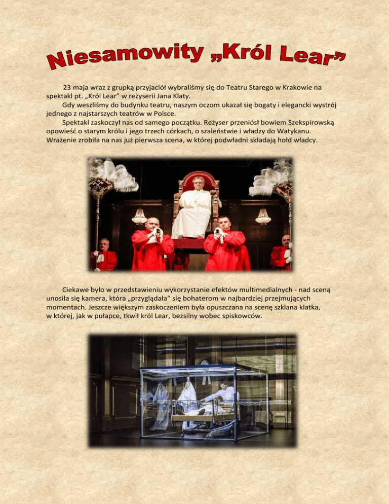 23 maja wraz z grupką przyjaciół wybraliśmy się do Teatru Starego w Krakowie na spektakl pt. „Król Lear” w reżyserii Jana Klaty. Gdy weszliśmy do budynku teatru, naszym oczom ukazał się bogaty i elegancki wystrój jednego z najstarszych teatrów w Polsce. Spektakl zaskoczył nas od samego początku. Reżyser przeniósł bowiem Szekspirowską opowieść o starym królu i jego trzech córkach, o szaleństwie i władzy do Watykanu. Wrażenie zrobiła na nas już pierwsza scena, w której podwładni składają hołd władcy. Ciekawe było w przedstawieniu wykorzystanie efektów multimedialnych - nad sceną unosiła się kamera, która „przyglądała” się bohaterom w najbardziej przejmujących momentach. Jeszcze większym zaskoczeniem była opuszczana na scenę szklana klatka, w której, jak w pułapce, tkwił król Lear, bezsilny wobec spiskowców. Przedstawienie było nie tylko piękne i świetnie zainscenizowane, ale także znakomicie zagrane. Szczególnie wyróżniał się Jerzy Grałek w roli starego króla Leara zmagającego się z własną niedołężnością i bezdusznością najbliższych. Spektakl trzymał w napięciu do samego końca i zebrał zasłużone brawa. Polecamy go wszystkim, także tym, którzy jeszcze nie zaczęli swojej przygody z teatrem. Mateusz i Igor IBb/d