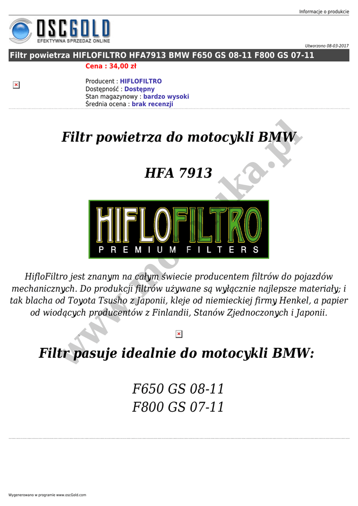 Informacje o produkcie Utworzono 08-03-2017 Filtr powietrza HIFLOFILTRO HFA7913 BMW F650 GS 08-11 F800 GS 07-11 Cena : 34,00 zł Producent : HIFLOFILTRO Dostępność : Dostępny Stan magazynowy : bardzo wysoki Średnia ocena : brak recenzji ot ol uk HFA 7913 a. pl Filtr powietrza do motocykli BMW w w .m HifloFiltro jest znanym na całym świecie producentem filtrów do pojazdów mechanicznych. Do produkcji filtrów używane są wyłącznie najlepsze materiały; i tak blacha od Toyota Tsusho z Japonii, kleje od niemieckiej firmy Henkel, a papier od wiodących producentów z Finlandii, Stanów Zjednoczonych i Japonii. w Filtr pasuje idealnie do motocykli BMW: F650 GS 08-11 F800 GS 07-11 Wygenerowano w programie www.oscGold.com