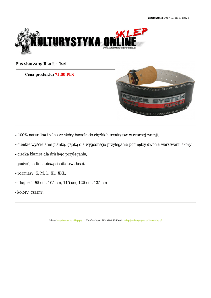 Utworzono: 2017-03-08 19:58:22 Pas skórzany Black - 1szt Cena produktu: 75,00 PLN - 100% naturalna i silna ze skóry bawoła do ciężkich treningów w czarnej wersji, - cienkie wyścielanie pianką, gąbką dla wygodnego przylegania pomiędzy dwoma warstwami skóry, - ciężka klamra dla ścisłego przylegania, - podwójna linia obszycia dla trwałości, - rozmiary: S, M, L, XL, XXL, - długości: 95 cm, 105 cm, 115 cm, 125 cm, 135 cm - kolory: czarny. Adres: http://www.ko.sklep.pl/ Telefon: kom. 782 010 880 Email: [email protected]