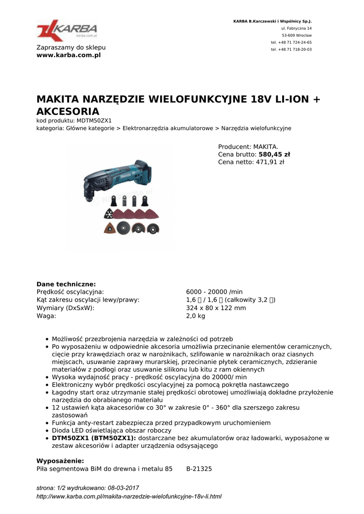 KARBA B.Karczewski i Wspólnicy Sp.J. ul. Fabryczna 14 53-609 Wrocław tel. +48 71 724-24-65 Zapraszamy do sklepu www.karba.com.pl tel. +48 71 718-20-03 MAKITA NARZĘDZIE WIELOFUNKCYJNE 18V LI-ION + AKCESORIA kod produktu: MDTM50ZX1 kategoria: Główne kategorie > Elektronarzędzia akumulatorowe > Narzędzia wielofunkcyjne Producent: MAKITA. Cena brutto: 580,45 zł Cena netto: 471,91 zł Dane techniczne: Prędkość oscylacyjna: Kąt zakresu oscylacji lewy/prawy: Wymiary (DxSxW): Waga: 6000 - 20000 /min 1,6 ゚ / 1,6 ゚ (całkowity 3,2 ゚) 324 x 80 x 122 mm 2,0 kg Możliwość przezbrojenia narzędzia w zależności od potrzeb Po wyposażeniu w odpowiednie akcesoria umożliwia przecinanie elementów ceramicznych, cięcie przy krawędziach oraz w narożnikach, szlifowanie w narożnikach oraz ciasnych miejscach, usuwanie zaprawy murarskiej, przecinanie płytek ceramicznych, zdzieranie materiałów z podłogi oraz usuwanie silikonu lub kitu z ram okiennych Wysoka wydajność pracy - prędkość oscylacyjna do 20000/ min Elektroniczny wybór prędkości oscylacyjnej za pomocą pokrętła nastawczego Łagodny start oraz utrzymanie stałej prędkości obrotowej umożliwiają dokładne przyłożenie narzędzia do obrabianego materiału 12 ustawień kąta akacesoriów co 30° w zakresie 0° - 360° dla szerszego zakresu zastosowań Funkcja anty-restart zabezpiecza przed przypadkowym uruchomieniem Dioda LED oświetlająca obszar roboczy DTM50ZX1 (BTM50ZX1): dostarczane bez akumulatorów oraz ładowarki, wyposażone w zestaw akcesoriów i adapter urządzenia odsysającego Wyposażenie: Piła segmentowa BiM do drewna i metalu 85 B-21325 strona: 1/2 wydrukowano: 08-03-2017 http://www.karba.com.pl/makita-narzedzie-wielofunkcyjne-18v-li.html mm (DTM50ZX1/ BTM50ZX1): Piła do cięcia wgłębnego BiM do drewna i metalu 25 mm (DTM50ZX1/ BTM50ZX1): Stopa szlifierska DELTA (DTM50ZX1/ BTM50ZX1): Adapter urządzenia odsysającego (DTM50ZX1/ BTM50ZX1): Adapter uniwersalny (DTM50ZX1/ BTM50ZX1): Klucz imbusowy 5 (oba modele): B-21353 B-21537 195965-0 196272-4 783233-9 strona: 2/2 wydrukowano: 08-03-2017 http://www.karba.com.pl/makita-narzedzie-wielofunkcyjne-18v-li.html