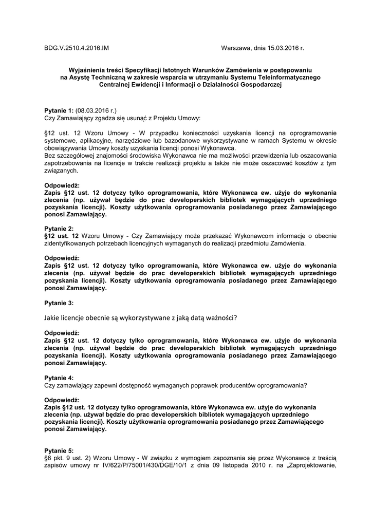 BDG.V.2510.4.2016.IM Warszawa, dnia 15.03.2016 r. Wyjaśnienia treści Specyfikacji Istotnych Warunków Zamówienia w postępowaniu na Asystę Techniczną w zakresie wsparcia w utrzymaniu Systemu Teleinformatycznego Centralnej Ewidencji i Informacji o Działalności Gospodarczej Pytanie 1: (08.03.2016 r.) Czy Zamawiający zgadza się usunąć z Projektu Umowy: §12 ust. 12 Wzoru Umowy - W przypadku konieczności uzyskania licencji na oprogramowanie systemowe, aplikacyjne, narzędziowe lub bazodanowe wykorzystywane w ramach Systemu w okresie obowiązywania Umowy koszty uzyskania licencji ponosi Wykonawca. Bez szczegółowej znajomości środowiska Wykonawca nie ma moŜliwości przewidzenia lub oszacowania zapotrzebowania na licencje w trakcie realizacji projektu a takŜe nie moŜe oszacować kosztów z tym związanych. Odpowiedź: Zapis §12 ust. 12 dotyczy tylko oprogramowania, które Wykonawca ew. uŜyje do wykonania zlecenia (np. uŜywał będzie do prac developerskich bibliotek wymagających uprzedniego pozyskania licencji). Koszty uŜytkowania oprogramowania posiadanego przez Zamawiającego ponosi Zamawiający. Pytanie 2: §12 ust. 12 Wzoru Umowy - Czy Zamawiający moŜe przekazać Wykonawcom informacje o obecnie zidentyfikowanych potrzebach licencyjnych wymaganych do realizacji przedmiotu Zamówienia. Odpowiedź: Zapis §12 ust. 12 dotyczy tylko oprogramowania, które Wykonawca ew. uŜyje do wykonania zlecenia (np. uŜywał będzie do prac developerskich bibliotek wymagających uprzedniego pozyskania licencji). Koszty uŜytkowania oprogramowania posiadanego przez Zamawiającego ponosi Zamawiający. Pytanie 3: Jakie licencje obecnie są wykorzystywane z jaką datą ważności? Odpowiedź: Zapis §12 ust. 12 dotyczy tylko oprogramowania, które Wykonawca ew. uŜyje do wykonania zlecenia (np. uŜywał będzie do prac developerskich bibliotek wymagających uprzedniego pozyskania licencji). Koszty uŜytkowania oprogramowania posiadanego przez Zamawiającego ponosi Zamawiający. Pytanie 4: Czy zamawiający zapewni dostępność wymaganych poprawek producentów oprogramowania? Odpowiedź: Zapis §12 ust. 12 dotyczy tylko oprogramowania, które Wykonawca ew. uŜyje do wykonania zlecenia (np. uŜywał będzie do prac developerskich bibliotek wymagających uprzedniego pozyskania licencji). Koszty uŜytkowania oprogramowania posiadanego przez Zamawiającego ponosi Zamawiający. Pytanie 5: §6 pkt. 9 ust. 2) Wzoru Umowy - W związku z wymogiem zapoznania się przez Wykonawcę z treścią zapisów umowy nr IV/622/P/75001/430/DGE/10/1 z dnia 09 listopada 2010 r. na „Zaprojektowanie, wykonanie i wdroŜenie Systemu teleinformatycznego CEIDG”, zwracamy się z prośbą o przesłanie na adres mailowy ……… treści w/w umowy. Odpowiedź: Treść umowy nr IV/622/P/75001/430/DGE/10/1 z dnia 09 listopada 2010 r. na „Zaprojektowanie, wykonanie i wdroŜenie Systemu teleinformatycznego CEIDG” została zamieszczona jako załącznik do odpowiedzi. Pytanie 6: Czy Zamawiający moŜe podać dotychczasowe statystyki dotyczące liczby Zgłoszeń Awarii oraz Zgłoszeń (Zleceń) Asysty Technicznej, które wystąpiły w czasie realizacji dotychczasowych umów serwisowych przedmiotowego Systemu: Awarie a) Błędy krytyczne b) Błędy powaŜne c) Usterki – Zgłoszenia (Zlecenie) Asysty Technicznej Odpowiedź: W okresie 06-11.2015 r. Zamawiający zgłosił: 1) 40 Awarii, w tym: a) Usterka - 34 b) Błąd powaŜny – 5 c) Błąd krytyczny – 1 2) 24 Zlecenia Asysty Technicznej na łączną ilość 600 osobodni. Pytanie 7: Czy Zamawiający przewiduje miesięczny ryczałt na świadczenie usługi gotowości do reakcji w ramach Usuwania Awarii przez cały rok, 7 dni w tygodniu, 24 godziny na dobę? Biorąc pod uwagę fakt, Ŝe Zamawiający nie jest zobowiązany zlecać pracy w ramach wskazanych 6000 osobodni i w przypadku niewystąpienia Ŝadnych Awarii teoretycznie moŜliwy jest scenariusz, Ŝe usługa gotowości świadczona byłaby nieodpłatnie co jest niezgodne z polskim prawem. Odpowiedź: Zamiarem Zamawiającego jest wykorzystanie maksymalnej liczby osobodni i nie przewiduje wykorzystania liczby mniejszej niŜ 3000 osobodni. Pytanie 8: Czy Zamawiający moŜe podać jakie są krytyczne godziny pracy Systemu w ciągu doby i w jakich godzinach występuje największe natęŜenie ruchu? Odpowiedź: ST CEIDG funkcjonuje w trybie 24/7/365. Największe natęŜenie ruchu występuje w dni robocze w godz. 8-16 i na koniec miesiąca kalendarzowego. Pytanie 9: Czy Zamawiający moŜe podać liczbę osób, które uprawnione będą do zgłaszania Awarii? Odpowiedź: Nie więcej niŜ 5 osób. Pytanie 10: Czy Zamawiający posiada i planuje udostępniać na potrzeby realizacji przedmiotu zamówienia środowiska testowe i developerskie do Systemu CEIDG? Odpowiedź: Tak, Zamawiający posiada i planuje udostępniać na potrzeby realizacji przedmiotu zamówienia środowiska testowe i developerskie do Systemu CEIDG. Pytanie 11: Czy Zamawiający moŜe przekazać informacje: a) b) c) d) Jakie jest otoczenie aplikacyjne i bazodanowe Systemu CEIDG? W jakiej technologii napisany jest System CEIDG? Opis biznesowy aplikacji. Czy są wymagane do utrzymania i rozwoju dodatkowe licencje? Odpowiedź: System CEIDG wykorzystuje technologie .NET, Java, MS SQL. Zgodnie z pkt. 2.4 SIWZ Zamawiający moŜe udostępnić na etapie postępowania posiadane kody źródłowe oraz posiadaną dokumentację ST CEIDG. Materiały mogą być udostępnione w siedzibie Ministerstwa Rozwoju, po uprzednim podpisaniu Oświadczenia o zachowaniu poufności. Pytanie 12: Czy System był w ostatnim roku rozwijany / zmieniany? Jeśli tak, ile (około) osobodni zostało poświęconych na wprowadzanie zmian? Odpowiedź: 24 Zlecenia Asysty Technicznej na łączną ilość 600 osobodni. Pytanie 13: W jakim wymiarze planowany jest rozwój Systemu? Odpowiedź: W 2016 r. jest planowany rozwój systemu na ok 1000 osobodni. Pytanie 14: Pytanie dotyczy zapisów SOPZ I.1.f. Kto 