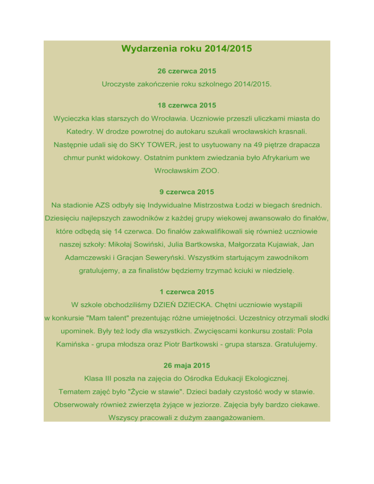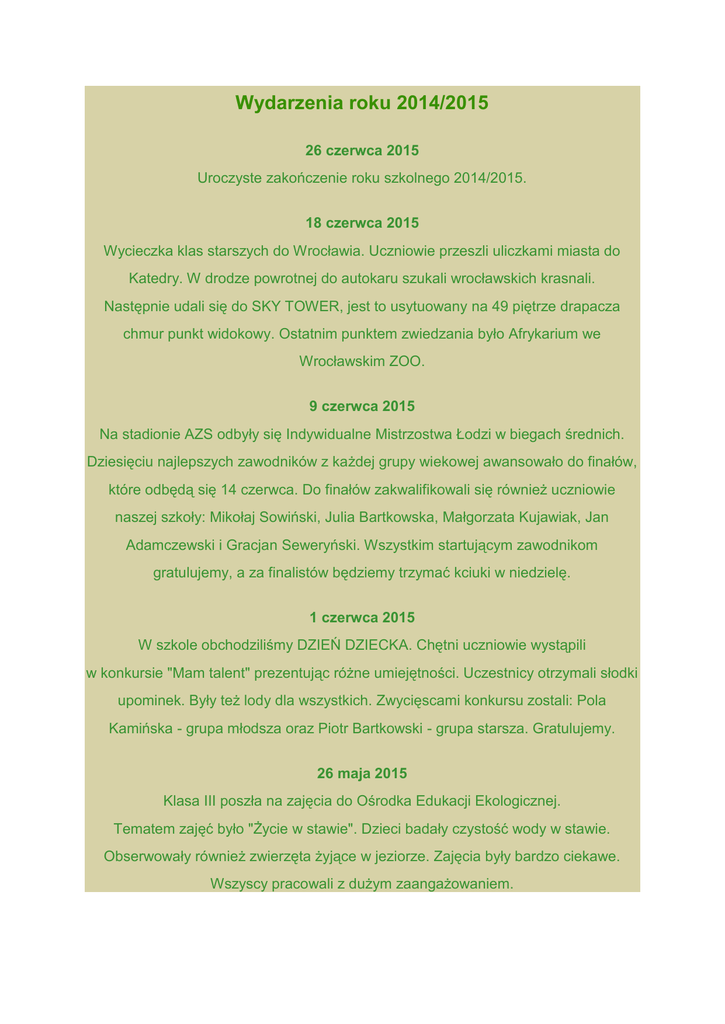 Wydarzenia roku 2014/2015 26 czerwca 2015 Uroczyste zakończenie roku szkolnego 2014/2015. 18 czerwca 2015 Wycieczka klas starszych do Wrocławia. Uczniowie przeszli uliczkami miasta do Katedry. W drodze powrotnej do autokaru szukali wrocławskich krasnali. Następnie udali się do SKY TOWER, jest to usytuowany na 49 piętrze drapacza chmur punkt widokowy. Ostatnim punktem zwiedzania było Afrykarium we Wrocławskim ZOO. 9 czerwca 2015 Na stadionie AZS odbyły się Indywidualne Mistrzostwa Łodzi w biegach średnich. Dziesięciu najlepszych zawodników z każdej grupy wiekowej awansowało do finałów, które odbędą się 14 czerwca. Do finałów zakwalifikowali się również uczniowie naszej szkoły: Mikołaj Sowiński, Julia Bartkowska, Małgorzata Kujawiak, Jan Adamczewski i Gracjan Seweryński. Wszystkim startującym zawodnikom gratulujemy, a za finalistów będziemy trzymać kciuki w niedzielę. 1 czerwca 2015 W szkole obchodziliśmy DZIEŃ DZIECKA. Chętni uczniowie wystąpili w konkursie "Mam talent" prezentując różne umiejętności. Uczestnicy otrzymali słodki upominek. Były też lody dla wszystkich. Zwycięscami konkursu zostali: Pola Kamińska - grupa młodsza oraz Piotr Bartkowski - grupa starsza. Gratulujemy. 26 maja 2015 Klasa III poszła na zajęcia do Ośrodka Edukacji Ekologicznej. Tematem zajęć było "Życie w stawie". Dzieci badały czystość wody w stawie. Obserwowały również zwierzęta żyjące w jeziorze. Zajęcia były bardzo ciekawe. Wszyscy pracowali z dużym zaangażowaniem. 21 maja 2015 Uczniowie kl. II i IV wybrali się na wycieczkę do Kłodawy i Łęczycy. Pierwszą atrakcją był zjazd windą 600 metrów pod ziemię z prędkością 6m/s. Następnie pan przewodnik oprowadził nas tajemniczymi tunelami opowiadając wiele ciekawych historii i legend. Widzieliśmy komnatę Drakuli, ładunki wybuchowe, wózki pełne soli, przepiękną Kaplicę św. Kingi, a w niej tablicę ku pamięci zmarłych górników oraz figurkę patronki wykonaną z soli. Obejrzeliśmy również w wykuwanej przez dwa lata komorze solnej scenę, na której pobito rekord Guinesa w koncercie zagranym najniżej pod ziemią. Najbardziej podobał nam się korytarz zwany strefą wolnego lizania. Mogliśmy tam polizać ściany i przekonać się, że na prawdę są z soli. Na koniec naszej wizyty w kopalni każdy mógł wybrać sobie bryłkę odłamków solnych, by wziąć ją na pamiątkę z wycieczki, która dostarczyła nam mnóstwo wrażeń. Następnie udaliśmy się do zamku królewskiego w Łęczycy. Uczniowie wędrując po Zamku oglądali ciekawe przedmioty codziennego użytku, dowiadywali się do czego one służyły i przez kogo zostały wykonane. Poznali również legendę o diable Borucie. 12 maja 2015 Uczniowie klasy trzeciej pojechali na wycieczkę do Gniezna, Wenecji i Biskupina. W Gnieźnie zwiedzili Katedrę z relikwiami św. Wojciecha. Następnie przejechali do Wenecji, skąd kolejką wąskotorową ruszyli w podróż do Biskupina. Po drodze podziwiali widok na Jezioro Biskupińskie ze zrekonstruowaną osadą. Zwiedzając muzeum uczniowie zapoznali się z historią osady oraz historią wykopalisk archeologicznych w Biskupinie. Poznali warunki życia ówczesnych ludzi, ich zwyczaje, obrządkowość, stroje oraz okoliczności powstania, rozwoju i upadku osady. Na koniec wzięli udział w lekcji muzealnej "Lepienie naczyń z gliny". 17 kwietnia 2015 Uczniowie klasy czwartej wzięli udział w IV Przeglądzie Twórczości Dzieci i Młodzieży ze Szkół Promujących Zdrowie pod hasłem: "Na ochronie środowiska Twoje zdrowie zyska"! Grupa czwartoklasistów w składzie: Maria Bukszyńska, Maria Suszek, Nadia Steglińska, Zuzanna Zawadzka, Agata Romanowska oraz Filip Kaczmarek zaprezentowali skecz pt: "Dobrze jemy, zdrowo żyjemy". Zdobyli Dyplom dla Szkoły. Gratulujemy! 8 kwietnia 2015 Uczniowie klasy IV i V uczestniczyli w interaktywnych warsztatach telewizyjnych "Świat fantasy". 8 kwietnia 2015 Uczniowie klas "0" - III uczestniczyli w interaktywnych warsztatach telewizyjnych 30 marca 2015 Klasa III i IV pojechały do Konarzewa na warsztaty wikliniarskie. Podczas trwania zajęć uczniowie dowiedzieli się skąd się bierze wiklina, w jaki sposób przygotowuje się ją do wyplatania, a także co może z niej powstać. Na koniec wszyscy zmierzyli się z trudną sztuką wyplatania. marzec 2015 Uczniowie klasy trzeciej realizowali kolejne zadania projektu "Zdrowo jem, więcej wiem". Wzięli udział w zajęciach edukacyjnych "Woda na zdrowie", podczas których dowiedzieli się jakie znaczenie ma woda dla ludzi, zwierząt i roślin. Wykonali "Wodolubka" - stworka, który ma zachęcać do picia wody, a następnie zorganizowali na korytarzu szkolnym wystawę "Wodolubków". Przygotowali również inscenizację "Niech żyje król ziemniak!". Teatrzyk został zaprezentowany dzieciom z kl. "0" i I. 23-25 marca 2015 Odbyły się REKOLEKCJE WIELKOPOSTNE. 16 marca 2015 Uczniowie kl. III uczestniczyli w zajęciach profilaktycznych dotyczących zdrowego odżywiania, aktywnego wypoczynku i higieny osobistej. Zajęcia prowadziły panie z Miejskiego Centrum Zdrowia Publicznego. 13 marca 2015 Uczeń klasy III - Szymon Stefaniak - zdobył III miejsce w konkursie plastycznym "Wspólnie dbamy o naszą planetę". Serdecznie gratulujemy! Dziś Szymon odebrał dyplom i nagrodę rzeczową. 4 marca 2015 Odbyły się kolejne DNI OTWARTE w naszej szkole. Przyszli uczniowie spędzili miło czas biorąc udział w zabawach integracyjnych, a rodzice uczestniczyli w spotkaniu z panem dyrektorem, pedagogiem szkolnym i przyszłymi wychowawcami klasy I i "0". Dla gości przygotowany był poczęstunek - zdrowe kanapki i ciasteczka. Uczniowie klasy III przygotowali przedstawienie pt. "Brzydkie kaczątko". 17 luty 2015 Odbyły się DNI OTWARTE w naszej szkole. Przyszli uczniowie spędzili miło czas na Zabawie Karnawałowej, a rodzice odbyli spotkanie z panem dyrektorem, pedagogiem szkolnym i przyszłymi wychowawc