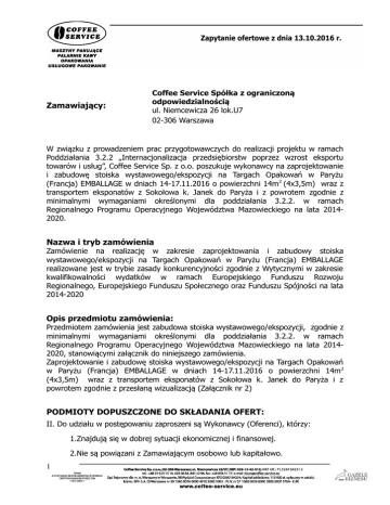 Zapytanie ofertowe z dnia 13.10.2016 r. Zamawiający: Coffee Service Spółka z ograniczoną odpowiedzialnością ul. Niemcewicza 26 lok.U7 02-306 Warszawa W związku z prowadzeniem prac przygotowawczych do realizacji projektu w ramach Poddziałania 3.2.2 „Internacjonalizacja przedsiębiorstw poprzez wzrost eksportu towarów i usług”, Coffee Service Sp. z o.o. poszukuje wykonawcy na zaprojektowanie i zabudowę stoiska wystawowego/ekspozycji na Targach Opakowań w Paryżu (Francja) EMBALLAGE w dniach 14-17.11.2016 o powierzchni 14m 2 (4x3,5m) wraz z transportem eksponatów z Sokołowa k. Janek do Paryża i z powrotem zgodnie z minimalnymi wymaganiami określonymi dla poddziałania 3.2.2. w ramach Regionalnego Programu Operacyjnego Województwa Mazowieckiego na lata 20142020. Nazwa i tryb zamówienia Zamówienie na realizację w zakresie zaprojektowania i zabudowy stoiska wystawowego/ekspozycji na Targach Opakowań w Paryżu (Francja) EMBALLAGE realizowane jest w trybie zasady konkurencyjności zgodnie z Wytycznymi w zakresie kwalifikowalności wydatków w ramach Europejskiego Funduszu Rozwoju Regionalnego, Europejskiego Funduszu Społecznego oraz Funduszu Spójności na lata 2014-2020 Opis przedmiotu zamówienia: Przedmiotem zamówienia jest zabudowa stoiska wystawowego/ekspozycji, zgodnie z minimalnymi wymaganiami określonymi dla poddziałania 3.2.2. w ramach Regionalnego Programu Operacyjnego Województwa Mazowieckiego na lata 20142020, stanowiącymi załącznik do niniejszego zamówienia. Zaprojektowanie i zabudowę stoiska wystawowego/ekspozycji na Targach Opakowań w Paryżu (Francja) EMBALLAGE w dniach 14-17.11.2016 o powierzchni 14m 2 (4x3,5m) wraz z transportem eksponatów z Sokołowa k. Janek do Paryża i z powrotem zgodnie z przesłaną wizualizacją (Załącznik nr 2) PODMIOTY DOPUSZCZONE DO SKŁADANIA OFERT: II. Do udziału w postępowaniu zaproszeni są Wykonawcy (Oferenci), którzy: 1.Znajdują się w dobrej sytuacji ekonomicznej i finansowej. 2.Nie są powiązani z Zamawiającym osobowo lub kapitałowo. 1 Zapytanie ofertowe z dnia 13.10.2016 r. 3.Posiadają niezbędną wiedzę i doświadczenie oraz dysponują potencjałem technicznym i osobami zdolnymi do wykonania zamówienia w wyznaczonym terminie III. Powyższe zweryfikowane będzie na podstawie Części A wypełnionego załącznika nr 1 do Zapytania Ofertowego oraz oceniane będzie na zasadzie spełnia/nie spełnia. Wyłącznie oferty Wykonawców spełniających wszystkie ww. warunki zostaną ocenione wg kryteriów oceny ofert opisanych poniżej. Wykonawcy, którzy nie wykażą spełnienia warunków udziału w postępowaniu podlegają wykluczeniu. WYBÓR NAJKORZYSTNIEJSZEJ OFERTY: IV. Oferty zostaną ocenione według kryterium: 1.Cena – 100% W ramach tego kryterium można uzyskać 100 pkt. Oferty które wpłyną w ramach postępowania zostaną ułożone od ceny najniższej do najwyżej. Oferta najniższa otrzyma 100 pkt., oferta najwyższa – 0 pkt. Ofertom znajdującym się pomiędzy skrajnymi ofertami będą nadawane punkty proporcjonalnie do oferty najniższej. Sposób wyliczania liczby punktów za kryterium cena 1.jeżeli oferta jest najkorzystniejsza lub równa ofercie najkorzystniejszej – otrzymuje maksymalną liczbę punktów równą wadze kryterium 2.jeżeli wszystkie oferty są równe – wszystkie otrzymują maksymalną liczbę punktów równą wadze kryterium 3.jeżeli złożona oferta jest ofertą wyższą niż oferta najkorzystniejsza jej wartość punktowa obliczana jest w sposób następujący: Kx = (Cmin / Cx) * 100 pkt gdzie: Kx – liczba punktów przyznana ocenianej ofercie w ramach kryterium cena brutto za realizację całego zamówienia, Cmin – najniższa cena brutto zaoferowana w ofertach złożonych na realizację zamówienia, Cx – cena brutto oferty ocenianej złożonej na realizację zamówienia. OFERTA V. Oferta powinna zostać złożona na formularzu oferty (Załącznik nr 1 do zapytania ofertowego). 2 Zapytanie ofertowe z dnia 13.10.2016 r. WAŻNOŚĆ OFERTY: VI. Oferta powinna być ważna do 31.12.2016. roku. VII. Oferta powinna być opatrzona pieczątką firmową (jeśli dotyczy), posiadać datę sporządzenia i podpis osoby sporządzającej Ofertę. VIII. Oferta (podpisana i zeskanowana) może być przekazana pocztą elektroniczną na adres: e-mail: [email protected]; pocztą na adres Zamawiającego ul. Niemcewicza 26 lok.U7, 02-306 Warszawa lub osobiście na adres Zamawiającego. IX. Termin składania ofert (wpłynięcia ich do siedziby Zamawiającego lub na wskazany adres email), upływa w dniu 20.10.2016 r. o godzinie 12:00. INNE INFORMACJE: X. Zapytanie ofertowe umieszczono na stronie internetowej Spółki. XI. Zamawiający zastrzega możliwość dokonywania zmian w ogłoszeniu lub warunkach zamówienia. O każdej zmianie oferenci zostaną powiadomieni za pośrednictwem strony internetowej Spółki. XII. Zamawiający zastrzega sobie prawo do unieważnienia postępowania na każdym etapie postępowania lub do pozostawienia postępowania bez rozstrzygnięcia. XIII. Zamawiający nie dopuszcza składania ofert cząstkowych. XIV. Zamawiający zastrzega sobie prawo do możliwości negocjacji ceny, sposobu oraz zakresu realizacji oferowanych prac z oferentem który złoży najkorzystniejszą ofertę. XV. Wszelka korespondencja z oferentami będzie prowadzona w języku polskim. Dokumenty sporządzone w języku obcym powinny być poprawnie przetłumaczone przez zgłaszającego na język polski. XVI. Informacja nt. wyników postepowania umieszczona zostanie na stronie internetowej Spółki oraz wysłana do każdego Oferenta spełniającego warunki dostępu do udziału w postępowaniu. REZYGNACJA ZE WSPÓŁPRACY W przypadku rezygnacji lub wykluczenia Wykonawcy z jednej lub wielu usług, Zamawiający będzie kierował zamówienia do Wykonawcy, który złożył kolejną najkorzystniejszą ofertę (Zamawiający zastrzega sobie możliwość negocjacji ceny, sposobu oraz zakresu realiza