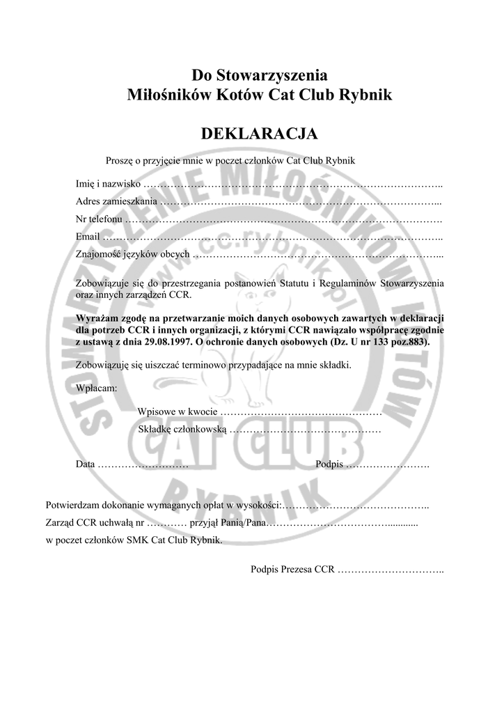 Do Stowarzyszenia Miłośników Kotów Cat Club Rybnik DEKLARACJA Proszę o przyjęcie mnie w poczet członków Cat Club Rybnik Imię i nazwisko …………………………………………………………………………….. Adres zamieszkania ………………………………………………………………………... Nr telefonu …………………………………………………………………………………. Email ……………………………………………………………………………………….. Znajomość języków obcych ………………………………………………………………... Zobowiązuje się do przestrzegania postanowień Statutu i Regulaminów Stowarzyszenia oraz innych zarządzeń CCR. Wyrażam zgodę na przetwarzanie moich danych osobowych zawartych w deklaracji dla potrzeb CCR i innych organizacji, z którymi CCR nawiązało współpracę zgodnie z ustawą z dnia 29.08.1997. O ochronie danych osobowych (Dz. U nr 133 poz.883). Zobowiązuję się uiszczać terminowo przypadające na mnie składki. Wpłacam: Wpisowe w kwocie ………………………………………… Składkę członkowską ……………………………………… Data ……………………… Podpis ……………………. Potwierdzam dokonanie wymaganych opłat w wysokości:…………………………………….. Zarząd CCR uchwałą nr ………… przyjął Panią/Pana………………………………............ w poczet członków SMK Cat Club Rybnik. Podpis Prezesa CCR …………………………..