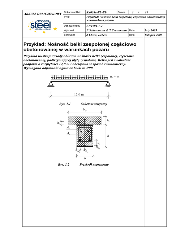 ARKUSZ OBLICZENIOWY Dokument Ref: SX038a-PL-EU Tytuł Przykład: Nośność belki zespolonej częściowo obetonowanej w warunkach poŜaru Dot. Eurokodu EN1994-1-2 Wykonał P Schaumann & T Trautmann Data luty 2005 Sprawdził J Chica, Labein listopad 2005 Strona 1 Data Przykład: Nośność belki zespolonej częściowo obetonowanej w warunkach poŜaru Przykład ilustruje zasady obliczeń nośności belki zespolonej, częściowo obetonowanej, podtrzymującej płytę zespoloną. Belka jest swobodnie podparta o rozpiętości 12,0 m i obciąŜona w sposób równomierny. Wymagana odporność ogniowa belki to R90. Rys. 1.1 Rys. 1.2 Schemat statyczny Przekrój poprzeczny z 10 ARKUSZ OBLICZENIOWY Dokument Ref: SX038a-PL-EU Tytuł Przykład: Nośność belki zespolonej częściowo obetonowanej w warunkach poŜaru Dot. Eurokodu EN1994-1-2 Wykonał P Schaumann & T Trautmann Data luty 2005 Sprawdził J Chica, Labein listopad 2005 Dane podstawowe Właściwości materiałowe: Belka: Kształtownik: IPE 500 Gatunek stali: S 355 Wysokość: h = 500 mm Szerokość: b = 200 mm Grubość środnika: ew = 10,2 mm Grubość pasa: ef = 16 mm Pole przekroju poprzecznego: Aa = 11600 mm 2 Granica plastyczności: f y, a = 355 N/mm 2 Płyta: Klasa betonu: C 25/30 Wysokość: hc = 160 mm Szerokość efektywna: beff = 3000 mm Wytrzymałość na ściskanie: f c = 25 N/mm 2 Blacha profilowana: Rodzaj: z wklęsłymi naroŜami Wysokość: ha = 51 mm Zbrojenie w części obetonowanej: Gatunek stali: B 500 Średnica: 2 Ø 32 Pole przekroju poprzecznego: As = 1410 mm 2 Rozstaw: u1 = 110 mm us1 = 60 mm Granica plastyczności: f y, s = 500 N/mm 2 Strona 2 Data z 10 ARKUSZ OBLICZENIOWY Dokument Ref: SX038a-PL-EU Tytuł Przykład: Nośność belki zespolonej częściowo obetonowanej w warunkach poŜaru Dot. Eurokodu EN1994-1-2 Wykonał P Schaumann & T Trautmann Data luty 2005 Sprawdził J Chica, Labein listopad 2005 Strona 3 z Data Beton pomiędzy pasami: Klasa betonu: C 25/30 szerokość: bc = 200 mm Wytrzymałość na ściskanie: f c = 25 N/mm 2 ObciąŜenie: Oddziaływania stałe: CięŜar własny: g s, k = 15,0 kN/m CięŜar warstw wykończenia: g f, k = 6,0 kN/m Oddziaływania zmienne: ObciąŜenie uŜytkowe: pk = 30,0 kN/m Nośność w warunkach poŜaru belki zespolonej składającej się z belki stalowej i częściowego obetonowania Oddziaływania mechaniczne podczas działania poŜaru Oddziaływania w sytuacji poŜarowej są klasyfikowane jako wyjątkowa sytuacja obliczeniowa: EdA = E (∑ Gk + Ad + ∑ψ 2,1Qk, i ) Współczynnik kombinacyjny dla wiodącego oddziaływania zmiennego w przypadku magazynu wynosi ψ2,1 = 0.8. Obliczeniowy moment zginający w warunkach działania poŜaru moŜe być obliczony jako: M fi, d = ((15,0 + 6,0 ) + 0,8 × (30,0 ))× 12,0 2 = 810,0 kN 8 Weryfikacja z zastosowaniem prostego modelu obliczeniowego Nośność w warunkach poŜaru belki zespolonej sprawdzono korzystając z prostego modelu obliczeniowego, zgodnie z PN-EN 1994-1-2§4.3.4.3 oraz Załącznikiem F. 10 ARKUSZ OBLICZENIOWY Dokument Ref: SX038a-PL-EU Tytuł Przykład: Nośność belki zespolonej częściowo obetonowanej w warunkach poŜaru Dot. Eurokodu EN1994-1-2 Wykonał P Schaumann & T Trautmann Data luty 2005 Sprawdził J Chica, Labein listopad 2005 Strona 4 z Data Aby zastosować taki model, płyta powinna posiadać grubość hc nie mniejszą od minimalnej. Dodatkowo belka stalowa powinna być nie niŜsza od minimalnej wysokości przekroju h i nie mniejsza od minimalnej szerokości bc a przekrój belki powinien być nie mniejszy od przekroju minimalnego h · bc. Minimalne wymiary podane w Tablicy 4.8 i Tablicy F.8 są przedstawione w Tablicy 1.1 poniŜej. Tablica 1.1 Minimalne wymiary do stosowania w przypadku prostych modeli obliczeniowych belek zespolonych z częściowym obetonowaniem (por. PN-EN 1994-1-2, Tablica 4.8 oraz Tablica F.8) Standardowa odporność ogniowa Minimalna grubość płyty hc [mm] Minimalna wysokość profilu h i minimalna szerokość bc [mm] Minimalna powierzchnia hxbc [mm²] R 30 60 120 17500 R 60 80 150 24000 R 90 100 170 35000 R 120 120 200 50000 R 180 150 250 80000 hc = 160 mm > 100 mm h = 500 mm > 170 mm b = bc = 200 mm > 170 mm h × bc = 100000 mm 2 > 35000 mm 2 Załącznik F PN-EN1994-1-2 podaje model obliczeniowy dla elementów częściowo obetonowanych, dla standardowych odporności ogniowych. Aby obliczyć nośność przekroju w czasie wymaganego działania poŜaru, przekrój dzieli się na części, dla których wyznacza się udział w całościowej nośności. W niektórych przypadkach jest to osiągane przez stosowanie współczynnika redukcyjnego do granicy plastyczności, a w innych przez obliczanie zredukowanego przekroju efektywnego. Rozpatrując nośność przy podłuŜnym ścinaniu według PN-EN1994-1-2 §4.3.4.3.1(5), zakłada się, Ŝe nośność na ścinanie łączników spawanych do górnej półki nie ulega redukcji. 10 ARKUSZ OBLICZENIOWY Dokument Ref: SX038a-PL-EU Tytuł Przykład: Nośność belki zespolonej częściowo obetonowanej w warunkach poŜaru Dot. Eurokodu EN1994-1-2 Wykonał P Schaumann & T Trautmann Data luty 2005 Sprawdził J Chica, Labein listopad 2005 Strona 5 z Data Rys. 1.2 Zredukowane pole przekroju poprzecznego do obliczenia plastycznej nośności przy zginaniu oraz rozkład napręŜeń w stali (A) i w Ŝelbecie (B) Nagrzewanie betonowej płyty jest uwzględniane przez redukcję pola przekroju poprzecznego. W przypadku róŜnych klas odporności ogniowej, redukcja grubości płyty betonowej podana jest w Tablicy 1.2. W przypadku płyt zespolonych wykonanych na blasze profilowej o wklęsłych naroŜach redukcja grubości nie moŜe być mniejsza niŜ wysokość profilu w szalunku hc,fi,min. hc, fi = 30 mm hc, fi, min = 51 mm W analizowanym przypadku grubość płyty rozwaŜana podczas działania poŜaru hc,h wynosi: hc,h = 160 − 51 = 109 mm 10 ARKUSZ OBLICZENIOWY Tablica 1.2 Dokument Ref: SX038a-PL-EU Tytuł Przykład: Nośność belki zespolonej częściowo 