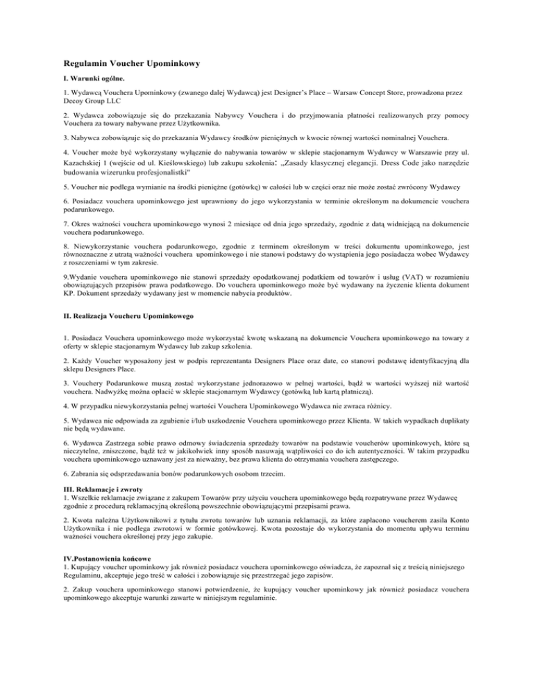 Regulamin Voucher Upominkowy I. Warunki ogólne. 1. Wydawcą Vouchera Upominkowy (zwanego dalej Wydawcą) jest Designer’s Place – Warsaw Concept Store, prowadzona przez Decoy Group LLC 2. Wydawca zobowiązuje się do przekazania Nabywcy Vouchera i do przyjmowania płatności realizowanych przy pomocy Vouchera za towary nabywane przez Użytkownika. 3. Nabywca zobowiązuje się do przekazania Wydawcy środków pieniężnych w kwocie równej wartości nominalnej Vouchera. 4. Voucher może być wykorzystany wyłącznie do nabywania towarów w sklepie stacjonarnym Wydawcy w Warszawie przy ul. Kazachskiej 1 (wejście od ul. Kieślowskiego) lub zakupu szkolenia: „Zasady klasycznej elegancji. Dress Code jako narzędzie budowania wizerunku profesjonalistki" 5. Voucher nie podlega wymianie na środki pieniężne (gotówkę) w całości lub w części oraz nie może zostać zwrócony Wydawcy 6. Posiadacz vouchera upominkowego jest uprawniony do jego wykorzystania w terminie określonym na dokumencie vouchera podarunkowego. 7. Okres ważności vouchera upominkowego wynosi 2 miesiące od dnia jego sprzedaży, zgodnie z datą widniejącą na dokumencie vouchera podarunkowego. 8. Niewykorzystanie vouchera podarunkowego, zgodnie z terminem określonym w treści dokumentu upominkowego, jest równoznaczne z utratą ważności vouchera upominkowego i nie stanowi podstawy do wystąpienia jego posiadacza wobec Wydawcy z roszczeniami w tym zakresie. 9.Wydanie vouchera upominkowego nie stanowi sprzedaży opodatkowanej podatkiem od towarów i usług (VAT) w rozumieniu obowiązujących przepisów prawa podatkowego. Do vouchera upominkowego może być wydawany na życzenie klienta dokument KP. Dokument sprzedaży wydawany jest w momencie nabycia produktów. II. Realizacja Voucheru Upominkowego 1. Posiadacz Vouchera upominkowego może wykorzystać kwotę wskazaną na dokumencie Vouchera upominkowego na towary z oferty w sklepie stacjonarnym Wydawcy lub zakup szkolenia. 2. Każdy Voucher wyposażony jest w podpis reprezentanta Designers Place oraz date, co stanowi podstawę identyfikacyjną dla sklepu Designers Place. 3. Vouchery Podarunkowe muszą zostać wykorzystane jednorazowo w pełnej wartości, bądź w wartości wyższej niż wartość vouchera. Nadwyżkę można opłacić w sklepie stacjonarnym Wydawcy (gotówką lub kartą płatniczą). 4. W przypadku niewykorzystania pełnej wartości Vouchera Upominkowego Wydawca nie zwraca różnicy. 5. Wydawca nie odpowiada za zgubienie i/lub uszkodzenie Vouchera upominkowego przez Klienta. W takich wypadkach duplikaty nie będą wydawane. 6. Wydawca Zastrzega sobie prawo odmowy świadczenia sprzedaży towarów na podstawie voucherów upominkowych, które są nieczytelne, zniszczone, bądź też w jakikolwiek inny sposób nasuwają wątpliwości co do ich autentyczności. W takim przypadku vouchera upominkowego uznawany jest za nieważny, bez prawa klienta do otrzymania vouchera zastępczego. 6. Zabrania się odsprzedawania bonów podarunkowych osobom trzecim. III. Reklamacje i zwroty 1. Wszelkie reklamacje związane z zakupem Towarów przy użyciu vouchera upominkowego będą rozpatrywane przez Wydawcę zgodnie z procedurą reklamacyjną określoną powszechnie obowiązującymi przepisami prawa. 2. Kwota należna Użytkownikowi z tytułu zwrotu towarów lub uznania reklamacji, za które zapłacono voucherem zasila Konto Użytkownika i nie podlega zwrotowi w formie gotówkowej. Kwota pozostaje do wykorzystania do momentu upływu terminu ważności vouchera określonej przy jego zakupie. IV.Postanowienia końcowe 1. Kupujący voucher upominkowy jak również posiadacz vouchera upominkowego oświadcza, że zapoznał się z treścią niniejszego Regulaminu, akceptuje jego treść w całości i zobowiązuje się przestrzegać jego zapisów. 2. Zakup vouchera upominkowego stanowi potwierdzenie, że kupujący voucher upominkowy jak również posiadacz vouchera upominkowego akceptuje warunki zawarte w niniejszym regulaminie.