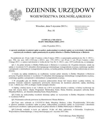 DZIENNIK URZĘDOWY WOJEWÓDZTWA DOLNOŚLĄSKIEGO Wrocław, dnia 9 stycznia 2015 r. Elektronicznie podpisany przez: Agnieszka Augustynowicz Data: 2015-01-09 11:20:43 Poz. 81 UCHWAŁA NR 4/26/14 RADY MIEJSKIEJ BIELAWY z dnia 30 grudnia 2014 r. w sprawie ustalenia wysokości opłat za pobyt, maksymalnej wysokości opłaty za wyżywienie i określenia częściowych zwolnień z opłat ponoszonych za pobyt dziecka w Żłobku Publicznym w Bielawie Na podstawie art. 18 ust. 2 pkt 15 ustawy z dnia 8 marca 1990 r. o samorządzie gminnym (tj. Dz. U. 2013 r., poz. 594, zm. poz. 645 i 1318 oraz z 2014 r. poz. 379 i 1072.) i art. 58 ust. 1 i art. 59 ust. 2 ustawy z dnia 4 lutego 2011 r. o opiece nad dziećmi w wieku do lat 3 (tj. Dz. U. 2013 r., poz. 1457) uchwala się, co następuje: § 1. 1. Za pobyt dziecka w Żłobku Publicznym w Bielawie w wymiarze do 10 godzin dziennie, ustala się opłatę w wysokości 0,1% aktualnie obowiązującego minimalnego wynagrodzenia za pracę, ustalonego zgodnie z przepisami o minimalnym wynagrodzeniu za pracę, za każdą godzinę świadczeń żłobka realizowaną na rzecz dziecka. 2. Ustala się opłatę dodatkową za wydłużony wymiar pobyt dziecka w Żłobku Miejskim w Bielawie powyżej 10 godzin dziennie w wysokości 1% aktualnie obowiązującego minimalnego wynagrodzenia za pracę, ustalonego zgodnie z przepisami o minimalnym wynagrodzeniu za pracę. 3. W przypadku gdy do Żłobka uczęszcza jednocześnie dwoje lub więcej dzieci z jednej rodziny, na pisemny wniosek rodziców (opiekunów prawnych) skierowany do dyrektora placówki, opłatę określoną w ust. 1 obniża się o 50% za drugie i każde następne dziecko. 4. Opłatę, o której mowa w ust. 1 obniża się o 50 % na każde dziecko z rodziny, w której wychowuje się troje lub więcej dzieci, objętej Programem Bielawskiej Karty Dużej Rodziny przyjętym uchwałą Rady Miejskiej Bielawy, po okazaniu aktualnej Karty Dużej Rodziny. § 2. Ustala się maksymalną wysokość dziennej opłaty za wyżywienie w Żłobku Miejskim w Bielawie w wysokości 8,00 zł. § 3. Wykonanie uchwały powierza się Burmistrzowi Miasta Bielawa. § 4. Traci moc uchwała nr LVI/555/14 Rady Miejskiej Bielawy z dnia 29 października 2014 roku w sprawie ustalenia wysokości opłat za pobyt, maksymalnej wysokości opłaty za wyżywienie i określenia częściowych zwolnień z opłat ponoszonych za pobyt dziecka w Żłobku Publicznym w Bielawie. § 5. Uchwała wchodzi w życie po upływie 14 dni od dnia ogłoszenia w Dzienniku Urzędowym, Województwa Dolnośląskiego, z mocą obowiązującą od 1 stycznia 2015 roku. Przewodniczący Rady Miejskiej: Z. Dragan