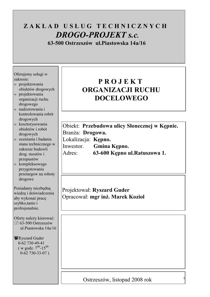ZAKŁAD USŁUG TECHNICZNYCH DROGO-PROJEKT s.c. 63-500 Ostrzeszów ul.Piastowska 14a/16 Oferujemy usługi w zakresie: • projektowania obiektów drogowych • projektowania organizacji ruchu drogowego • nadzorowania i kontrolowania robót drogowych • kosztorysowania obiektów i robót drogowych • oceniania i badania stanu technicznego w zakresie budowli drog. mostów i przepustów • kompleksowego przygotowania przetargow na roboty drogowe Posiadamy niezbędną wiedzę i doświadczenia aby wykonać pracę szybko,tanio i profesjonalnie. PROJEKT ORGANIZACJI RUCHU DOCELOWEGO Obiekt: Przebudowa ulicy Słonecznej w Kępnie. BranŜa: Drogowa. Lokalizacja: Kępno. Inwestor. Gmina Kępno. Adres: 63-600 Kępno ul.Ratuszowa 1. Projektował: Ryszard Guder Opracował: mgr inŜ. Marek Kozioł Oferty naleŜy kierować: 63-500 Ostrzeszów ul.Piastowska 14a/16 Ryszard Guder 0-62 730-49-41 ( w godz. 700-1500 0-62 730-33-07 ) Ostrzeszów, listopad 2008 rok 1 Zawartość projektu 1.Projekt organizacji ruchu docelowego – opis techniczny. 2.Część rysunkowa: • Projekt organizacji ruchu docelowego - rys. nr 1. Opis techniczny do projektu organizacji ruchu docelowego na ul. Słonecznej w Kępnie. 1.Dane ogólne. Opracowanie projektu nastąpiło na zlecenie Inwestora. Podstawę opracowania stanowiły: • pomiary sytuacyjno-wysokościowe wykonane przez projektanta w terenie we własnym zakresie, • mapa sytuacyjno-wysokościowa miasta Kępno w skali 1:500, • Dz.U. nr 220poz. 2118 z 23 grudnia 2003r. szczegółowe warunki techniczne dla znaków i sygnałów drogowych oraz urządzeń bezpieczeństwa ruchu drogowego i warunki ich umieszczenia na drogach. 2. Inwentaryzacja istniejącego oznakowania. Droga gminna – ul. Słoneczna w miejscowości Kępno posiada oznakowanie pionowe w postaci jednego znaku A-7 umiejscowionego przed skrzyŜowaniem z ul.Wrocławską. Oznakowanie poziome to jedynie wymalowane przejście dla pieszych przed skrzyŜowaniem z ul. Wrocławską. Istniejące oznakowanie ul. Słonecznej uwzględniono w projekcie oznakowania docelowego. 2 3. Wprowadzenie oznakowania zgodnego z projektem ( rys. nr 1 ) szacuje się na wrzesień-październik 2009r. 4. Zestawienie oznakowania. Znaki pionowe: A-7 - 4szt. C-13/16 - 4szt. C-13/16 - 2szt. D-1 - 2szt. D-6 - 9szt. T-6a - 2szt. T-6c - 2szt. Słupki metalowe – 15szt. Oznakowanie poziome: • 5 przejść dla pieszych wymalowanych liniami P10 szer. 4m – powierzchni malowania łącznie – 60m2. • Linie P1e – (20,00+20,00+5,00+9,00+13,00+8,00+12,00+5,00+ 5,00+8,00+7,00+15,00+5,00+5,00+8,00+5,00+5,00+5,00) x 0,12m2/mb = 19,2m2 • Linie P2b – (249,00+19,00+13,00+16,00+10,00+4,00+98,00+ 25,00+11,00+8,00)x0,24m2/mb = 108,72m2 • Linie P4 – (20,00+20,00+11,00+6,00+20,00+11,00+19,00 +19,00+15,00+4,00+12,00+9,00+5,00)x0,24m2/mb = 41,04m2 • Linie P6 – (79,00+222,00) x 0,08m2/mb = 24,08m2 • Linie P7c – 0,06m2/1mb x 32mb = 1,92m2 • Linie P13 – (5,00+3,00+3,00+5,00+3,00+8,00)x0,2625m2/mb = 7,09m2 • Linia P14 – 3,00 x 0,375m2/mb = 1,125 m2 • Linie P21 – 6,50m2x2,50m2x0,38m2/m2=6,175m2 5. Wymagania dotyczące znaków i linii. Znaki drogowe o wielkości – „średnie” t.j. trójkątne o boku trójkąta 90cm, nakazu o średnicy 80cm i informacyjne o długości podstawy 60cm. Lica znaków odblaskowe. 3 Znaki ustawione w chodniku na wysokości min. 2,20 od powierzchni chodnika do dolnej, poziomej krawędzi dolnego znaku oraz w odległości 0,50m od krawędzi jezdni do krawędzi bocznej tablicy znaku zgodnie z Dz.U. nr 220poz. 2118 z 23 grudnia 2003r. szczegółowe warunki techniczne dla znaków i sygnałów drogowych oraz urządzeń bezpieczeństwa ruchu drogowego i warunki ich umieszczenia na drogach. Oznakowanie poziome – farba chlorokauczukowa w kolorze białym. 4
