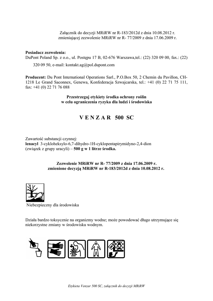 Załącznik do decyzji MRiRW nr R-183/2012d z dnia 10.08.2012 r. zmieniającej zezwolenie MRiRW nr R- 77/2009 z dnia 17.06.2009 r. Posiadacz zezwolenia: DuPont Poland Sp. z o.o., ul. Postępu 17 B, 02-676 Warszawa,tel.: (22) 320 09 00, fax.: (22) 320 09 50, e-mail: [email protected] Producent: Du Pont International Operations Sarl., P.O.Box 50, 2 Chemin du Pavillon, CH1218 Le Grand Saconnex, Genewa, Konfederacja Szwajcarska, tel.: +41 (0) 22 71 75 111, fax: +41 (0) 22 71 76 088 Przestrzegaj etykiety środka ochrony roślin w celu ograniczenia ryzyka dla ludzi i środowiska V E N Z A R 500 SC Zawartość substancji czynnej: lenacyl 3-cykloheksylo-6,7-dihydro-1H-cyklopentapirymidyno-2,4-dion (związek z grupy uracyli) – 500 g w 1 litrze środka. Zezwolenie MRiRW nr R- 77/2009 z dnia 17.06.2009 r. zmienione decyzją MRiRW nr R-183/2012d z dnia 10.08.2012 r. Niebezpieczny dla środowiska Działa bardzo toksycznie na organizmy wodne; może powodować długo utrzymujące się niekorzystne zmiany w środowisku wodnym. Etykieta Venzar 500 SC, załącznik do decyzji MRiRW Uwaga! 1. Zabrania się stosowania środka w strefie bezpośredniej ochrony ujęć wody, na terenie uzdrowisk, otulin parków narodowych i rezerwatów. 2. Nie zanieczyszczać wód środkiem ochrony roślin lub jego opakowaniem. I OPIS DZIAŁANIA ŚRODKA Środek chwastobójczy, koncentrat w postaci zawiesiny do rozcieńczania wodą, stosowany nalistnie, przeznaczony do zwalczania chwastów dwuliściennych w buraku cukrowym. Środek pobierany jest przez korzenie chwastów, które wkrótce po wschodach zamierają. Chwasty wrażliwe np.: fiołek polny, jasnota różowa, komosa biała, przetacznik perski, rdest powojowy, rumian polny, samosiewy rzepaku, tasznik pospolity. Chwasty odporne np.: bodziszek drobny, ostrożeń polny i inne gatunki chwastów dwuliściennych wieloletnich lub głęboko korzeniących się. II ZAKRES STOSOWANIA, TERMINY I DAWKI ROŚLINY ROLNICZE BURAK CUKROWY Venzar 500 SC stosuje się po wschodach roślin buraka w dawkach dzielonych pierwszy zabieg przeciwko chwastom w fazie liścieni Zalecana dawka: 0,5 l/ha. drugi zabieg w momencie ponownych wschodów chwastów, w około 7-10 dni po pierwszym zabiegu Zalecana dawka: 0,5 l/ha. Zalecana ilość wody: 200-300 l/ha. Zalecane opryskiwanie: średniokropliste. NASTĘPSTWO ROŚLIN Jeżeli potraktowana środkiem plantacja z jakichkolwiek powodów (nierównomierne wschody, uszkodzenia przez choroby lub szkodniki) musi być powtórnie obsiana, zaleca się wysiew buraka cukrowego lub pastewnego bez ponownego opryskiwania środkiem Venzar 500 SC. Kukurydzę i ziemniak można uprawiać po wykonaniu głębokiej orki (ponad 20 cm). W roku zastosowania środka Venzar 500 SC nie wysiewać zbóż ozimych. Jeżeli w okresie wegetacji wystąpiła susza, to przed siewem zbóż jarych wiosną następnego roku wykonać głęboką orkę przedzimową (ponad 20 cm). PRZECIWWSKAZANIA Środka nie stosować na glebach lekkich o niskiej zawartości próchnicy Podczas stosowania środka nie dopuścić do: − znoszenia cieczy użytkowej na sąsiednie rośliny uprawne − nakładania się cieczy użytkowej na stykach pasów zabiegowych i uwrociach. III OKRES PREWENCJI DLA LUDZI, ZWIERZĄT, PSZCZÓŁ okres zapobiegający zatruciu NIE DOTYCZY Etykieta Venzar 500 SC, załącznik do decyzji MRiRW IV OKRES KARENCJI okres od dnia ostatniego zabiegu do dnia zbioru roślin przeznaczonych do konsumpcji NIE DOTYCZY V SPORZĄDZANIE CIECZY UŻYTKOWEJ Przed przystąpieniem do sporządzenia cieczy użytkowej dokładnie ustalić potrzebną jej ilość. Zawartością opakowania przed użyciem wstrząsnąć. Odmierzoną ilość środka wlać do zbiornika opryskiwacza napełnionego częściowo wodą z włączonym mieszadłem i uzupełnić wodą do potrzebnej ilości. Po wlaniu środka do zbiornika opryskiwacza nie wyposażonego w mieszadło hydrauliczne ciecz w zbiorniku mechanicznie wymieszać. Opróżnione opakowania przepłukać trzykrotnie wodą, a popłuczyny wlać do zbiornika opryskiwacza z cieczą użytkową. Opryskiwać z włączonym mieszadłem. W przypadku przerw w opryskiwaniu przed ponownym przystąpieniem do pracy, dokładnie wymieszać ciecz użytkową w zbiorniku opryskiwacza. Po pracy aparaturę dokładnie wymyć. VI PRZECHOWYWANIE Chronić przed dziećmi. Przechowywać pojemnik szczelnie zamknięty. Nie przechowywać razem z żywnością, napojami i paszami dla zwierząt. Przechowywać wyłącznie w oryginalnym opakowaniu w temperaturze nie niższej niż 0oC i nie wyższej niż 30oC. VII WARUNKI BEZPIECZNEGO STOSOWANIA ŚRODKA OHRONY ROŚLIN − − − − − − − − − Nie jeść i nie pić oraz nie palić tytoniu podczas stosowania produktu. Nosić odpowiednią odzież ochronną. W razie połknięcia niezwłocznie zasięgnij porady lekarza – pokaż opakowanie lub etykietę. Używać odpowiednich pojemników zapobiegających skażeniu środowiska. Resztki cieczy użytkowej rozcieńczyć wodą i wypryskać na powierzchni poprzednio opryskiwanej. Wodę użytą do mycia aparatury wypryskać na powierzchni uprzednio opryskiwanej, stosując te same środki ochrony osobistej. Środek i opakowanie usuwać jako odpad niebezpieczny. Opróżnione opakowania po środku zwrócić do sprzedawcy, u którego środek został zakupiony. Zabrania się spalania opakowań po środku ochrony roślin we własnym zakresie. Etykieta Venzar 500 SC, załącznik do decyzji MRiRW UWAGA! ZABRANIA SIĘ WYKORZYSTYWANIA OPRÓŻNIONYCH OPAKOWAŃ PO ŚRODKACH OCHRONY ROŚLIN DO INNYCH CELÓW, W TYM TAKŻE TRAKTOWANIA ICH JAKO SUROWCE WTÓRNE. VIII ANTIDOTUM: BRAK, STOSOWAĆ LECZENIE OBJAWOWE IX POMOC MEDYCZNA W zaistniałych sytuacjach, kiedy wymagana jest lub konieczna inna pomoc medyczna niż ujęta w wyżej wymienionych ostrzeżeniach skontaktować się z najbliższym ośrodkiem toksykologicznym: Gdańsk – (58) 682-04-04 Kraków – (12) 411-99-99 Lublin – (81) 740-89-83 Łódź – (42) 657-99-00 Poznań