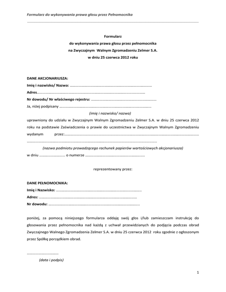 Formularz do wykonywania prawa głosu przez Pełnomocnika _________________________________________________________________________________________________________________ Formularz do wykonywania prawa głosu przez pełnomocnika na Zwyczajnym Walnym Zgromadzeniu Zelmer S.A. w dniu 25 czerwca 2012 roku DANE AKCJONARIUSZA: Imię i nazwisko/ Nazwa: ……………………………………………………………....………… Adres………………………………………………………………………………….......………… Nr dowodu/ Nr właściwego rejestru: …………………………………………..……………… Ja, niżej podpisany ………………………………………………………………….....…………... (imię i nazwisko/ nazwa) uprawniony do udziału w Zwyczajnym Walnym Zgromadzeniu Zelmer S.A. w dniu 25 czerwca 2012 roku na podstawie Zaświadczenia o prawie do uczestnictwa w Zwyczajnym Walnym Zgromadzeniu wydanym przez:………...................................................………………………………………………………………… …………………………………………………………………………............................................... (nazwa podmiotu prowadzącego rachunek papierów wartościowych akcjonariusza) w dniu ……………………… o numerze …………………………………………………….. reprezentowany przez: DANE PEŁNOMOCNIKA: Imię i Nazwisko: …………………………………………………………………………….. Adres: ………………………………………………………………………………………… Nr dowodu: ………………………………………………………………………………….. poniżej, za pomocą niniejszego formularza oddaję swój głos i/lub zamieszczam instrukcję do głosowania przez pełnomocnika nad każdą z uchwał przewidzianych do podjęcia podczas obrad Zwyczajnego Walnego Zgromadzenia Zelmer S.A. w dniu 25 czerwca 2012 roku zgodnie z ogłoszonym przez Spółkę porządkiem obrad. …………………………… (data i podpis) 1 Formularz do wykonywania prawa głosu przez Pełnomocnika _________________________________________________________________________________________________________________ Uchwała Nr 1/2012 Zwyczajnego Walnego Zgromadzenia ZELMER Spółka Akcyjna z dnia 25 czerwca 2012 roku w sprawie wyboru Przewodniczącego Zwyczajnego Walnego Zgromadzenia Głosowanie: Za …………………………….....………… (ilość głosów) Przeciw ………………………………......... (ilość głosów) Wstrzymuję się ………………………...….. (ilość głosów) W przypadku głosowania przeciwko uchwale nr 1 w przedmiocie wyboru Przewodniczącego Zwyczajnego Walnego Zgromadzenia, Akcjonariusz może poniżej wyrazić sprzeciw z prośbą o wpisanie do protokołu. Treść sprzeciwu*: ………………………………………………………....................................... ………………………………………………………………………………………...........…………. Instrukcje dotyczące sposobu głosowania przez pełnomocnika w sprawie podjęcia uchwały nr 1 w przedmiocie wyboru Przewodniczącego Zwyczajnego Walnego Zgromadzenia. Treść instrukcji*:………………………………………………………………........……………… ……………………………………………………………………………………..........……………. …………………………… (podpis Akcjonariusza) * w przypadku nie wyrażania sprzeciwu/braku instrukcji, miejsca wykropkowane należy przekreślić. 2 Formularz do wykonywania prawa głosu przez Pełnomocnika _________________________________________________________________________________________________________________ Uchwała Nr 2 /2012 Zwyczajnego Walnego Zgromadzenia ZELMER Spółka Akcyjna z dnia 25 czerwca 2012 roku w sprawie przyjęcia porządku obrad Głosowanie: Za …………………………….....………… (ilość głosów) Przeciw ………………………………......... (ilość głosów) Wstrzymuję się ………………………...….. (ilość głosów) W przypadku głosowania przeciwko uchwale nr 2 w przedmiocie przyjęcia porządku obrad, Akcjonariusz może poniżej wyrazić sprzeciw z prośbą o wpisanie do protokołu. Treść sprzeciwu*: ………………………………………………………....................................... ………………………………………………………………………………………...........…………. Instrukcje dotyczące sposobu głosowania przez pełnomocnika w sprawie podjęcia uchwały nr 2 w przedmiocie przyjęcia porządku obrad. Treść instrukcji*:………………………………………………………………........……………… ……………………………………………………………………………………..........……………. …………………………… (podpis Akcjonariusza) * w przypadku nie wyrażania sprzeciwu/braku instrukcji, miejsca wykropkowane należy przekreślić. 3 Formularz do wykonywania prawa głosu przez Pełnomocnika _________________________________________________________________________________________________________________ Uchwała Nr 3/2012 Zwyczajnego Walnego Zgromadzenia ZELMER Spółka Akcyjna z dnia 25 czerwca 2012 roku w przedmiocie zatwierdzenie sprawozdania Zarządu z działalności Spółki w roku 2011 Głosowanie: Za …………………………….....………… (ilość głosów) Przeciw ………………………………......... (ilość głosów) Wstrzymuję się ………………………...….. (ilość głosów) W przypadku głosowania przeciwko uchwale nr 3 w przedmiocie zatwierdzenie sprawozdania Zarządu z działalno