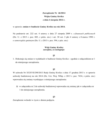 Zarządzenie Nr 46/2014 Wójta Gminy Kwilcz z dnia 4 sierpnia 2014 r. w sprawie: zmian w budżecie Gminy Kwilcz na rok 2014. Na podstawie art. 222 ust. 4 ustawy z dnia 27 sierpnia 2009 r. o finansach publicznych (Dz. U. z 2013 r. poz. 885, z późn. zm.) i art. 30 ust. 2 pkt 4 ustawy z 8 marca 1990 r. o samorządzie gminnym (Dz. U. z 2013 r. poz. 594, z póz. zm.) Wójt Gminy Kwilcz zarządza, co następuje: §1 1. Dokonuje się zmian w wydatkach w budżecie Gminy Kwilcz - zgodnie z załącznikiem nr 1 do niniejszego zarządzenia. §2 W uchwale Nr XXXVII/290/2013 Rady Gminy Kwilcz z dnia 17 grudnia 2013 r. w sprawie uchwały budżetowej na rok 2014 (Dz. Urz. Woj. Wlkp. z 2013 r. poz. 7434, z późn. zm.) wprowadza się zmiany wynikające z niniejszego zarządzenia: 1) w załączniku nr 2 do uchwały budżetowej wprowadza się zmiany jak w załączniku nr 1 do niniejszego zarządzenia. §3 Zarządzenie wchodzi w życie z dniem podjęcia. Uzasadnienie do Zarządzenia Nr 46/2014 Wójta Gminy Kwilcz z dnia 4 sierpnia 2014 r. 1. Dokonanie wewnętrznych zmian w budżecie Gminy Kwilcz, polegających na przeniesieniu planowanych wydatków w następujących podziałkach klasyfikacji, zgodnie z załącznikiem Nr 2 do niniejszego zarządzenia. WYDATKI Urząd Gminy w Kwilczu Dział Rozdział § Określenie wydatków Zwiększenie planu wydatków 5.465,00 Zmniejszenie planu wydatków BEZPIECZEŃSTWO PUBLICZNE I OCHRONA PRZECIWPOŻAROWA 75412 Ochotnicze straże pożarne 5.465,00 3020 Wydatki osobowe niezaliczone 3.000,00 do wynagrodzeń 4210 Zakup materiałów i wyposażenia 2.400,00 4300 Zakup usług pozostałych 65,00 758 RÓŻNE ROZLICZENIA 6.465,00 75818 Rezerwy ogólne i celowe 6.465,00 4810 Rezerwy 6.465,00 900 GOSPODARKA 1.000,00 KOMUNALNA I OCHRONA ŚRODOWISKA 90002 Gospodarka odpadami 1.000,00 4300 Zakup usług pozostałych 1.000,00 Razem 6.465,00 6.465,00 Uzasadnienie: Dokonuje się rozdysponowania środków w wyniku uruchomienia rezerwy celowej w następujących działach: 754 754/75412/3020 zwiększa się wydatki bieżące o kwotę 5.465,00 zł w wyniku uruchomienia rezerwy celowej utworzonej na zarządzanie kryzysowe w dziale 758, rozdz. 75818. Środki te przeznaczone zostaną na wydatki za udział w akcjach ratowniczych – usuwanie skutków zniszczeń w wyniku silnych wiatrów, zakup plandek wraz z kosztami przesyłki celem zabezpieczenia zerwanych dachów na skutek silnych wiatrów na terenie gminy Kwilcz, 758/75818/4810 zmniejsza się rezerwę celowa na zarządzanie kryzysowe w kwocie 6.465,00 zł w celu sfinansowania nieprzewidzianych wydatków w wyniku silnych wiatrów na terenie gminy Kwilcz, 900/90002/4300 zwiększa się wydatki bieżące o kwotę 1.000,00 zł w wyniku uruchomienia rezerwy celowej utworzonej na zarządzanie kryzysowe w dziale 758, rozdz. 75818. Środki te przeznaczone zostaną na usługi usuwania powalonych drzew na skutek silnych wiatrów na terenie gminy Kwilcz.