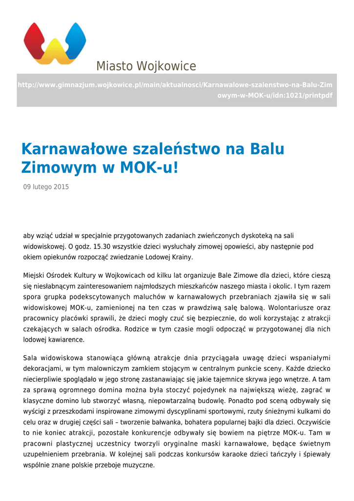 Miasto Wojkowice http://www.gimnazjum.wojkowice.pl/main/aktualnosci/Karnawalowe-szalenstwo-na-Balu-Zim owym-w-MOK-u/idn:1021/printpdf Karnawałowe szaleństwo na Balu Zimowym w MOK-u! 09 lutego 2015 kategoria: Wojkowice aby wziąć udział w specjalnie przygotowanych zadaniach zwieńczonych dyskoteką na sali widowiskowej. O godz. 15.30 wszystkie dzieci wysłuchały zimowej opowieści, aby następnie pod okiem opiekunów rozpocząć zwiedzanie Lodowej Krainy. Miejski Ośrodek Kultury w Wojkowicach od kilku lat organizuje Bale Zimowe dla dzieci, które cieszą się niesłabnącym zainteresowaniem najmłodszych mieszkańców naszego miasta i okolic. I tym razem spora grupka podekscytowanych maluchów w karnawałowych przebraniach zjawiła się w sali widowiskowej MOK-u, zamienionej na ten czas w prawdziwą salę balową. Wolontariusze oraz pracownicy placówki sprawili, że dzieci mogły czuć się bezpiecznie, do woli korzystając z atrakcji czekających w salach ośrodka. Rodzice w tym czasie mogli odpocząć w przygotowanej dla nich lodowej kawiarence. Sala widowiskowa stanowiąca główną atrakcje dnia przyciągała uwagę dzieci wspaniałymi dekoracjami, w tym malowniczym zamkiem stojącym w centralnym punkcie sceny. Każde dziecko niecierpliwie spoglądało w jego stronę zastanawiając się jakie tajemnice skrywa jego wnętrze. A tam za sprawą ogromnego domina można była stoczyć pojedynek na największą wieżę, zagrać w klasyczne domino lub stworzyć własną, niepowtarzalną budowlę. Ponadto pod sceną odbywały się wyścigi z przeszkodami inspirowane zimowymi dyscyplinami sportowymi, rzuty śnieżnymi kulkami do celu oraz w drugiej części sali – tworzenie bałwanka, bohatera popularnej bajki dla dzieci. Oczywiście to nie koniec atrakcji, pozostałe konkurencje odbywały się bowiem na piętrze MOK-u. Tam w pracowni plastycznej uczestnicy tworzyli oryginalne maski karnawałowe, będące świetnym uzupełnieniem przebrania. W kolejnej sali podczas konkursów karaoke dzieci tańczyły i śpiewały wspólnie znane polskie przeboje muzyczne. Punktem programu była dyskoteka na głównej sali, która rozpoczęła się niezwykle energetycznym akcentem. Nauka tańca indyjskiego, odtańczenie poloneza oraz innych popularnych układów, wprawiły wszystkich uczestników balu w doskonały nastrój. Dziękujemy dzieciom oraz ich rodzicom za wspólną zabawę, a wolontariuszom za pomoc i opiekę nad dziećmi. Zapraszamy również serdecznie na wydarzenia organizowane przez Miejski Ośrodek Kultury w Wojkowicach! Magdalena Pasternak