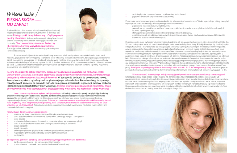 Piękna skóra........ od zaraz? Ponieważ każda z Nas marzy o młodej, świetlistej i pozbawionej wszelkich niedoskonałości skórze, musimy mieć w zanadrzu coś ekstra! Zabieg szybki, łatwy i skuteczny... Czyli po prostu peeling chemiczny! Jeden z podstawowych zabiegów w Naszej ofercie. Skierowany do wszystkich bez względu na wiek, płeć i potrzeby. Tani i nowoczesny zarazem. Skuteczny i bezpieczny. A przede wszystkim sprawdzony. Posiadający wiele wskazań, zwłaszcza w medycynie estetycznej i przeciwstarzeniowej. Podstawowymi objawami starzenia się skóry są zmarszczki mimiczne i posłoneczne, wiotka i sucha skóra, zanik naskórka, pogrubienie warstwy rogowej, ścieńczenie skóry właściwej, zaburzenia barwnikowe, teleangiektazje, powstawanie ognisk rogowacenia słonecznego czy brodawek łojotokowych. Nasilenie procesów starzenia się skóry możemy ocenić przy wykorzystaniu skali Glogau”a ( zmiany łagodne do 35r.ż., średnio nasilone do 40r.ż., zaawansowane do 65r.ż. i bardzo nasilone po 65r.ż. ). Zastosowanie różnych rodzajów peelingów zależy od stopnia nasilenia objawów starzenia się skóry. Najczęściej stosowane są więc peelingi chemiczne. Peeling chemiczny to zabieg medyczny polegający na złuszczaniu naskórka lub naskórka i części warstw skóry właściwej. Celem jego stosowania jest spowodowanie równomiernego, kontrolowanego pozbycia się kilku warstw uszkodzonych komórek. W ten sposób dochodzi do powstawania nowej, świeżej warstwy skóry, z gładszą strukturą i równiejszym zabarwieniem. Ponadto zabiegi te stymulują rozwój nowych komórek, co prowadzi m in. do zmniejszenia zmarszczek, regeneracji, odnowy naskórka i remodelingu mikroarchitektury skóry właściwej. Peelingi lekarskie polegają więc na złuszczeniu zmian chorobowych i/lub wad kosmetycznych znajdujących się w naskórku lub naskórku i skórze właściwej. Lekarz prowadzący dokonuje wyboru rodzaju peelingu, czyli rodzaju substancji czynnej, uwzględniając istniejący problem dermatologiczny i oczekiwania pacjenta. Bardzo istotne jest doświadczenie lekarza i technika wykonywania zabiegu. Siła penetracji i oddziaływanie na skórę danego peelingu zależą od jego składu chemicznego oraz budowy cząsteczkowej substancji czynnych i ich stężenia. Substancje czynne zastosowane w peelingach lekarskich to między innymi: kwas migdałowy, kwas pirogronowy, kwas glikolowy, kwas salicylowy, kwas mlekowy, kwas trójchlorooctowy, ale także witaminy, np. wit. C czy retinol. Zabiegi odpowiednimi preparatami mogą być wykonywane na okolicę twarzy, dłoni i szyi celem odmłodzenia ich wyglądu. Panel wskazań do ich wykonywania jest szeroki: + starzenie się skóry i szeroko rozumiana profilaktyka przeciwstarzeniowa + skóra pozbawiona blasku, o nierównej powierzchni, spadek jej napięcia i sprężystości + skóra palacza + przebarwienia (posłoneczne, hormonalne, pozapalne, plamy soczewicowate, piegi) + skóra tłusta, łojotokowa, rozszerzone ujścia gruczołów łojowych, zaskórniki + trądzik pospolity + trądzik różowaty + zmiany potrądzikowe (płytkie blizny zanikowe, przebarwienia pozapalne) + rogowacenie przymieszkowe twarzy, kończyn górnych i dolnych + rozstępy i in. Ze względu na głębokość penetracji użytej substancji czynnej peelingi chemiczne dzielimy na: + bardzo powierzchowne - do warstwy ziarnistej naskórka + powierzchowne - naskórek i warstwa brodawkowa skóry właściwej + + średnio-głębokie - powierzchowne części warstwy siateczkowej głębokie - środkowe części warstwy siateczkowej. Złuszczanie samej warstwy rogowej naskórka określa się „złuszczaniem kosmetycznym” i tylko tego rodzaju zabiegi mogą być wykonywane przez kosmetologa. Proces peelingu może spowodować: + przejściowe nasilenie objawów trądzikowych, + wystąpienie opryszczki, u pacjentów u których wcześniej występowała; a szczególnie u tych, którzy nie podjęli leczenia zapobiegawczego, + stan zapalny (zaczerwienienie i swędzenie) okolic poddanych zabiegowi, + u niektórych osób po zabiegu mogą pojawić się przejściowo plamy hyper- lub hypopigmentacyjne, które zwykle (nawet nie leczone) samoistnie ustępują. Po zabiegu skóra może być zaczerwieniona i lekko obrzęknięta, jak po oparzeniu słonecznym, okres ten może trwać kilka dni. W tym czasie pacjent może odczuwać niewielkie pieczenie, swędzenie i palenie skóry. Później skóra staje się bardziej napięta i ulega złuszczeniu. I tu w zależności od rodzaju użytej substancji czynnej złuszczanie jest mniejsze np. drobnootrębiaste, prawie niezauważalne lub większe np. płatowe. Wśród peelingów nowej generacji znajdą się także i nanopeelingi, które wywołując zamierzony efekt nie wywołują złuszczania! Wachlarz nowoczesnych peelingów jest obecnie naprawdę szeroki. I użycie ich warunkują nie tylko wymagania klientki, czas rekonwalescencji, ich częstotliwość czy cena. Sporadycznie u pacjentów mogą pojawić się strupki, drobne nadżerki lub obrzęki. Podczas procesu odnowy i regeneracji pacjent nie odczuwa bólu. Natomiast po zabiegu informuje się pacjenta o konieczności stosowania fotoprotekcji, o stosowaniu kremów z alfahydroksykwasami podtrzymującymi uzyskany efekt i zapobiegającymi ponownemu pogrubieniu warstwy rogowej naskórka, czy o stosowaniu kremów z retinolem. W przypadku wystąpienia dużego obrzęku i rumienia lekarz może zalecić krótkotrwałe stosowanie preparatów kortykosteroidowych. Natomiast większość osób po zabiegu złuszczania może od razu wrócić do pracy. Przeciętnie po peelingu w gabinecie dermatologicznym potrzeba 2 – 3 dni na regenerację skóry. Natomiast głębsze peelingi chemiczne, w przypadku skóry z dużymi zmianami posłonecznymi, zmarszczkami lub bliznami wymagają 6 - 7 dni. Warto zaznaczyć, że zabiegi tego rodzaju wymagają serii powtórzeń w odstępach dwóch czy czterech tygodni. Lekarz prowadzący 