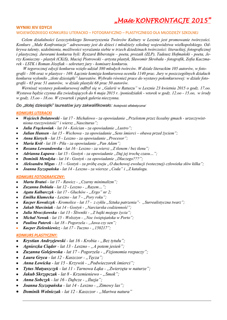„Małe KONFRONTACJE 2015” WYNIKI XIV EDYCJI WOJEWÓDZKIEGO KONKURSU LITERACKO – FOTOGRAFICZNO – PLASTYCZNEGO DLA MŁODZIEŻY SZKOLNEJ Celem działalności Leszczyńskiego Stowarzyszenia Twórców Kultury w Lesznie jest promowanie twórczości. Konkurs „Małe Konfrontacje” adresowany jest do dzieci i młodzieży szkolnej województwa wielkopolskiego. Odkrywa talenty, uzdolnienia, możliwości wyrażania siebie w trzech dziedzinach twórczości: literackiej, fotograficznej i plastycznej. Jurorami konkursu byli: Ryszard Biberstajn – poeta, prozaik (ZLP), Tadeusz Hofmański - poeta, Jerzy Konieczny - plastyk (CKiS), Maciej Piotrowski - artysta plastyk, Sławomir Skrobała - fotografik, Zofia Kaczmarek - LSTK i Roman Józefiak – sekretarz jury - komisarz konkursu. W tegorocznej edycji konkursu wzięło udział 380 młodych twórców. W dziale literackim 105 autorów, w fotografii - 106 oraz w plastyce - 169. Łącznie komisja konkursowa oceniła 1140 prac. Jury w poszczególnych działach konkursu wyłoniło „złote dziesiątki” laureatów. Wybrało również prace do wystawy pokonkursowej: w dziale fotografii - 65 prac 51 autorów, w dziale plastyki 68 prac 50 autorów. Wernisaż wystawy pokonkursowej odbył się w „Galerii w Ratuszu” w Lesznie 23 kwietnia 2015 o godz. 17.oo. Wystawa będzie czynna dla zwiedzających do 6 maja 2015 r. /poniedziałek - wtorek w godz. 12.oo - 15.oo, w środy w godz. 15.oo - 18.oo. W czwartek i piątek galeria nieczynna. Do „złotej dziesiątki” laureatów jury zakwalifikowało: /kolejność alfabetyczna/ KONKURS LITERACKI Wojciech Dolatowski - lat 17 - Michałowo - za opowiadanie „Przelotem przez licealny gmach - urzeczywistniona rzeczywistość” i wiersz „Nasciturus”; Julia Frąckowiak - lat 14 - Kościan - za opowiadanie „Lustro”; Julian Hansen - lat 15 - Wschowa - za opowiadanie „Sens śmierci – obawa przed życiem”; Anna Kierych - lat 15 - Leszno - za opowiadanie „Procesor”; Maria Król - lat 18 - Piła - za opowiadanie „Pan Adam”; Roxana Lewandowska - lat 16 - Leszno - za wiersz „Z tlenem / bez tlenu”; Adrianna Łapawa - lat 15 - Gostyń - za opowiadanie „Daj jej trochę czasu…”; Dominik Mendyka - lat 14 - Gostyń - za opowiadanie „Dlaczego???”; Aleksandra Migas - 15 – Gostyń - za próbę eseju „O duchowej ewolucji (wstecznej) człowieka słów kilka”; Joanna Szczepańska - lat 14 - Leszno - za wiersze „Coda” i „Z katalogu. KONKURS FOTOGRAFICZNY: Marta Bratuś - lat 17 - Rawicz - „Czarny minimalizm”; Zuzanna Dobiała - lat 12 - Leszno - „Razem…”; Agata Kalbarczyk - lat 17 - Głuchów - „Ergo” nr 2; Emilka Klamecka - Leszno - lat 7 - „Pory roku”; Kacper Kowalczyk - Kromolice - lat 17 - z cyklu „Sztuka patrzenia”- „Surrealistyczna twarz”; Jakub Marciniak - lat 14 - Gostyń - „Narciarska codzienność”; Julia Mroczkowska - lat 13 - Śliwniki - „Z bajki mojego życia”; Michał Nowak - lat 15 - Wolsztyn - „Noc świętojańska w Porto”; Paulina Paterek - lat 18 - Pogorzela - „Jawa czy sen”; Kacper Zielenkiewicz - lat 17 - Tuczno - „150217”; KONKURS PLASTYCZNY: Krystian Andrzejewski - lat 16 - Krobia - „Bez tytułu”; Agnieszka Ciąder - lat 13 - Leszno - „A potem jesień”; Zuzanna Golejewska - lat 17 - Pogorzela - „Fizjonomia rozpaczy”; Laura Gryca - lat 12 - Kaszczor - „Tęcza”; Anna Łowicka - lat 15 - Krzywiń - „Podwieczorek śmierci”; Tytus Matyaszczyk - lat 11 - Tarnowa Łąka - „Zwierzęta w naturze”; Jakub Skrzypczak - lat 8 - Krzemieniewo - „Smok”; Anna Sobczyk - lat 16 - Dąbcze - „Iluzja”; Joanna Szczepańska - lat 14 - Leszno - „Zimowy las”; Dominik Wolniczak - lat 12 - Kaszczor - „Martwa natura” „Małe KONFRONTACJE 2015” WYSTAWA POKONKURSOWA - „GALERIA W RATUSZU” W LESZNIE GALERIA LITERACKA Na plakatach zamieszczono nagrodzone prace literackie „złotej dziesiątki” GALERIA FOTOGRAFICZNA Na wystawie zamieszczono prace laureatów ze „złotej dziesiątki” oraz prace następujących autorów: Natalia Bogdańska - lat 16 – Rawicz, Maria Celka - lat 15 – Leszno, Klaudia Dłużyńska - lat 16 – Leszno, Patrycja Fortecka - lat 17 – Leszno, Karolina Janiszewska - lat 12 – Włoszakowice, Sara Janowicz - lat 15 – Włoszakowice, Matylda Kaczmarek - lat 14 – Leszno, Zuzanna Kaczmarek - lat 15 – Leszno, Oliwia Kasperska - lat 15 - Włoszakowice, Wojciech Kasprzak - lat 19 – Kunowo, Martyna Kaźmierczak - lat 12 – Konarzewo, Anna Kędziora - lat 16 – Włoszakowice, Martyna Kiałka - lat 16 – Rawicz, Weronika Kubinka - lat 13 – Gostyń, Roksana Lewandowska lat 16 – Leszno, Albert Łapa - lat 12 – Lusowo, Łukasz Ławecki - lat 18 – Włoszakowice, Sandra Maćkowiak - lat 20 – Sowy, Agnieszka Malcher - lat 15 – Potrzebowo, Nadia Matuszewska - lat 11- Leszno, Inga Mejer - lat 16 – Leszno, Marta Michałowska - lat 17 – Kościan, Katarzyna Milaszewska - lat 15 – Leszno, Izabela Myślińska - lat 14 – Leszno, Barbara Nowaczyk - lat ? – Kąkolewo, Natalia Pachura - lat 15 – Włoszakowice, Adrianna Pawlak lat 18 – Jarocin, Aleksandra Pietrowicz - lat 11- Leszno, Aleksandra Plecińska - lat 14 – Gostyń, Julia Pluta - lat 13 – Włoszakowice, Weronika Puszkarów - lat 10 – Rawicz, Monika Rosik - lat ? – Leszno, Sylwia Skorupka - lat 14 – Kąkolewo, Alexander Skwara - lat ? – Gałowo, Olimpia Sobota - lat 14 – Leszno, Dawid Stawowy - lat 11 – Leszno, Paweł Szlachetka - lat 18 – Poniec, Malwina Szudra - lat 11 – Leszno, Anna Szulc - lat 19 – Potarzyca, Wiktoria Śramkowska - lat 17 – Koło, Julia Zakrzewicz - lat 16 – Ruszków. GALERIA PLASTYCZNA Zamieszczono prace laureatów ze „złotej dziesiątki” oraz prace następujących autorów: Maja Błaszkowska - lat 11 – Sądzia, Małgorzata Bojzan - lat 17 – Piła, Michalina Chudzińska - lat 16 – Pępowo, Adam Ciesielczyk - lat 9 – Krzemieniewo, Dawid Cłapka - la
