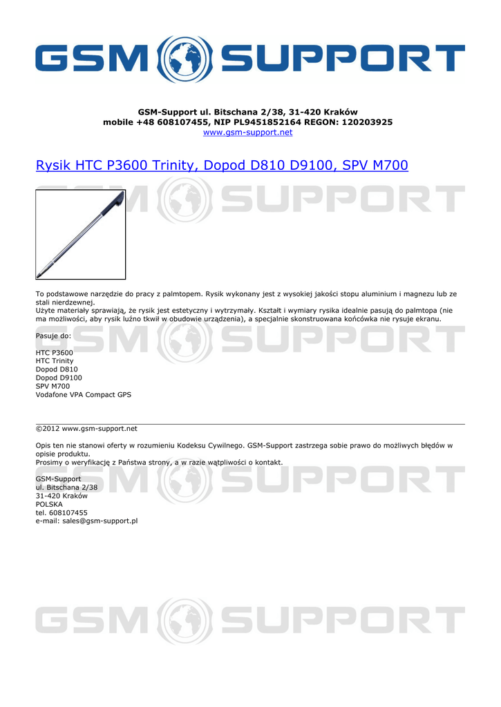 GSM-Support ul. Bitschana 2/38, 31-420 Kraków mobile +48 608107455, NIP PL9451852164 REGON: 120203925 www.gsm-support.net Rysik HTC P3600 Trinity, Dopod D810 D9100, SPV M700 To podstawowe narzędzie do pracy z palmtopem. Rysik wykonany jest z wysokiej jakości stopu aluminium i magnezu lub ze stali nierdzewnej. Użyte materiały sprawiają, że rysik jest estetyczny i wytrzymały. Kształt i wymiary rysika idealnie pasują do palmtopa (nie ma możliwości, aby rysik luźno tkwił w obudowie urządzenia), a specjalnie skonstruowana końcówka nie rysuje ekranu. Pasuje do: HTC P3600 HTC Trinity Dopod D810 Dopod D9100 SPV M700 Vodafone VPA Compact GPS ©2012 www.gsm-support.net Opis ten nie stanowi oferty w rozumieniu Kodeksu Cywilnego. GSM-Support zastrzega sobie prawo do możliwych błędów w opisie produktu. Prosimy o weryfikację z Państwa strony, a w razie wątpliwości o kontakt. GSM-Support ul. Bitschana 2/38 31-420 Kraków POLSKA tel. 608107455 e-mail: [email protected] Powered by TCPDF (www.tcpdf.org)