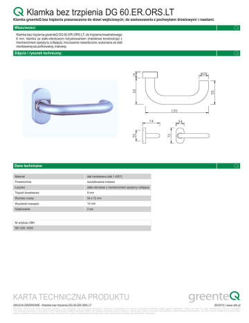 Klamka bez trzpienia DG 60.ER.ORS.LT Klamka greenteQ bez trzpienia przeznaczona do drzwi wejściowych; do zastosowania z pochwytami drzwiowymi i rozetami. Właściwości: Klamka bez trzpienia greenteQ DG 60.ER.ORS.LT; do trzpienia kwadratowego 8 mm; klamka ze stało-obrotowym łożyskowaniem (metalowa konstrukcja) z mechanizmem sprężyny cofającej; mocowanie niewidoczne; wykonana ze stali nierdzewnej szczotkowanej, matowej. Zdjęcie i rysunek techniczny: Dane techniczne: Materiał stal nierdzewna (stal 1.4301) Powierzchnia szczotkowana matowa Łożysko stało-obrotowe z mechanizmem sprężyny cofającej Trzpień kwadratowy 8 mm Wymiary rozety 34 x 72 mm Wysokość krawędzi 14 mm Opakowanie 2 szt. Nr artykułu VBH 987.209 / 6500 KARTA TECHNICZNA PRODUKTU OKUCIA DRZWIOWE - Klamka bez trzpienia DG 60.ER.ORS.LT 05/2010 | www.vbh.pl Instrukcje użytkowania, dane dotyczące produktu i jego osiągnięć oraz inne dane techniczne stanowią w odniesieniu do naszych produktów greenteQ jedynie ogólne wskazówki. Służą one tylko do opisu właściwości i budowy produktów i nie stanowią gwarancji w rozumieniu § 443 niemieckiego kodeksu cywilnego (BGB). Ze względu na szeroki zakres możliwych zastosowań naszych produktów obowiązkiem użytkownika jest sprawdzenie, czy dany produkt nadaje się do jego celów. Nasze doradztwo techniczne udzielane ustnie, pisemnie lub w postaci przeprowadzonej próby służy tylko do Państwa informacji i jest absolutnie niewiążące.