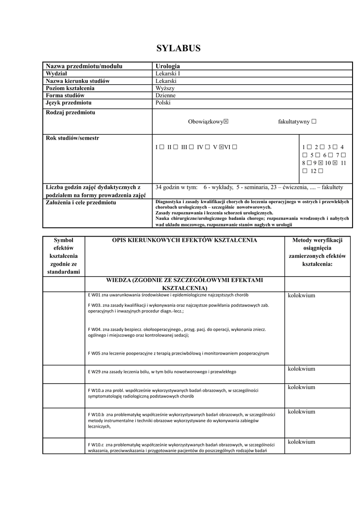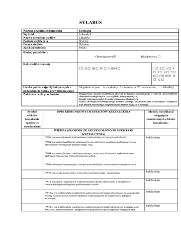 SYLABUS Nazwa przedmiotu/modułu Urologia Wydział Nazwa kierunku studiów Poziom kształcenia Forma studiów Język przedmiotu Lekarski I Lekarski Wyższy Dzienne Polski Rodzaj przedmiotu Obowiązkowy fakultatywny Rok studiów/semestr I II III IV V VI Liczba godzin zajęć dydaktycznych z podziałem na formy prowadzenia zajęć Założenia i cele przedmiotu Symbol efektów kształcenia zgodnie ze standardami 34 godzin w tym: 1 2 3 4 5 6 7 8 9 10 11 12 6 - wykłady, 5 - seminaria, 23 – ćwiczenia, .... – fakultety Diagnostyka i zasady kwalifikacji chorych do leczenia operacyjnego w ostrych i przewlekłych chorobach urologicznych – szczególnie nowotworowych. Zasady rozpoznawania i leczenia schorzeń urologicznych. Nauka chirurgiczne/urologicznego badania chorego; rozpoznawania wrodzonych i nabytych wad układu moczowego, rozpoznawanie stanów nagłych w urologii OPIS KIERUNKOWYCH EFEKTÓW KSZTAŁCENIA Metody weryfikacji osiągnięcia zamierzonych efektów kształcenia: WIEDZA (ZGODNIE ZE SZCZEGÓŁOWYMI EFEKTAMI KSZTAŁCENIA) E W01 zna uwarunkowania środowiskowe i epidemiologiczne najczęstszych chorób kolokwium F W03. zna zasady kwalifikacji i wykonywania oraz najczęstsze powikłania podstawowych zab. operacyjnych i inwazyjnych procedur diagn.-lecz.; F W04. zna zasady bezpiecz. okołooperacyjnego., przyg. pacj. do operacji, wykonania zniecz. ogólnego i miejscowego oraz kontrolowanej sedacji; F W05 zna leczenie pooperacyjne z terapią przeciwbólową i monitorowaniem pooperacyjnym E W29 zna zasady leczenia bólu, w tym bólu nowotworowego i przewlekłego F W10.a zna probl. współcześnie wykorzystywanych badań obrazowych, w szczególności symptomatologię radiologiczną podstawowych chorób F W10.b zna problematykę współcześnie wykorzystywanych badań obrazowych, w szczególności metody instrumentalne i techniki obrazowe wykorzystywane do wykonywania zabiegów leczniczych, F W10.c zna problematykę współcześnie wykorzystywanych badań obrazowych, w szczególności wskazania, przeciwwskazania i przygotowanie pacjentów do poszczególnych rodzajów badań kolokwium kolokwium kolokwium kolokwium obrazowych oraz przeciwwskazania do stosowania środków kontrastujących; UMIEJĘTNOŚCI (ZGODNIE ZE SZCZEGÓŁOWYMI EFEKTAMI KSZTAŁCENIA) F U01 asystuje przy typowym zabiegu operacyjnym, przygotowuje pole operacyjne i znieczula miejscowo okolicę operowaną kolokwium kolokwium F U02 posługuje się podstawowymi narzędziami chirurgicznymi F U03 stosuje się do zasad aseptyki i antyseptykiG U06. stara się unikać popełnienia błędu medycznego we własnych działaniach kolokwium kolokwium E U24. interpretuje badania laboratoryjne i identyfikuje przyczyny odchyleń kolokwium E U29.g cewnikowanie pęcherza moczowego u kobiet i mężczyzn E W07.e zna i rozumie przyczyny, objawy, zasady diagnozowania i postępowania terapeutycznego w odniesieniu do najczęstszych chorób wewnętrznych występujących u osób dorosłych oraz ich powikłań: chorób nerek i dróg moczowych, w tym: torbieli nerek, kamicy nerkowej, zakażeń układu moczowego, nowotworów układu moczowego, w szczególności raka pęcherza moczowego i raka nerki F U23. ocenia wskazania do wykonania punkcji nadłonowej i uczestniczy w jej wykonaniu F U24. asystuje przy typowych procedurach urologicznych (endoskopii diagnostycznej i terapeutycznej układu moczowego, litotrypsji, punkcji prostaty); KOMPETENCJE SPOŁECZNE (ZGODNIE Z OGÓLNYMI EFEKTAMI KSZTAŁCENIA) E U16 planuje postępowanie diagnostyczne, terapeutyczne i profilaktycznyc D U06. informuje pacjenta o celu, przebiegu i ewentualnym ryzyku prop. działań diagn. lub terapeutycznych i uzyskuje jego świadomą zgodę kolokwium E U32. planuje konsultacje specjalistyczne PUNKTY ECTS kolokwium kolokwium 2 TREŚCI MERYTORYCZNE PRZEDMIOTU: Tematyka Wprowadzenie do Urologii Łagodny rozrost gruczołu krokowego Kamica moczowa Nowotwory układu moczowo-płciowego Urazy układu moczowego WARUNKI UZYSKANIA ZALICZENIA PRZEDMIOTU: Kolokwium wstępne- testowo- opisowe 5-10 pytań Kolokwium zaliczeniowe : ustne 2 pytania Kryteria zaliczenia- zaliczenie kolokwium wstępnego i końcowego, obecność na zajęciach