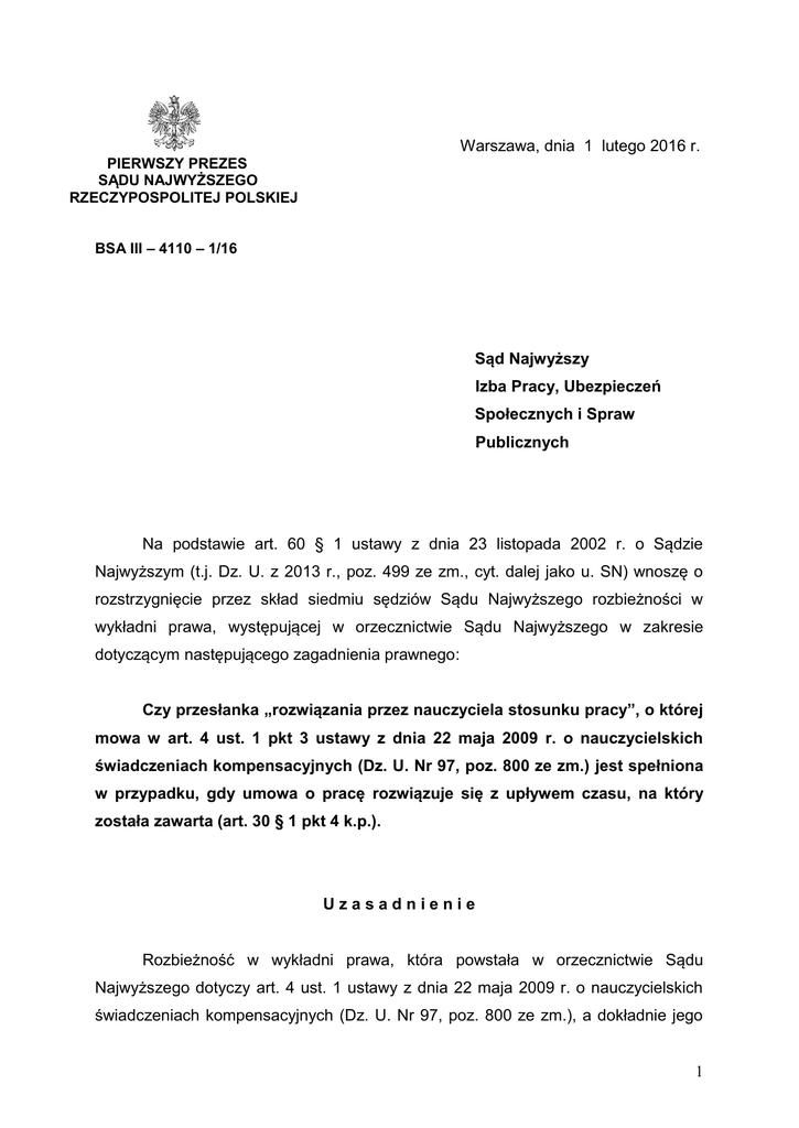 Warszawa, dnia 1 lutego 2016 r. PIERWSZY PREZES SĄDU NAJWYŻSZEGO RZECZYPOSPOLITEJ POLSKIEJ BSA III – 4110 – 1/16 Sąd Najwyższy Izba Pracy, Ubezpieczeń Społecznych i Spraw Publicznych Na podstawie art. 60 § 1 ustawy z dnia 23 listopada 2002 r. o Sądzie Najwyższym (t.j. Dz. U. z 2013 r., poz. 499 ze zm., cyt. dalej jako u. SN) wnoszę o rozstrzygnięcie przez skład siedmiu sędziów Sądu Najwyższego rozbieżności w wykładni prawa, występującej w orzecznictwie Sądu Najwyższego w zakresie dotyczącym następującego zagadnienia prawnego: Czy przesłanka „rozwiązania przez nauczyciela stosunku pracy”, o której mowa w art. 4 ust. 1 pkt 3 ustawy z dnia 22 maja 2009 r. o nauczycielskich świadczeniach kompensacyjnych (Dz. U. Nr 97, poz. 800 ze zm.) jest spełniona w przypadku, gdy umowa o pracę rozwiązuje się z upływem czasu, na który została zawarta (art. 30 § 1 pkt 4 k.p.). Uzasadnienie Rozbieżność w wykładni prawa, która powstała w orzecznictwie Sądu Najwyższego dotyczy art. 4 ust. 1 ustawy z dnia 22 maja 2009 r. o nauczycielskich świadczeniach kompensacyjnych (Dz. U. Nr 97, poz. 800 ze zm.), a dokładnie jego 1 pkt 3. Zgodnie z powoływanym przepisem świadczenie kompensacyjne przysługuje nauczycielom, którzy spełnili łącznie następujące warunki: 1) osiągnęli wiek, o którym mowa w ust. 3; 2) mają okres składkowy i nieskładkowy w rozumieniu ustawy z dnia 17 grudnia 1998 r. o emeryturach i rentach z Funduszu Ubezpieczeń Społecznych (t.j. Dz. U. z 2015 r., poz. 748, z późn. zm) wynoszący 30 lat, w tym 20 lat wykonywania pracy w jednostkach, o których mowa w art. 2 pkt 1, w wymiarze co najmniej 1/2 obowiązkowego wymiaru zajęć oraz 3) rozwiązali stosunek pracy. Rozbieżność w orzecznictwie odnosi się do różnej interpretacji warunku „rozwiązania stosunku pracy”. Powstaje bowiem pytanie, czy przesłanka ta jest spełniona wyłącznie wówczas gdy do rozwiązania stosunku pracy doszło na wniosek (czy z inicjatywy) pracownika, czy też należy przyjąć, że do przedmiotowego rozwiązania dochodzi także w sytuacji, w której umowa rozwiązuje się z upływem okresu, na który została zawarta (art. 30 § 1 pkt 4 k.p.). Pierwsze z powoływanych stanowisk zostało zaprezentowane w uzasadnieniu wyroku SN z dnia 10 kwietnia 2013 r. (II UK 205/12). Stwierdzono w nim, że wprawdzie w art. 4 ust. 1 pkt 3 ustawy o świadczeniach kompensacyjnych nie ma tak wyraźnego sformułowania, jak w art. 88 ust. 1 Karty Nauczyciela, z którego wynika wprost, że nauczyciel nabywa uprawnienia emerytalne po rozwiązaniu na swój wniosek stosunku pracy, tym niemniej jego redakcja wskazuje na konieczną aktywność nauczyciela, gdyż to on musi rozwiązać stosunek pracy. W związku z tym, omawiana regulacja dotyczy przypadków, kiedy to nauczyciel składa oświadczenie woli o wypowiedzeniu umowy o pracę, czy też wniosek o rozwiązanie umowy o pracę za porozumieniem stron. W ocenie Sądu Najwyższego, nie zmienia tego fakt, że zgodnie z art. 30 § 1 pkt 4 k.p. umowa o pracę rozwiązuje się z upływem czasu, na który była zawarta. Jest to niewątpliwie przykład rozwiązania umowy o pracę, z tym że z art. 4 ust. 1 pkt 3 ustawy o świadczeniach kompensacyjnych wynika, że nie chodzi o każde rozwiązanie stosunku pracy, a tylko dokonane przez nauczyciela. Tak więc, nie negując, że upływ umowy terminowej jest rozwiązaniem stosunku pracy, należy przyjąć, że nie jest to rozwiązanie stosunku pracy przez nauczyciela, czego wymaga omawiana regulacja. Na wymóg aktywności ubezpieczonego sprowadzającej się do obowiązku rozwiązania stosunku pracy wskazał również SN w uzasadnieniu do wyroku z dnia 8 września 2015 r. (I UK 468/14), z tym że w przedmiotowej sprawie istota sporu dotyczyła innego zagadnienia. 2 Drugie z powołanych wyżej stanowisk zostało wyrażone w wyroku SN z dnia 11 grudnia 2013 r. (III UK 9/13; pogląd ten został również później podtrzymany w orzecznictwie sadów powszechnych, np. w wyroku Sądu Apelacyjnego w Łodzi z dnia 17 marca 2015 r., III AUa 715/14, Lex Nr 1755175; wyroku Sądu Apelacyjnego w Białymstoku z dnia 8 lipca 2014 r., III AUa 308/14, Lex Nr 1493726). SN podzielił argumentację wynikającą ze sprawy II UK 205/12 w zakresie, w jakim w art. 4 ust. 1 pkt 3 ustawy o świadczeniach kompensacyjnych wskazuje się na konieczną aktywność nauczyciela w tej sferze, gdyż to on musi rozwiązać stosunek pracy. W ocenie SN, nie można jednak zgodzić się ze stwierdzeniem, że wprawdzie w świetle art. 30 § 1 pkt 4 k.p. rozwiązanie umowy o pracę następuje także na skutek upływu czasu, na jaki zawarto umowę, lecz nie jest to jednak rozwiązanie stosunku pracy przez nauczyciela w rozumieniu art. 4 ust. 1 pkt 3 ustawy o świadczeniach kompensacyjnych. Rozwiązanie stosunku pracy przez nauczyciela ma zatem miejsce zarówno wtedy, gdy następuje w drodze jednostronnego oświadczenia woli pracownika (za lub bez wypowiedzenia), jak również we wszystkich sytuacjach, gdy oświadczenie woli nauczyciela jest częścią składową czynności rozwiązującej ów stosunek. Ponieważ przedmiotowe oświadczenie jest nieodzownym elementem czynności rozwiązującej, to można stwierdzić, że nauczyciel aktywnie bierze udział w ustaniu stosunku pracy. Dotyczy to również sytuacji, w której umowa rozwiązuje się z upływem okresu, na który została zawarta (art. 30 § 1 pkt 4 k.p.). W świetle powyższych rozstrzygnięć, należy stwierdzić, że istota rozbieżności sprowadza się do przesądzenia, czy warunek „rozwiązania przez nauczyciela stosunku pracy”, o którym mowa w art. 4 ust. 1 pkt 3 ustawy o świadczeniach kompensacyjnych jest spełniony w przypadku, gdy umowa o pracę rozwiązuje się z upływem czasu, na który została zawarta. W prawniczej dyskusji na temat tego sposobu ustania stosunku pracy, kwestia jego prawnej kwalifikacji jest kontrowersyjna (Z. Góral, Komentarz do art.
