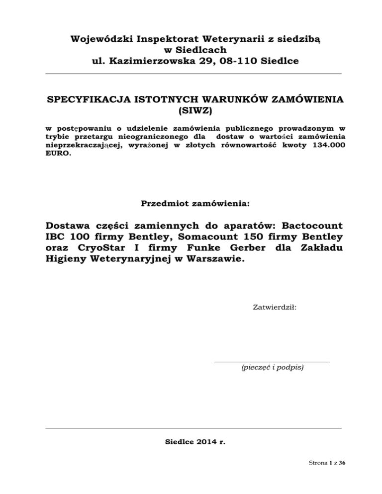Wojewódzki Inspektorat Weterynarii z siedzibą w Siedlcach ul. Kazimierzowska 29, 08-110 Siedlce _____________________________________________________________________________ SPECYFIKACJA ISTOTNYCH WARUNKÓW ZAMÓWIENIA (SIWZ) w postępowaniu o udzielenie zamówienia publicznego prowadzonym w trybie przetargu nieograniczonego dla dostaw o wartości zamówienia nieprzekraczającej, wyrażonej w złotych równowartość kwoty 134.000 EURO. Przedmiot zamówienia: Dostawa części zamiennych do aparatów: Bactocount IBC 100 firmy Bentley, Somacount 150 firmy Bentley oraz CryoStar I firmy Funke Gerber dla Zakładu Higieny Weterynaryjnej w Warszawie. Zatwierdził: ______________________________ (pieczęć i podpis) _____________________________________________________________________________ Siedlce 2014 r. Strona 1 z 36 ROZDZIAŁ I – POSTANOWIENIA OGÓLNE. 1. Nazwa oraz adres Zamawiającego: Wojewódzki Inspektorat Weterynarii z siedzibą w Siedlcach 08-110 Siedlce ul. Kazimierzowska 29 NIP: 821-20-68-188 telefon: + 48 (25) 63 264 59, Faks: + 48 (25) 63 255 84 adres strony internetowej: www.wiw.mazowsze.pl 2. Oznaczenie postępowania. Postępowanie, którego dotyczy niniejsza SIWZ oznaczone jest znakiem: WIW-AD-I.272.40.2014. Wykonawcy zobowiązani są do powoływania się na wyżej podane oznaczenie we wszelkich kontaktach z Zamawiającym. 3. Tryb udzielenia zamówienia. 3.1. Postępowanie o udzielenie zamówienia prowadzone jest w trybie przetargu nieograniczonego o wartości szacunkowej poniżej 134.000 EURO na podstawie ustawy z dnia 29 stycznia 2004 r. Prawo zamówień publicznych (Dz. U. z 2013 r., poz. 907 z późn. zm.). 3.2. Ilekroć w niniejszej SIWZ zastosowane jest pojęcie „ustawa”, „ustawa Pzp” lub „Pzp”, należy przez to rozumieć ustawę Prawo zamówień publicznych, o której mowa w pkt. 3.1. 3.3. Zamawiający nie przewiduje wyboru najkorzystniejszej oferty z zastosowaniem aukcji elektronicznej, o której mowa w art. 91a 91c ustawy Pzp. 4. Opis przedmiotu zamówienia. 4.1. Przedmiotem zamówienia jest dostawa części zamiennych do aparatów: Bactocount IBC 100 firmy Bentley, Somacount 150 firmy Bentley oraz CryoStar I firmy Funke Gerber dla Zakładu Higieny Weterynaryjnej w Warszawie. 4.2. Szczegółowe określenie zakresu przedmiotu zamówienia zawarte jest w Rozdziale XVII SIWZ: „Szczegółowy opis przedmiotu zamówienia”, w Załączniku nr 6 do SIWZ: „Wzór Umowy”. 4.3. Zamawiający nie przewiduje zawarcia umowy ramowej. 4.4. Zamawiający nie dopuszcza składania ofert wariantowych w rozumieniu art. 2 pkt 7 ustawy Pzp. 4.5. Zamawiający nie przewiduje zamówień uzupełniających. 4.6. Zamawiający nie przewiduje rozliczenia w walucie obcej. 4.7. Zamawiający nie przewiduje zmian cen wynikających ze zmiany kursów walut. 4.8. Kod wg. CPV: 42.95.60.00-2. 5. Termin wykonania i miejsce realizacji zamówienia. 5.1. Termin i miejsce realizacji zamówienia: zgodnie z harmonogramem dostaw stanowiącym załącznik nr 8 do niniejszej SIWZ. Strona 2 z 36 ROZDZIAŁ II - WARUNKI UDZIAŁU W POSTĘPOWANIU ORAZ OPIS SPOSOBU DOKONYWANIA OCENY SPEŁNIANIA TYCH WARUNKÓW. 1. O udzielenie zamówienia ubiegać się mogą Wykonawcy, którzy spełniają warunki dotyczące: posiadania uprawnień do wykonywania określonej działalności lub czynności, jeżeli przepisy prawa nakładają obowiązek ich posiadania; posiadania wiedzy i doświadczenia; dysponowania odpowiednim potencjałem technicznym oraz osobami zdolnymi do wykonania zamówienia; sytuacji ekonomicznej i finansowej. 2. Opis sposobu dokonania oceny spełniania warunków: 2.1. Zamawiający oceni, czy Wykonawca spełnia warunki udziału w postępowaniu na podstawie oświadczeń i dokumentów wymienionych w rozdziale III pkt. od 1.1 SIWZ, a ocena zostanie dokonana na zasadzie „spełnia/niespełnia”. 2.2. Jeżeli Wykonawca nie dołączy do oferty wymaganych oświadczeń i dokumentów lub z ich treści nie będzie wynikać, że zostały spełnione warunki udziału w postępowaniu - z zastrzeżeniem art. 26 ust. 3 ustawy Pzp, to Zamawiający wykluczy Wykonawcę na podstawie art. 24 ust. 2 pkt 4 ustawy Pzp. 2.3. Wykonawcy, którzy ubiegają się wspólnie o udzielenie zamówienia warunek wiedzy i doświadczenia mogą spełniać łącznie. ROZDZIAŁ III - WYKAZ OŚWIADCZEŃ LUB DOKUMENTÓW, JAKIE MAJĄ DOSTARCZYĆ WYKONAWCY W CELU OCENY SPEŁNIANIA PRZEZ WYKONAWCĘ WARUNKÓW UDZIAŁU W POSTĘPOWANIU. 1. Wykonawca jest zobowiązany wykazać nie później niż na dzień składania ofert spełnianie warunków, o których mowa w art. 22 ust. 1 ustawy Pzp, a których opis sposobu oceny spełniania został dokonany w ogłoszeniu o zamówieniu oraz niniejszej SIWZ. W celu oceny spełniania przez wykonawcę warunków, o których mowa w art. 22 ust. 1 ustawy Pzp, Zamawiający żąda dołączenia do oferty następujących dokumentów: 1.1. Oświadczenia o spełnianiu warunków udziału w postępowaniu – wg wzoru stanowiącego Załącznik nr 1 do SIWZ; 2. Jeżeli wykonawca, wykazując spełnianie warunków, o których mowa w art. 22 ust. 1 ustawy, polega na zasobach innych podmiotów na zasadach określonych w art. 26 ust. 2b ustawy, a podmioty te będą brały udział w realizacji części zamówienia, zamawiający żąda od wykonawcy dołączenia do oferty, w odniesieniu do tych podmiotów, dokumentów wymienionych w rozdziale IV pkt od 1.1 do 1.5 SIWZ. 3. Jeżeli wykonawca, wykazując spełnianie warunków polega na zasobach innych podmiotów na zasadach określonych w art. 26 ust. 2b ustawy, zamawiający, w celu oceny, czy wykonawca będzie dysponował zasobami innych podmiotów w stopniu niezbędnym dla należytego wykonania zamówienia oraz oceny, czy stosunek łączący wykonawcę z tymi podmiotami gwarantuje rzeczywisty dostęp do ich zasobów, żąda dołączenia do oferty dokumentów dotyczących w szczególności: 3.1. zakresu dostępnych wykonawcy zasobów innego podmiotu, Strona 3 z 36 4. 3.2. sposobu wykorz