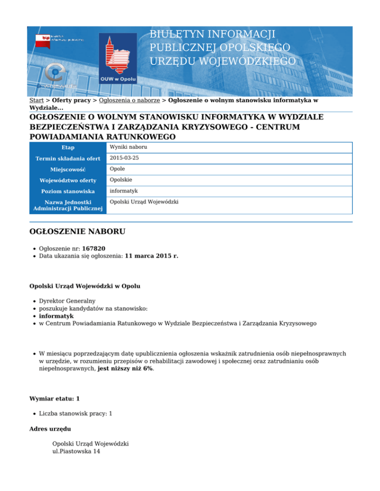 BIULETYN INFORMACJI PUBLICZNEJ OPOLSKIEGO URZĘDU WOJEWÓDZKIEGO Start > Oferty pracy > Ogłoszenia o naborze > Ogłoszenie o wolnym stanowisku informatyka w Wydziale... OGŁOSZENIE O WOLNYM STANOWISKU INFORMATYKA W WYDZIALE BEZPIECZEŃSTWA I ZARZĄDZANIA KRYZYSOWEGO - CENTRUM POWIADAMIANIA RATUNKOWEGO Etap Termin składania ofert Miejscowość Wyniki naboru 2015-03-25 Opole Województwo oferty Opolskie Poziom stanowiska informatyk Nazwa Jednostki Administracji Publicznej Opolski Urząd Wojewódzki OGŁOSZENIE NABORU Ogłoszenie nr: 167820 Data ukazania się ogłoszenia: 11 marca 2015 r. Opolski Urząd Wojewódzki w Opolu Dyrektor Generalny poszukuje kandydatów na stanowisko: informatyk w Centrum Powiadamiania Ratunkowego w Wydziale Bezpieczeństwa i Zarządzania Kryzysowego W miesiącu poprzedzającym datę upublicznienia ogłoszenia wskażnik zatrudnienia osób niepełnosprawnych w urzędzie, w rozumieniu przepisów o rehabilitacji zawodowej i społecznej oraz zatrudnianiu osób niepełnosprawnych, jest niższy niż 6%. Wymiar etatu: 1 Liczba stanowisk pracy: 1 Adres urzędu Opolski Urząd Wojewódzki ul.Piastowska 14 45-082 Opole Miejsce wykonywania pracy: Opole Opolski Urząd Wojewódzki ul.Oleska 123 45-233 Opole Zakres zadań wykonywanych na stanowisku pracy: przeprowadzanie czynności instalacji, konserwacji, modyfikacji, napraw oraz wymiany sprzętu teleinformatycznego zainstalowanego w dyspozytorni medycznej, miejscach stacjonowania zespołów ratownictwa medycznego oraz zespołach ratownictwa medycznego, monitorowanie i nadzorowanie stanu zainstalowanego sprzętu teleinformatycznego w Głównej Dyspozytorni Medycznej, miejscach stacjonowania zespołów ratownictwa medycznego i zespołach ratownictwa medycznego niezbędnego do sprawnego funkcjonowania SWD PRM, zapewnienie funkcjonowania stanowisk teleinformatycznego SWD PRM lekarza koordynatora ratownictwa medycznego, testowanie sprzętu teleinformatyczny niezbędnego do funkcjonowania SWD PRM, współdziałanie ze starszym informatykiem w zakresie nadzoru nad prawidłowym działaniem SWD PRM. prowadzenie ewidencji sprzętu teleinformatycznego przekazanego dysponentom zespołów ratownictwa medycznego. Warunki pracy Warunki dotyczące charakteru pracy na stanowisku i sposobu wykonywania zadań 1.Wyjazdy krajowe. 2.Nietypowe godziny pracy (dyżury). 3.Reprezentowanie urzędu na zewnątrz. Miejsce i otoczenie organizacyjno-techniczne stanowiska pracy Narzędzia pracy: standardowy zestaw komputerowy. Inne Wymagania związane ze stanowiskiem pracy niezbędne wykształcenie: średnie informatyczne lub telekomunikacyjne. doświadczenie zawodowe/staż pracy: 1 rok doświadczenia zawodowego na stanowisku administratora lub programisty lub serwisanta informatycznego pozostałe wymagania niezbędne: znajomość ustawy o systemie powiadamiania ratunkowego, znajomość ustawy o Państwowym Ratownictwie Medycznym, znajomość ustawy o służbie cywilnej, znajomość o ustawy o wojewodzie i administracji rządowej w województwie, znajomość kodeksu postępowania administracyjnego, znajomość ustawy o ochronie danych osobowych, umiejętność pracy w zespole posiadanie poświadczenia bezpieczeństwa uprawniającego do dostępu do informacji niejawnych, lub wyrażenie zgody na poddanie się sprawdzającej prawo jazdy kat. B znajomość języka angielskiego na poziomie komunikatywnym, dyspozycyjność, komunikatywność, zdolność analitycznego myślenia, szybkie podejmowanie decyzji. wymagania dodatkowe 0,5 roku doświadczenie w pracy w administracji publicznej, w obszarze systemu powiadamiania ratunkowego. przeszkolenia z sieci teleinformatycznej, łączności radiowej. umiejętność szybkiego uczenia się, znajomość sieci LAN, WAN, obsługa urządzeń sieciowych, samoorganizacja pracy. Wymagane dokumenty i oświadczenia: życiorys i list motywacyjny oświadczenie kandydata o wyrażeniu zgody na przetwarzanie danych osobowych do celów rekrutacji oświadczenie kandydata o korzystaniu z pełni praw publicznych oświadczenie kandydata o nieskazaniu prawomocnym wyrokiem za umyślne przestępstwo lub umyślne przestępstwo skarbowe kopie dokumentów potwierdzających wykształcenie kopia dokumentu potwierdzającego posiadanie polskiego obywatelstwa lub oświadczenie o posiadaniu obywatelstwa polskiego • kopia dokumentu potwierdzającego pracę na stanowisku administratora lub programisty lub serwisanta informatycznego. Inne dokumenty i oświadczenia kopia dokumentu potwierdzającego niepełnosprawność - w przypadku kandydatów, którzy zamierzają skorzystać z pierwszeństwa w zatrudnieniu w przypadku, gdy znajdą się w gronie najlepszych kandydatów Termin składania dokumentów: 25-03-2015 Miejsce składania dokumentów: Opolski Urząd Wojewódzki Sekretariat Dyrektora Generalnego, pok. 251 ul. Piastowska 14 45-082 Opole z dopiskiem " oferta pracy oraz nr ogłoszenia " Inne informacje: Lista kandydatów zakwalifikowanych do kolejnego etapu postępowania kwalifikacyjnego zostanie opublikowana na stronie www.bip.opole.uw.gov.pl w zakładkach: praca w Urzędzie-wykaz kandydatów spełniających wymagania oraz na tablicy ogłoszeń w gmachu OUW (II piętro). Niewykorzystane oferty kandydaci mogą odebrać w Oddziale Kadr Urzędu. Nieodebrane oferty zostaną zniszczone komisyjnie po upływie minimum 3 miesięcy od zakończenia naboru. Proponowane wynagrodzenie zasadnicze 2650.- złotych brutto. Dodatkowe informacje: (077) 4216-830 lub (077) 4524-255 WYKAZ OSÓB SPEŁNIAJĄCYCH WYMAGANIA Lista kandydatów spełniających wymogi na stanowisko informatyka w Centrum Powiadamiania Ratunkowego w Wydziale Bezpieczeństwa i Zarzadzania Kryzysowego. Niżej wymienione osoby zapraszamy w dniu 8 kwietnia 2015 r. o godz. 11:30 do sali 203, znajdującej się na II piętrze w budynku Opolskiego Urzędu Wojewódzkiego w Opolu, ul. Piastowska 14, na rozmowę kwalifikacyjną Na nabór proszę zgłosić się z dokumentem tożsamości. Dodatkowe informacje