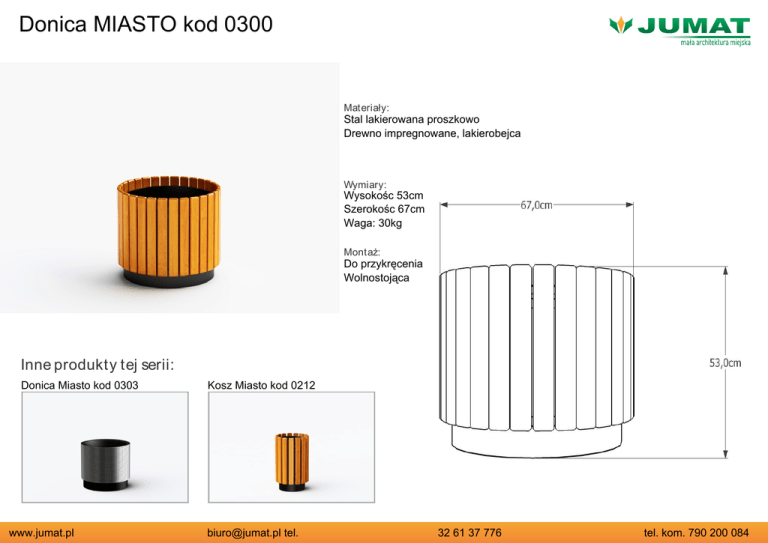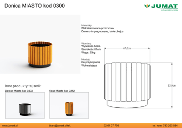 Donica MIASTO kod 0300 Materiały: Stal lakierowana proszkowo Drewno impregnowane, lakierobejca Wymiary: Wysokośc 53cm Szerokośc 67cm Waga: 30kg Montaż: Do przykręcenia Wolnostojąca Inne produkty tej serii: Donica Miasto kod 0303 www.jumat.pl Kosz Miasto kod 0212 [email protected] tel. 32 61 37 776 tel. kom. 790 200 084