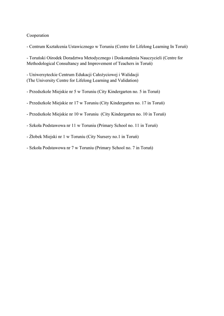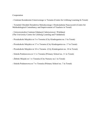Cooperation - Centrum Kształcenia Ustawicznego w Toruniu (Centre for Lifelong Learning In Toruń) - Toruński Ośrodek Doradztwa Metodycznego i Doskonalenia Nauczycieli (Centre for Methodological Consultancy and Improvement of Teachers in Toruń) - Uniwersyteckie Centrum Edukacji Całożyciowej i Walidacji (The University Centre for Lifelong Learning and Validation) - Przedszkole Miejskie nr 5 w Toruniu (City Kindergarten no. 5 in Toruń) - Przedszkole Miejskie nr 17 w Toruniu (City Kindergarten no. 17 in Toruń) - Przedszkole Miejskie nr 10 w Toruniu (City Kindergarten no. 10 in Toruń) - Szkoła Podstawowa nr 11 w Toruniu (Primary School no. 11 in Toruń) - Żłobek Miejski nr 1 w Toruniu (City Nursery no.1 in Toruń) - Szkoła Podstawowa nr 7 w Toruniu (Primary School no. 7 in Toruń)