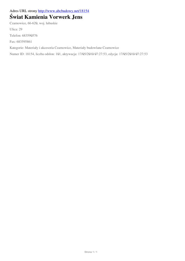 Adres URL strony http://www.abcbudowy.net/18154 Świat Kamienia Vorwerk Jens Czarnowice, 66-620, woj. lubuskie Ulica: 29 Telefon: 683590576 Fax: 683595861 Kategorie: Materiały i akcesoria Czarnowice, Materiały budowlane Czarnowice Numer ID: 18154, liczba odsłon: 101, aktywacja: 17/05/2010 07:27:53, edycja: 17/05/2010 07:27:53 Strona 1 / 1