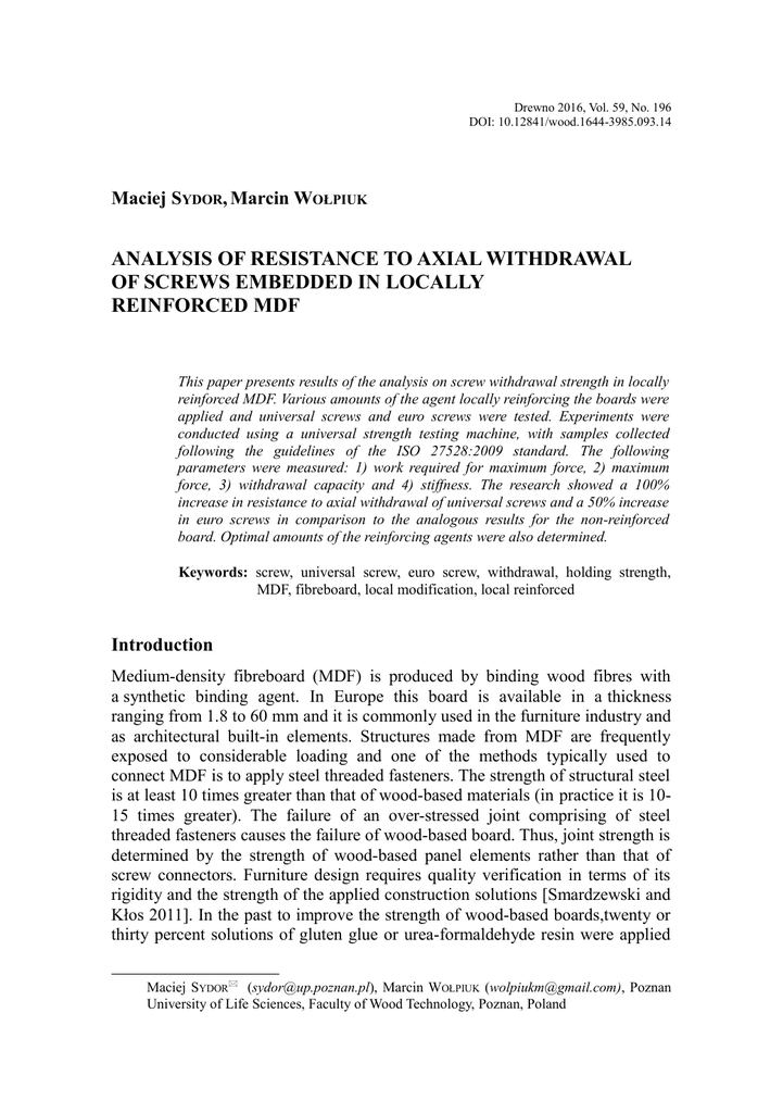 Drewno 2016, Vol. 59, No. 196 DOI: 10.12841/wood.1644-3985.093.14 Maciej SYDOR, Marcin WOŁPIUK ANALYSIS OF RESISTANCE TO AXIAL WITHDRAWAL OF SCREWS EMBEDDED IN LOCALLY REINFORCED MDF This paper presents results of the analysis on screw withdrawal strength in locally reinforced MDF. Various amounts of the agent locally reinforcing the boards were applied and universal screws and euro screws were tested. Experiments were conducted using a universal strength testing machine, with samples collected following the guidelines of the ISO 27528:2009 standard. The following parameters were measured: 1) work required for maximum force, 2) maximum force, 3) withdrawal capacity and 4) stiffness. The research showed a 100% increase in resistance to axial withdrawal of universal screws and a 50% increase in euro screws in comparison to the analogous results for the non-reinforced board. Optimal amounts of the reinforcing agents were also determined. Keywords: screw, universal screw, euro screw, withdrawal, holding strength, MDF, fibreboard, local modification, local reinforced Introduction Medium-density fibreboard (MDF) is produced by binding wood fibres with a synthetic binding agent. In Europe this board is available in a thickness ranging from 1.8 to 60 mm and it is commonly used in the furniture industry and as architectural built-in elements. Structures made from MDF are frequently exposed to considerable loading and one of the methods typically used to connect MDF is to apply steel threaded fasteners. The strength of structural steel is at least 10 times greater than that of wood-based materials (in practice it is 1015 times greater). The failure of an over-stressed joint comprising of steel threaded fasteners causes the failure of wood-based board. Thus, joint strength is determined by the strength of wood-based panel elements rather than that of screw connectors. Furniture design requires quality verification in terms of its rigidity and the strength of the applied construction solutions [Smardzewski and Kłos 2011]. In the past to improve the strength of wood-based boards,twenty or thirty percent solutions of gluten glue or urea-formaldehyde resin were applied Maciej SYDOR ([email protected]), Marcin WOŁPIUK ([email protected]), Poznan University of Life Sciences, Faculty of Wood Technology, Poznan, Poland 174 Maciej SYDOR, Marcin WOŁPIUK inside the pilot holes. This solution provided an enhanced screw holding capacity and uniform values for different fastening directions [Ławniczak and Paprzycki 1961]. Wood based composites were also investigated after vacuumimpregnation of copper azole and chromated copper arsenate [Taşçioğlu et al. 2014]. Advances in polymer chemistry have led to the development of novel polyurethane products with potentially advantageous properties [Proszyk 2009]. The aim of the study was to investigate the effect of local reinforcement of MDF with a novel polyurethane product on resistance to axial withdrawal of screws. The experiment described in this paper was conducted whilst taking into consideration the conclusions and observations made in the course of preliminary studies by Pohl and Wołpiuk [2011], e.g. the range of applications was increased, the experimental stand was modified to ensure the acquisition of increased measurement data, while changes were introduced in the design of the pull-out testing machine to increase its rigidity. Additionally, the strength properties were precisely determined for the MDF, from which samples were collected. Material and methods Analyses were conducted on MDF of 18 mm in thickness. The wood-based panel was composed of three layers (fig. 1) [Geimer et al. 1975; Wilczyński and Kociszewski 2007]. The averaged material properties of the two outer (face) layers (of arbitrarily assumed 2.2 mm thickness) were identical, while the core, of lower density, was characterised by markedly different material properties. The research was used on a board produced by the same manufacturer as used in the Kociszewski’s study [Kociszewski 2014]. Table 1 presents the numerical values of the material properties for layers of MDF, from which samples were collected. Analyses were conducted for two types of fasteners, commonly used in the assembly of furniture joints, i.e. universal screws of 4 × 35 and euro screws of 6.3 × 23 in size (fig. 1). MDF samples had dimensions of 75 × 75 × 18 mm (specified in the standard ISO 27528:2009). Fasteners were mounted in the face of test pieces to a depth of 15 mm into previously drilled pilot holes with a diameter corresponding to the minor diameter of the screw (diameter D 3 in fig. 2). The manner of screw mounting in the panel samples and the direction of the pull-out force is presented in figure 3. Analysis of resistance to axial withdrawal of screws embedded in locally reinforced MDF 175 Table 1. Physical properties of wood-based panels used in research MDF with PUR Parameter MDF1 application2 Thickness t (mm) 18.0 ±0.2 Moisture content ϕ (%) 7.7 mean 787.7 935.4 Density ρ (kg/m3) outer layer 952.7 1031.2 inner layer 732.5 904.4 Ex1 6.08 8.03 Ey1 5.88 8.03 Young's modulus Ez1 1.16 1.83 E 2.68 5.39 x2 (GPa) (EN 310) Ey2 2.65 5.39 Ez2 0.50 1.30 1 According to Kociszewski [2014]. According to the authors’ study. 2 Fig. 1. A model of a three-layer wood-based panel: x – in the board plane perpendicular to direction of mat formation, y – direction of panel production, z – perpendicular to board plane The panel was locally reinforced using the PUR 555.6 nano polyurethane product by Kleiberit. The application rates of the product were determined based on the volume of fastener threads. The volume of the applied preparation is referred to as application unit (V), described by the formula: 2 V= 2 π( D − D3 )⋅L 4 176 Maciej SYDOR, Marcin WOŁPIUK where: L – depth of fastener mounting D – major diameter of the thread D3 – minor diameter of thread. a) b) Fig. 2. Fasteners used in tests: