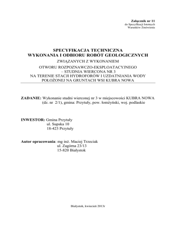 Załącznik nr 11 do Specyfikacji Istotnych Warunków Zmówienia SPECYFIKACJA TECHNICZNA WYKONANIA I ODBIORU ROBÓT GEOLOGICZNYCH ZWIĄZANYCH Z WYKONANIEM OTWORU ROZPOZNAWCZO-EKSPLOATACYJNEGO – STUDNIA WIERCONA NR 3 NA TERENIE STACJI HYDROFORÓW I UZDATNIANIA WODY POŁOŻONEJ NA GRUNTACH WSI KUBRA NOWA ZADANIE: Wykonanie studni wierconej nr 3 w miejscowości KUBRA NOWA (dz. nr 2/1), gmina: Przytuły, pow. łomżyński, woj. podlaskie INWESTOR: Gmina Przytuły ul. Supska 10 18-423 Przytuły Autor opracowania: mg inż. Maciej Trzeciak ul. Zagórna 23/13 15-820 Białystok Białystok, kwiecień 2013r SPIS TREŚCI 1. Wstęp 1.1 Przedmiot STWiOR 1.2 Zakres stosowania STWiOR 1.3 Zakres objętych robót STWiOR 1.4 Określenia podstawowe 2. Warunki ogólne wykonania i odbioru robót 2.1 Ogólne wymagania dotyczące robót 2.2 Materiały i urządzenia 2.3 Sprzęt 2.4 Wykonanie robót 2.5 Kontrola jakości robót 2.6 Odbiór robót 2.7 Podstawa płatności 3. Warunki szczegółowe wykonania i odbioru robót 3.1 Zakres robót objętych przedmiotem zamówienia 3.2 Przedmiar robót 3.3 Materiały 3.4 Sprzęt 3.5 Transport 3.6 Wykonania robót 3.7 Kontrola jakości robót oraz ich odbiór 3.8 Likwidacja otworu 3.9 Przepisy związane 1. Wstęp 1.1 Przedmiot STWiOR Przedmiotem „Specyfikacji Technicznej Wykonania i Odbioru Robót” (STWiOR) są wymagania dotyczące wykonania i odbioru robót geologicznych otworu rozpoznawczoeksploatacyjnego – studnia wiercona nr 3 na terenie ujęcia wody w obrębie stacji hydroforów i uzdatniania wody położonej na gruntach miejscowości Kubra Nowa, gm. Przytuły, pow. łomżyński, woj. podlaskie. 1.2 Zakres stosowania STWiOR Specyfikacja Techniczna nazywana dalej STWiOR, stanowi dokument przetargowy i jeden z elementów Specyfikacji Istotnych Warunków Zamówienia Publicznego. Zawiera wykaz wymagań związanych z wykonaniem otworu nr 3 rozpoznawczo – eksploatacyjnego na terenie stacji hydroforów i uzdatniania wody w msc. Kubra Nowa (dz. geod. nr 2/1). W szczególności wymagania te dotyczą: - wykonania i oceny prawidłowości realizacji prac i robót, - zakresu prac ujętych w przedmiarze robót, - materiałów użytych do realizacji zadania. 1.3 Zakres prac objętych STWiOR Obejmuje one wszystkie prace związane z wykonaniem otworu nr 3. Szczegółowy zakres prac przedstawiono w rozdziale nr 3.4. 1.4 Określenia podstawowe Ilekroć w STWiOR używane są określenia techniczne z branży geologiczno – wiertniczej oraz sanitarnej, to oznaczają: 1) otwór studzienny – wykonany odwiert wraz z rurami eksploatacyjnymi oraz filtrem; 2) studnia – otwór studzienny wyposażony w obudowę, przewód tłoczny, pompę i armaturę niezbędną do poboru wody; 3) kolumna filtracyjna – rura stalowa, PCV lub innego materiału, składająca się z części podfiltrowej, czynnej oraz rury nadfiltrowej; 4) rura podfiltrowa – osadnik pod częścią czynną filtru; 5) część czynna filtra – perforowana i osiatkowana lub ze szczelinami rura, umożliwiająca dopływ wody do otworu; 6) obsypka żwirowa lub piaskowa – opuszczony w strefie wokółfiltrowej żwir lub piasek gruboziarnisty o średnicy ziaren umożliwiającej dopływ wody lecz zatrzymującej ziarna warstwy wodonośnej. Granulację określa nadzorujący prace geolog; 7) pompa głębinowa – agregat pompowy umożliwiający pobór wody i tłoczący wodę do hydroforni; 8) hydrofor – zbiornik ciśnieniowy utrzymujący ciśnienie w sieci wodociągowej; 9) sieć wodociągowa – zespół połączonych rur ocynkowanych lub PCV, prowadzących wodę do punktów czerpalnych; 10) szlamowanie – oczyszczanie otworu wiertniczego z osadu; 11) kolumnowe wyciąganie rur – wyciąganie rur z zarurowanego otworu; 12) wiertnica – urządzenie służące do prowadzenie procesu wiercenia otworu studziennego lub jego likwidacji; 13) dźwigniki hydrauliczne – urządzenie do mechanicznego wciskania lub wyciągania kolumny rur wiertniczych lub eksploatacyjnych; 14) rury eksploatacyjne – kolumna rur posiadająca bezpośredni kontakt z wodą i umożliwiająca zabudowę rurociągu tłocznego z pompą głębinową; 15) rury pomocnicze – rury używane do wiercenia, usuwane po zafiltrowaniu otworu; 16) likwidacja studni – wypełnienie studni materiałem spoistym lub piaszczystym oraz usunięcie urządzeń do poboru wody, w tym znajdujących się w obudowie wraz z likwidacją obudowy; 17) likwidacja otworu studziennego – wypełnienie otworu materiałem spoistym lub piaszczystym w trakcie usuwania filtra i rur z otworu do dna obudowy z wyłączeniem likwidacji obudowy; 18) zamek na rurze nadfiltrowej – wycięcie na rurze nadfiltrowej umożliwiające włożenie klucza połączonego z żerdziami stalowymi celem opuszczenia kolumny filtracyjnej do otworu; 19) klucz – stalowy pałąk wyluzowywany z zamka po posadowieniu filtra; 20) obudowa studni – osłona otworu oraz urządzeń do poboru wody zabezpieczająca cykl produkcyjny wody przed wodami opadowymi, zanieczyszczeniami zewnętrznymi oraz dostępem osób nieupoważnionych. Może być naziemna typu „ Lange”, bądź podziemna żelbetowa; 21) wodomierz – urządzenie wskazujące i rejestrujące ilość wody tłoczonej do hydroforni lub sieci wodociągowej; 22) zasuwa – urządzenie regulujące przepływ wody w wodociągu; 23) zawór zwrotny – urządzenie zapewniające jeden kierunek przepływu wody, zabezpieczające przed zrzutem wody do studni z rurociągu tłocznego; 24) wywietrznik – system zapewniający cyrkulację powietrza wewnątrz obudowy; 25) skrzynka elektryczna – zespół urządzeń elektrycznych sterujących prace agregatu pompowego; 26) plejstocen – najmłodszy, możliwy do ujęcia poziom wodonośny w analizowanym regionie; 27) otwór awaryjny – otwór studzienny możliwy do eksploatacji przemiennej z otworem podstawowym; 28) szlamowanie odciążające – wybieranie osadu z filtra celem zredukowania jego ciężaru przed podjęciem prób u
