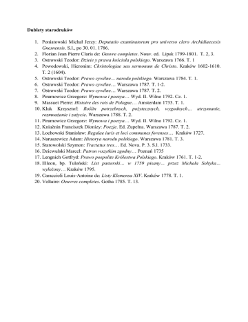 Dublety starodruków 1. Poniatowski Michał Jerzy: Deputatio examinatorum pro universo clero Archidiaecesis Gnesnensis. S.l., po 30. 01. 1786. 2. Florian Jean Pierre Claris de: Oeuvre completes. Nouv. ed. Lipsk 1799-1801. T. 2, 3. 3. Ostrowski Teodor: Dzieie y prawa kościoła polskiego. Warszawa 1766. T. 1 4. Powodowski, Hieronim: Christologiae seu sermonum de Christo. Kraków 1602-1610. T. 2 (1604). 5. Ostrowski Teodor: Prawo cywilne… narodu polskiego. Warszawa 1784. T. 1. 6. Ostrowski Teodor: Prawo cywilne… Warszawa 1787. T. 1-2. 7. Ostrowski Teodor: Prawo cywilne… Warszawa 1787. T. 2. 8. Piramowicz Grzegorz: Wymowa i poezya… Wyd. II. Wilno 1792. Cz. 1. 9. Massuet Pierre: Histoire des rois de Pologne… Amsterdam 1733. T. 1. 10. Kluk Krzysztof: Roślin potrzebnych, pożytecznych, wygodnych… utrzymanie, rozmnażanie i zażycie. Warszawa 1788. T. 2. 11. Piramowicz Grzegorz: Wymowa i poezya… Wyd. II. Wilno 1792. Cz. 1. 12. Kniaźnin Franciszek Dionizy: Poezje. Ed. Zupełna. Warszawa 1787. T. 2. 13. Łochowski Stanisław: Regulae iuris et loci communes forenses… Kraków 1727. 14. Naruszewicz Adam: Historya narodu polskiego. Warszawa 1781. T. 3. 15. Starowolski Szymon: Tractatus tres… Ed. Nova. P. 3. S.l. 1733. 16. Dziewulski Marcel: Patron wszytkim zgodny… Poznań 1735 17. Lengnich Gotfryd: Prawo pospolite Królestwa Polskiego. Kraków 1761. T. 1-2. 18. Elleon, bp. Tuloński: List pasterski… w 1759 pisany… przez Michała Sołtyka… wyłożony… Kraków 1795. 19. Caraccioli Louis-Antoine de: Listy Klemensa XIV. Kraków 1778. T. 1. 20. Voltaire: Oeuvres completes. Gotha 1785. T. 13.