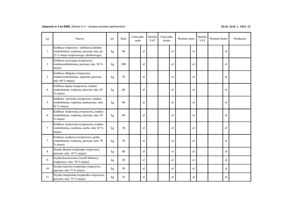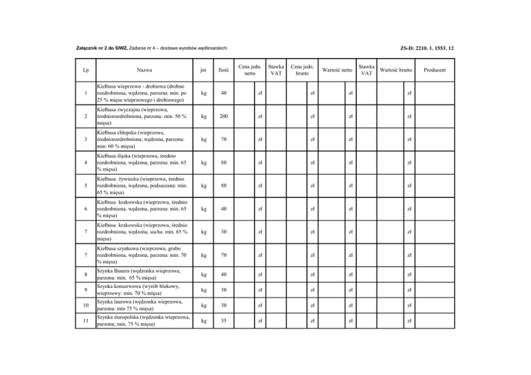 ZS-D: 2210. 1. 1553. 12 Załącznik nr 2 do SIWZ, Zadanie nr 4 – dostawa wyrobów wędliniarskich. Lp Nazwa jm Ilość Cena jedn. netto Stawka VAT Cena jedn. brutto Wartość netto Stawka Wartość brutto VAT 1 Kiełbasa wieprzowo - drobiowa (drobno rozdrobniona, wędzona, parzona: min. po 25 % mięsa wieprzowego i drobiowego) kg 40 zł zł zł zł 2 Kiełbasa zwyczajna (wieprzowa, średniorozdrobniona, parzona: min. 50 % mięsa) kg 200 zł zł zł zł 3 Kiełbasa chłopska (wieprzowa, średniorozdrobniona, wędzona, parzona: min: 60 % mięsa) kg 70 zł zł zł zł 4 Kiełbasa śląska (wieprzowa, średnio rozdrobniona, wędzona, parzona: min. 65 % mięsa) kg 80 zł zł zł zł 5 Kiełbasa żywiecka (wieprzowa, średnio rozdrobniona, wędzona, podsuszana: min. 65 % mięsa) kg 80 zł zł zł zł 6 Kiełbasa krakowska (wieprzowa, średnio rozdrobniona, wędzona, parzona: min. 65 % mięsa) kg 40 zł zł zł zł 7 Kiełbasa krakowska (wieprzowa, średnio rozdrobniona, wędzona, sucha: min. 65 % mięsa) kg 30 zł zł zł zł 7 Kiełbasa szynkowa (wieprzowa, grubo rozdrobniona, wędzona, parzona: min. 70 % mięsa) kg 70 zł zł zł zł 8 Szynka Bauera (wędzonka wieprzowa, parzona: min. 65 % mięsa) kg 40 zł zł zł zł 9 Szynka konserwowa (wyrób blokowy, wieprzowy: min. 70 % mięsa) kg 30 zł zł zł zł 10 Szynka laurowa (wędzonka wieprzowa, parzona: min 75 % mięsa) kg 30 zł zł zł zł 11 Szynka staropolska (wędzonka wieprzowa, parzona; min. 75 % mięsa) kg 35 zł zł zł zł Producent 12 13 Schabik drobiowy (drobiowy, wysokowydajny, parzony: min. 55 % mięsa) Polędwica drobiowa (wysokowydajna, parzona: min. 65 % mięsa) kg 30 zł zł zł zł kg 35 zł zł zł zł 14 Polędwica sopocka wieprzowa (wędzonka wieprzowa, parzona: min. 70 % mięsa) kg 40 zł zł zł zł 15 Boczek gotowany (wędzonka wieprzowa, parzona: min. 75 % mięsa) kg 65 zł zł zł zł 16 Parówka (kiełbasa wieprzowa, homogenizowana, parzona: min. 35 % mięsa) kg 350 zł zł zł zł kg 40 zł zł zł zł kg 30 zł zł zł zł 17 18 Mortadela (kiełbasa wieprzowa, homogenizowana, parzona: min. 40 % mięsa) Kiełbasa pasztetowa (podrobowa, wieprzowo - drobiowa, parzona: min. 40 % mięsa) 19 Pasztet pieczony (wyrób blokowy, wieprzowy: min 40 % miesa) kg 80 zł zł zł zł 20 Lencz (wieprzowy, parzony: min. 45 % mięsa) kg 40 zł zł zł zł 21 Salceson (wieprzowy, przony: min 45 % mięsa) kg 20 zł zł zł zł zł zł RAZEM: Zamawiający dopuszcza możliwość dostawy innych niż wyszczególnione produkty, o ile będą one rodzajowo takie, jak wskazane i będą posiadały wskazane parametry równoważności lub parametry te będą wyższe niż wskazane. Zamawiający domaga się dołączenia do niniejszej specyfikacji cenowej metek wyrobów zawierających co najmnie: nazwę handlową (np. Szynka Bauera), nazwę produktu (np. wędzonka wieprzowa, parzona), skład surowcowy, w szczególności zawartość i rodzaj mięsa (np. mięso wieprzowe min. 60 %, konserwanty, barwniki, stabilizatory itp.), wagę wyrobu, producenta.