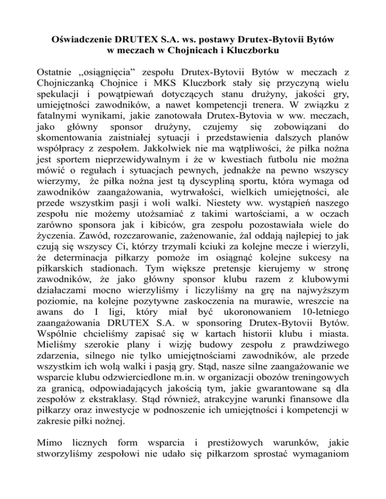 Oświadczenie DRUTEX S.A. ws. postawy Drutex-Bytovii Bytów w meczach w Chojnicach i Kluczborku Ostatnie ,,osiągnięcia” zespołu Drutex-Bytovii Bytów w meczach z Chojniczanką Chojnice i MKS Kluczbork stały się przyczyną wielu spekulacji i powątpiewań dotyczących stanu drużyny, jakości gry, umiejętności zawodników, a nawet kompetencji trenera. W związku z fatalnymi wynikami, jakie zanotowała Drutex-Bytovia w ww. meczach, jako główny sponsor drużyny, czujemy się zobowiązani do skomentowania zaistniałej sytuacji i przedstawienia dalszych planów współpracy z zespołem. Jakkolwiek nie ma wątpliwości, że piłka nożna jest sportem nieprzewidywalnym i że w kwestiach futbolu nie można mówić o regułach i sytuacjach pewnych, jednakże na pewno wszyscy wierzymy, że piłka nożna jest tą dyscypliną sportu, która wymaga od zawodników zaangażowania, wytrwałości, wielkich umiejętności, ale przede wszystkim pasji i woli walki. Niestety ww. wystąpień naszego zespołu nie możemy utożsamiać z takimi wartościami, a w oczach zarówno sponsora jak i kibiców, gra zespołu pozostawiała wiele do życzenia. Zawód, rozczarowanie, zażenowanie, żal oddają najlepiej to jak czują się wszyscy Ci, którzy trzymali kciuki za kolejne mecze i wierzyli, że determinacja piłkarzy pomoże im osiągnąć kolejne sukcesy na piłkarskich stadionach. Tym większe pretensje kierujemy w stronę zawodników, że jako główny sponsor klubu razem z klubowymi działaczami mocno wierzyliśmy i liczyliśmy na grę na najwyższym poziomie, na kolejne pozytywne zaskoczenia na murawie, wreszcie na awans do I ligi, który miał być ukoronowaniem 10-letniego zaangażowania DRUTEX S.A. w sponsoring Drutex-Bytovii Bytów. Wspólnie chcieliśmy zapisać się w kartach historii klubu i miasta. Mieliśmy szerokie plany i wizję budowy zespołu z prawdziwego zdarzenia, silnego nie tylko umiejętnościami zawodników, ale przede wszystkim ich wolą walki i pasją gry. Stąd, nasze silne zaangażowanie we wsparcie klubu odzwierciedlone m.in. w organizacji obozów treningowych za granicą, odpowiadających jakością tym, jakie gwarantowane są dla zespołów z ekstraklasy. Stąd również, atrakcyjne warunki finansowe dla piłkarzy oraz inwestycje w podnoszenie ich umiejętności i kompetencji w zakresie piłki nożnej. Mimo licznych form wsparcia i prestiżowych warunków, jakie stworzyliśmy zespołowi nie udało się piłkarzom sprostać wymaganiom naszym, czyli sponsora, jak i kibiców i zwolenników drużyny. Z pewnością ich ostatnie osiągnięcia stanowią „pomarańczowe” światło dla fanów piłki nożnej, dla wszystkich, dla których futbol kojarzył się z walką do samego końca, do ostatniej bramki. W związku z powyższym konieczne są zmiany w szeregach zespołu, które pomogą poprawić obecną sytuację, zaszczepić wartości, bez jakich futbol nie istnieje: honor, wytrwałość, zaangażowanie. Do zdobywania ambitnych celów potrzebna jest drużyna z ambicjami. Wierzyliśmy, że takową mamy. Dziś natomiast jasnym jest, że wszystkie nasze nadzieje były fikcją, a drużyna nie stanęła na wysokości zadania. Dlatego nasuwa się pytanie: czy warto jeszcze wspierać sport i drużynę, której nie zależy na zwycięstwach? Czy warto wzmacniać lub budować zespół od zera czy warto wreszcie zawodzić fanów i siebie wzajemnie? Pytania nie są retoryczne, bo DRUTEX czuje się dziś „wykopany” z Drutex-Bytovii, a marzenia o piłce na najwyższym poziomie znajdują się dziś na piłkarskim aucie. DRUTEX S.A.