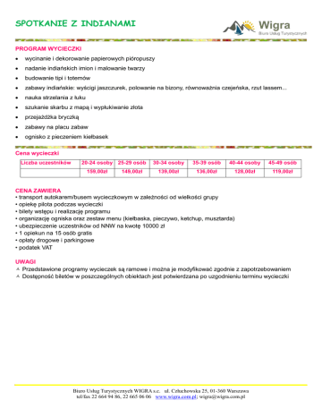 SPOTKANIE Z INDIANAMI PROGRAM WYCIECZKI wycinanie i dekorowanie papierowych pióropuszy nadanie indiańskich imion i malowanie twarzy budowanie tipi i totemów zabawy indiańskie: wyścigi jaszczurek, polowanie na bizony, równoważnia czejeńska, rzut lassem... nauka strzelania z łuku szukanie skarbu z mapą i wypłukiwanie złota przejażdżka bryczką zabawy na placu zabaw ognisko z pieczeniem kiełbasek Cena wycieczki Liczba uczestników 20-24 osoby 25-29 osób 159,00zł 149,00zł 30-34 osoby 35-39 osób 40-44 osoby 45-49 osób 139,00zł 136,00zł 128,00zł 119,00zł CENA ZAWIERA • transport autokarem/busem wycieczkowym w zależności od wielkości grupy • opiekę pilota podczas wycieczki • bilety wstępu i realizację programu • organizację ogniska oraz zestaw menu (kiełbaska, pieczywo, ketchup, musztarda) • ubezpieczenie uczestników od NNW na kwotę 10000 zł • 1 opiekun na 15 osób gratis • opłaty drogowe i parkingowe • podatek VAT UWAGI Przedstawione programy wycieczek są ramowe i można je modyfikować zgodnie z zapotrzebowaniem Dostępność biletów w poszczególnych obiektach jest potwierdzana po uzgodnieniu terminu wycieczki Biuro Usług Turystycznych WIGRA s.c. ul. Człuchowska 25, 01-360 Warszawa tel/fax 22 664 94 86, 22 665 06 06 www.wigra.com.pl; [email protected]