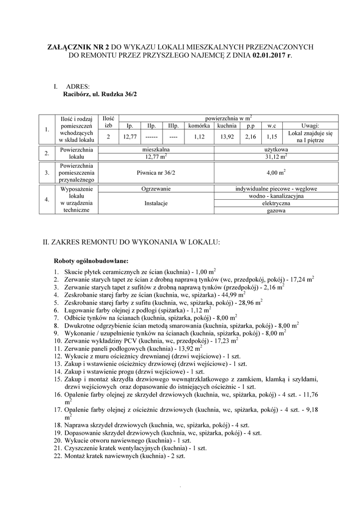 ZAŁĄCZNIK NR 2 DO WYKAZU LOKALI MIESZKALNYCH PRZEZNACZONYCH DO REMONTU PRZEZ PRZYSZŁEGO NAJEMCĘ Z DNIA 02.01.2017 r. I. 1. ADRES: Racibórz, ul. Rudzka 36/2 Ilość i rodzaj pomieszczeń wchodzących w skład lokalu Ilość izb Ip. IIp. IIIp. 2 12,77 ------ ---- powierzchnia w m2 komórka kuchnia p.p 1,12 13,92 2,16 w.c 1,15 Uwagi: Lokal znajduje się na I piętrze 2. Powierzchnia lokalu mieszkalna 12,77 m2 użytkowa 31,12 m2 3. Powierzchnia pomieszczenia przynależnego Piwnica nr 36/2 4,00 m2 Ogrzewanie 4. Wyposażenie lokalu w urządzenia techniczne indywidualne piecowe - węglowe wodno - kanalizacyjna elektryczna gazowa Instalacje II. ZAKRES REMONTU DO WYKONANIA W LOKALU: Roboty ogólnobudowlane: 1. 2. 3. 4. 5. 6. 7. 8. 9. 10. 11. 12. 13. 14. 15. 16. 17. 18. 19. 20. 21. 22. Skucie płytek ceramicznych ze ścian (kuchnia) - 1,00 m2 Zerwanie starych tapet ze ścian z drobną naprawą tynków (wc, przedpokój, pokój) - 17,24 m2 Zerwanie starych tapet z sufitów z drobną naprawą tynków (przedpokój) - 2,16 m2 Zeskrobanie starej farby ze ścian (kuchnia, wc, spiżarka) - 44,99 m2 Zeskrobanie starej farby z sufitu (kuchnia, wc, spiżarka, pokój) - 28,96 m2 Ługowanie farby olejnej z podłogi (spiżarka) - 1,12 m2 Odbicie tynków na ścianach (kuchnia, spiżarka, pokój) - 8,00 m2 Dwukrotne odgrzybienie ścian metodą smarowania (kuchnia, spiżarka, pokój) - 8,00 m2 Wykonanie / uzupełnienie tynków na ścianach (kuchnia, spiżarka, pokój) - 8,00 m2 Zerwanie wykładziny PCV (kuchnia, wc, przedpokój) - 17,23 m2 Zerwanie paneli podłogowych (kuchnia) - 13,92 m2 Wykucie z muru ościeżnicy drewnianej (drzwi wejściowe) - 1 szt. Zakup i wstawienie ościeżnicy drzwiowej (drzwi wejściowe) - 1 szt. Zakup i wstawienie progu (drzwi wejściowe) - 1 szt. Zakup i montaż skrzydła drzwiowego wewnątrzklatkowego z zamkiem, klamką i szyldami, drzwi wejściowych oraz dopasowanie do istniejących ościeżnic - 1 szt. Opalenie farby olejnej ze skrzydeł drzwiowych (kuchnia, wc, spiżarka, pokój) - 4 szt. - 11,76 m2 Opalenie farby olejnej z ościeżnic drzwiowych (kuchnia, wc, spiżarka, pokój) - 4 szt. - 9,18 m2 Naprawa skrzydeł drzwiowych (kuchnia, wc, spiżarka, pokój) - 4 szt. Dopasowanie skrzydeł drzwiowych (kuchnia, wc, spiżarka, pokój) - 4 szt. Wykucie otworu nawiewnego (kuchnia) - 1 szt. Czyszczenie kratek wentylacyjnych (kuchnia) - 1 szt. Montaż kratek nawiewnych (kuchnia) - 2 szt. . 23. 24. 25. 26. 27. 28. 29. 30. 31. 32. 33. 34. 35. 36. 37. 38. 39. 40. 41. 42. 43. 44. 45. 46. 47. 48. Opalenie farby olejnej ze stolarki okiennej (kuchnia, spiżarka, pokój) - 3 szt. - 11,09 m2 Opalenie parapetów okiennych wewnętrznych (kuchnia, spiżarka, pokój) - 3 szt. - 0,92 m2 Naprawa skrzydeł okiennych (kuchnia, spiżarka, pokój) - 26 szt. Dopasowanie skrzydeł okiennych (kuchnia, spiżarka, pokój) - 26 szt. Szklenie ram drewnianych skrzydeł okiennych (kuchnia, pokój) - 1,62 m2 - 9 szt. Kasowanie zacieków na ścianach i sufitach (kuchnia, wc) - 3,10 m2 Przygotowanie powierzchni ścian pod malowanie farbami emulsyjnymi starych tynków z poszpachlowaniem nierówności (kuchnia, wc, przedpokój, spiżarka, pokój) - 111,71 m2 Przygotowanie powierzchni sufitów pod malowanie farbami emulsyjnymi starych tynków z poszpachlowaniem nierówności (kuchnia, wc, przedpokój, spiżarka, pokój) - 32,27 m2 Dwukrotne malowanie emulsyjne sufitów (kuchnia, wc, przedpokój, spiżarka, pokój) - 32,27 m2 Dwukrotne malowanie emulsyjne ścian (kuchnia, wc, przedpokój, spiżarka, pokój) - 90,82 m2 Dwukrotne malowanie olejne lamperii z dwukrotnym szpachlowaniem (kuchnia - za osprzętem kuchennym, wc) - 20,90 m2 Dwukrotne malowanie olejne ościeżnic drzwiowych (drzwi wejściowe, kuchnia, wc, spiżarka, pokój) – 5 szt. - 10,40 m2 Dwukrotne malowanie olejne skrzydeł drzwiowych (kuchnia, wc, spiżarka, pokój) - 4 szt. 11,76 m2 Dwukrotne malowanie stolarki okiennej - 3 szt. - 11,09 m2 Dwukrotne malowanie parapetów okiennych - 3 szt. - 0,92 m2 Dwukrotne malowanie farbą olejną rur instalacji wodnej - 3,85 mb Dwukrotne malowanie farbą olejną rur instalacji gazowej - 3,03 mb Naprawa cokołu betonowego (spiżarka) - 6,10 mb Przygotowanie pod malowanie farbą olejną posadzki betonowej (wc, spiżarka) - 2,27 m2 Malowanie farbą olejną posadzki betonowej (wc, spiżarka) - 2,27 m2 Przygotowanie podłóg drewnianych do malowania (kuchnia, przedpokój, pokój) - 28,85 m2 Przygotowanie cokołów drewnianych do malowania (kuchnia, przedpokój, pokój) - 31,16 mb Malowanie farbą olejną podłóg drewnianych do malowania (kuchnia, przedpokój, pokój) 28,85 m2 Malowanie farbą olejną cokołów drewnianych do malowania (kuchnia, przedpokój, pokój) 31,16 mb Zakup i wymiana klamki z szyldami w skrzydłach drzwiowych (kuchnia, wc, spiżarka, pokój) - 4 szt. Białkowanie ścian i sufitów (piwnica) - 19,49 m2 III. TERMIN WYKONANIA REMONTU: 2 miesiące IV. WARUNKI FINANSOWE: 1. Remontujący wykona remont lokalu we własnym zakresie na własny koszt, a po zakończeniu najmu zobowiązany będzie do zdania lokalu mieszkalnego w stanie nie pogorszonym od stanu określonego w protokole przekazania lokalu. 2. Remontujący nie jest zobowiązany do uiszczenia kaucji mieszkaniowej. 3. W okresie wykonywania remontu Remontujący, z którym zostanie zawarta umowa najmu lokalu nie uiszcza czynszu, zobowiązany będzie wyłącznie do uiszczania opłat niezależnych od Wynajmującego z tytułu: a) gospodarowania odpadami komunalnymi, b) za dostawę do lokalu energii elektrycznej, c) za dostawę do lokalu energii cieplnej, . d) za dostawę do lokalu gazu, e) za dostawę do lokalu wody oraz odbiór ścieków. 4. Remontujący zawrze umowę z: a) Zakładem Energetycznym na dostarczanie energii elektrycznej b) Zakładem Wodociągów i Kanalizacji Sp. z oho. w Raciborzu umowę na dostarczenie i rozliczenie wody oraz odprowadzenie ścieków, c) Zakładem Gazowniczym na dostarczanie gazu 5. W razie rezygnacji z lokalu w czasie w