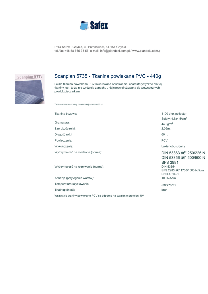 PHU Safex - Gdynia, ul. Potasowa 6, 81-154 Gdynia tel./fax +48 58 665 33 56, e-mail: [email protected] / www.plandeki.com.pl Scanplan 5735 - Tkanina powlekana PVC - 440g Lekka tkanina powlekana PCV lakierowana obustronnie, charakterystyczne dla tej tkaniny jest to że nie wydziela zapachu . Najczęsciej używana do wewnętrznych powłok pieczarkarni. Tabela techniczna tkaniny plandekowej Scanplan 5735: Tkanina bazowa: 1100 dtex poliester Sploty: 4,5x4,5/cm2 Gramatura: 440 g/m2 Szerokość rolki: 2,05m. Długość rolki: 60m. Powleczenie: PCV Wykończenie: Lakier obustronny Wytrzymałość na rozdarcie (norma): DIN 53363 – 250/225 N DIN 53356 – 500/500 N SFS 3981 Wytrzymałość na rozrywanie (norma): Adhezja (przyleganie warstw): DIN 53354 SFS 2983 – 1700/1500 N/5cm EN ISO 1421 100 N/5cm Temperatura użytkowania: -30/+70 oC Trudnopalność: brak Wszystkie tkaniny powlekane PCV są odporne na działanie promieni UV